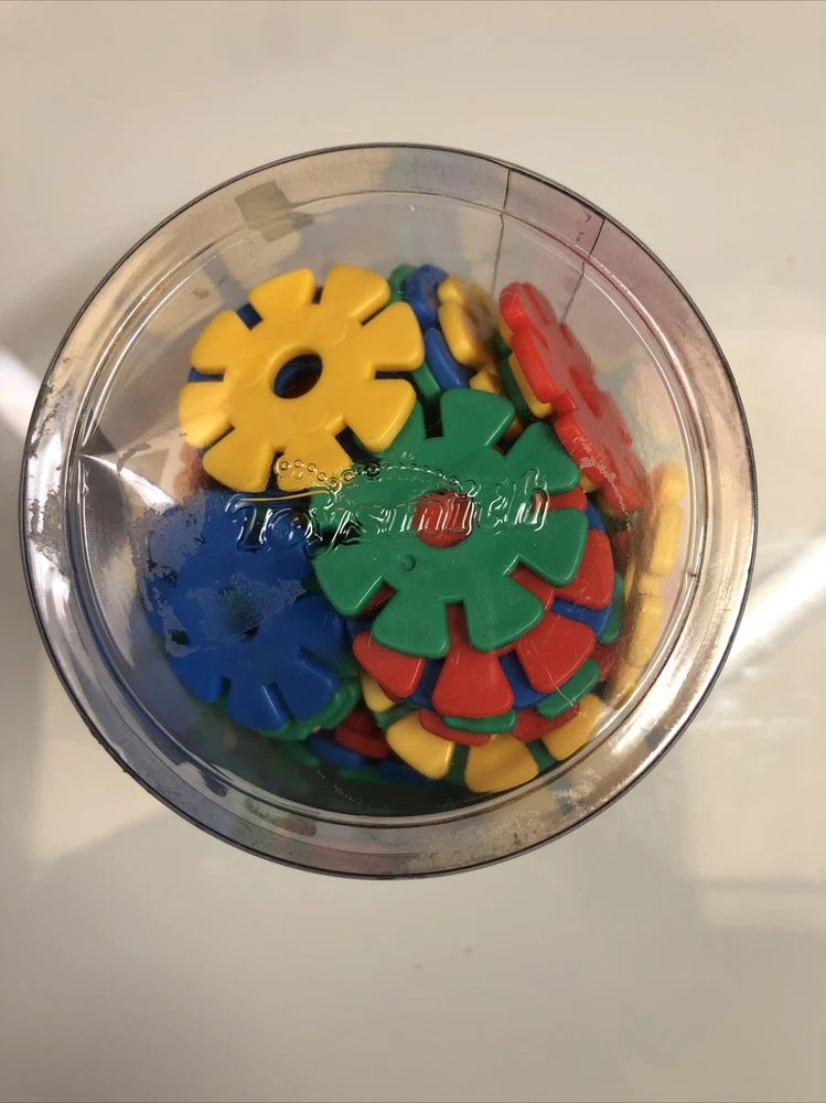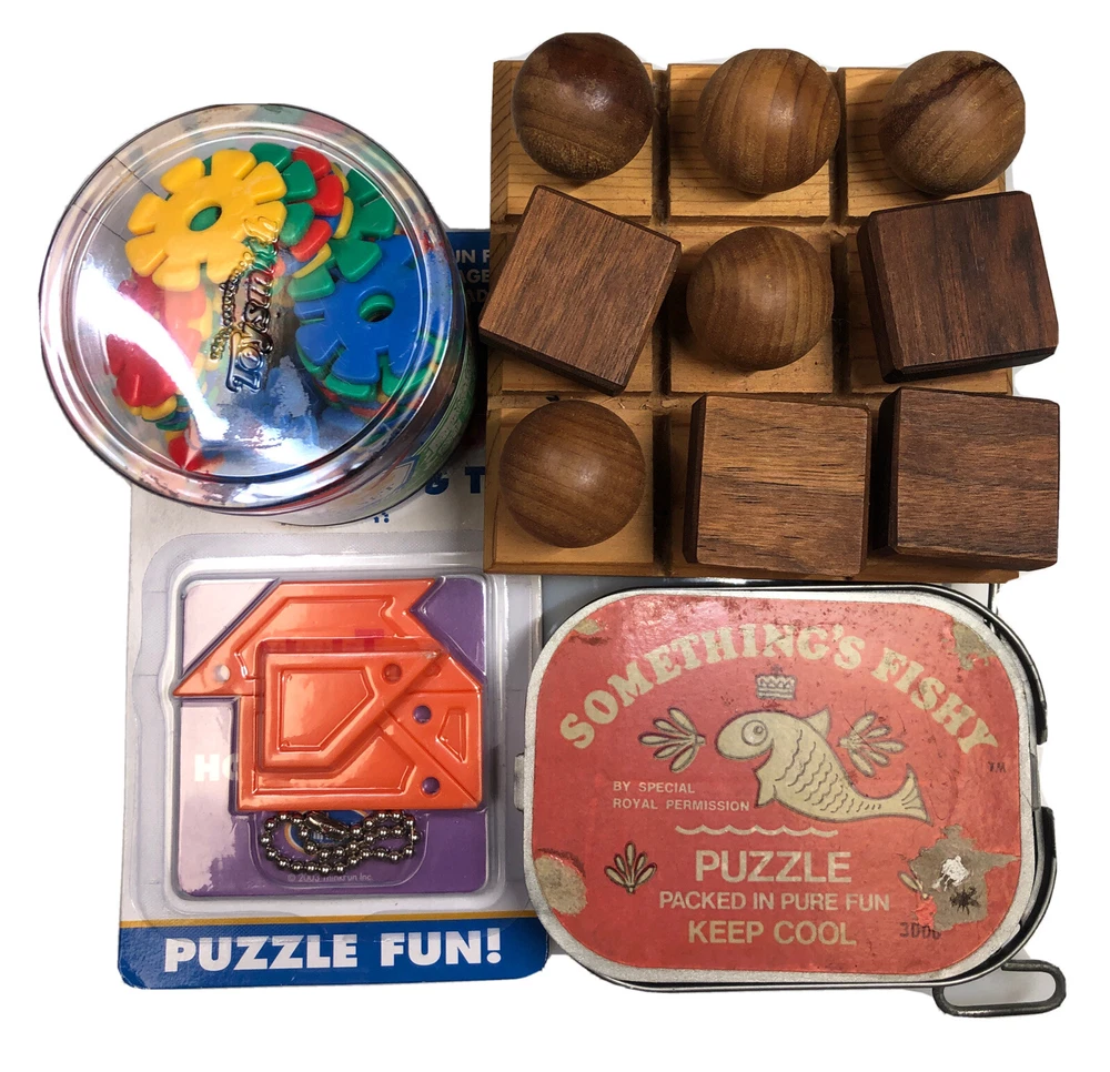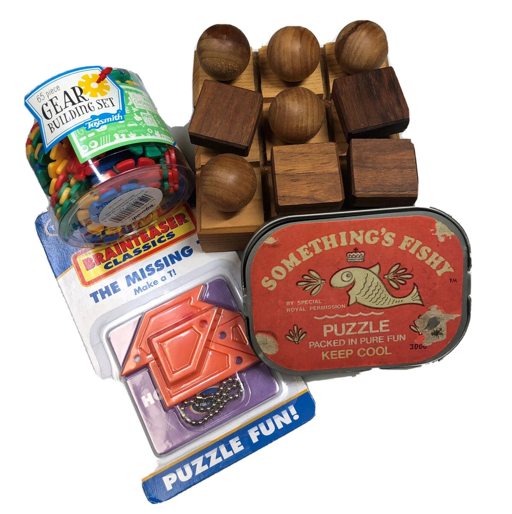 Puzzle Games and Gears: Something’s Fishy, Wood Tic-Tac-Toe, The Missing T Make a T & 65 piece Gear Set. The most vintage Something’s Fishy 1971 is by Hasbro and has some damage to the graphics on front. It’s complete with all parts and instruction sheet. The Tic-Tac-Toe game is solid wood and marked on back by Market Toymaker 1981. The missing T Make a T Puzzle s made by Think Fun Inc in 2003 and is new in packaging. The 65 piece Gear Building set is by Toysmith 2015. Please see pictures to complete description. Thank you for shopping Missy’s Sourcing.