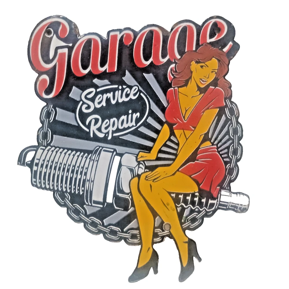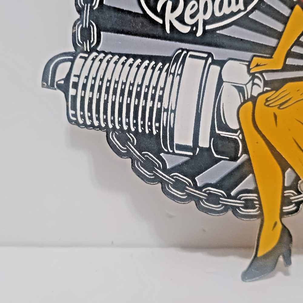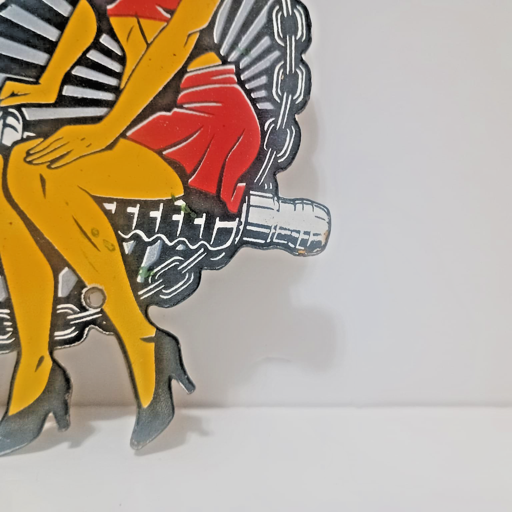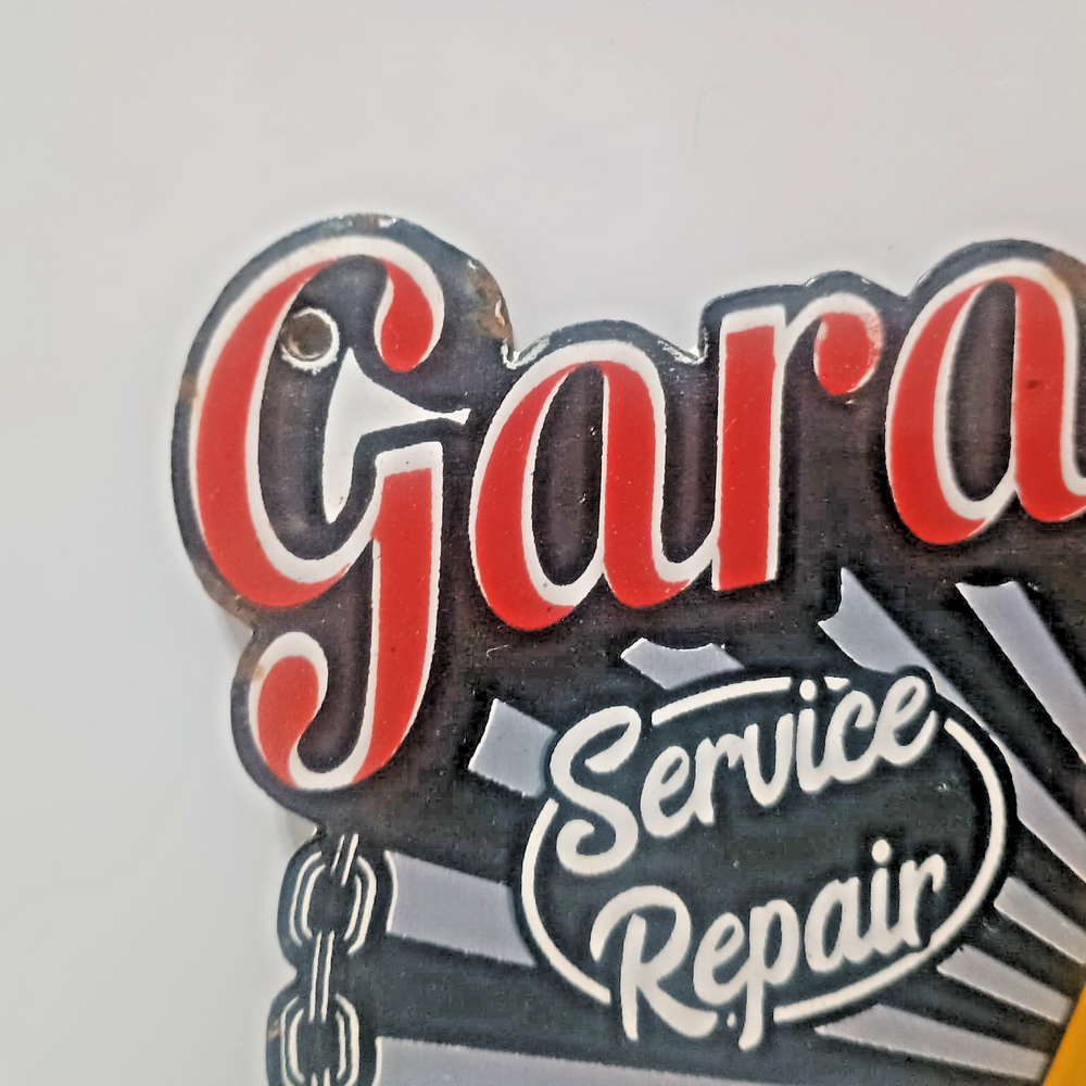 This vintage garage service repair auto car bike porcelain enamel sign measures 7" x 6" inches and features a multi-color design from the 1950s-1960s. Made in the United States, this original sign is a collectible piece of gas & oil advertising memorabilia. Perfect for vintage vehicle enthusiasts or collectors of unique signs, this piece exudes a nostalgic charm and historical significance.