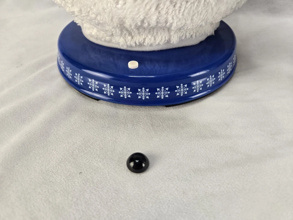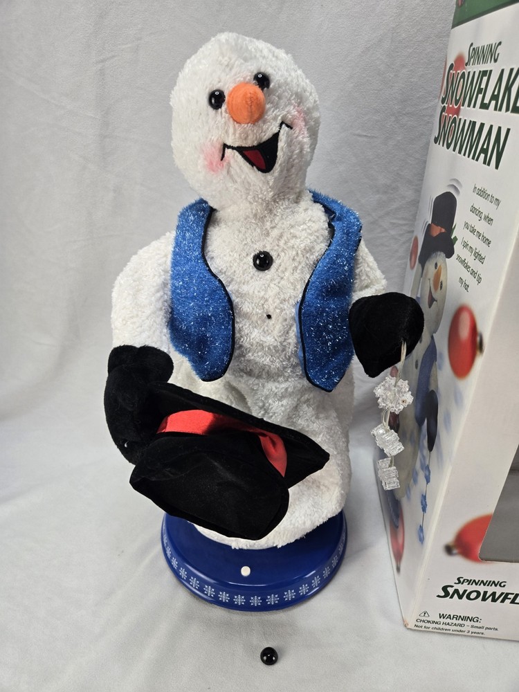 The snowman does not move his arms. Audio, light up snowflakes, and hip swing works as it should. Box and figure is in good shape. Again arms do not move on either side however the arm with snowflakes tries to spin the strand. The snowman's lower button has fallen off, but it still is included if you wanted to repair it.