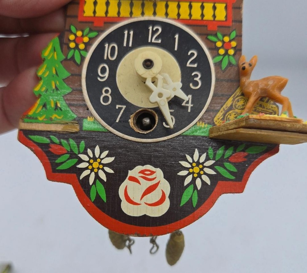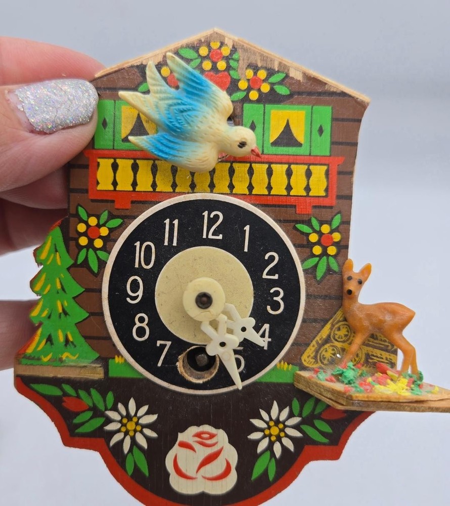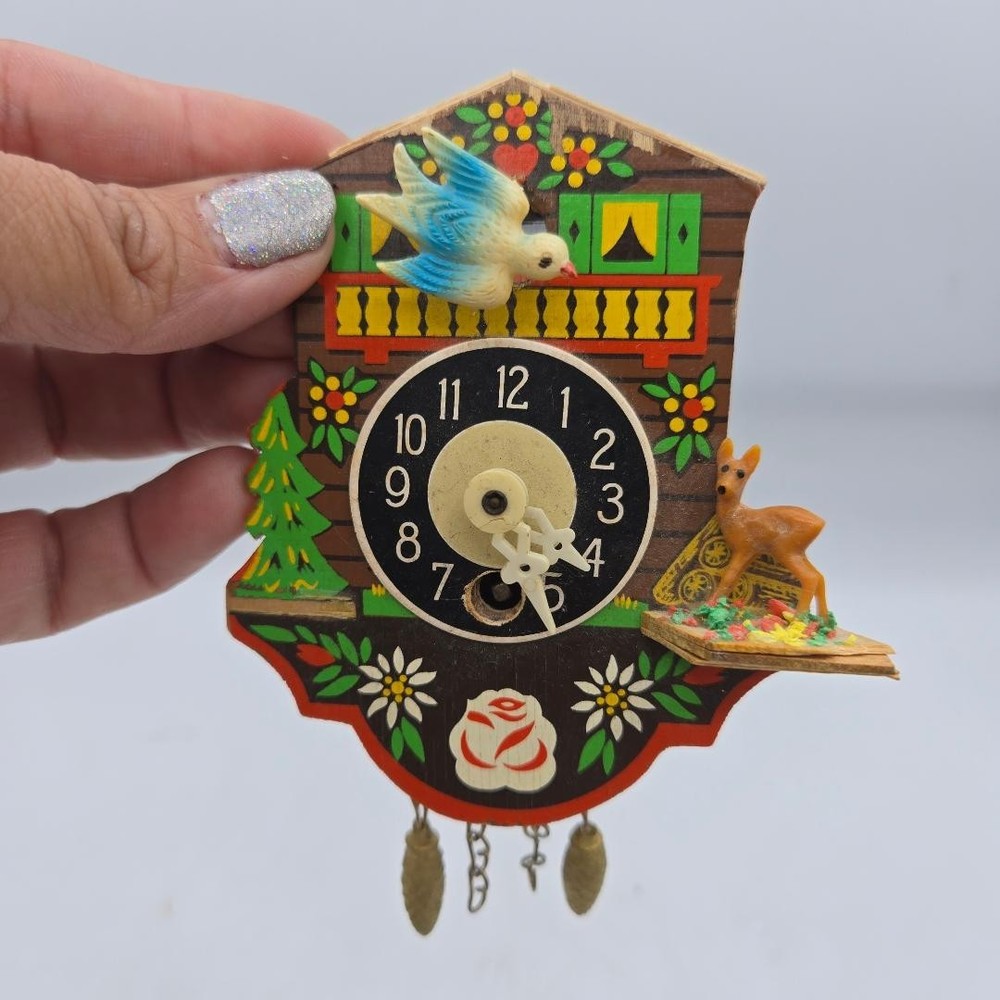 This vintage Germany Mini German Black Forest Chalet Clock features a mechanical movement powered by a spring. The clock is made of wood and plastic, with a multicolor painted finish in the Black Forest style. The design includes a chalet with a bird theme, making it a charming decorative collectible item measuring 5 inches in height. Made in Germany, this clock is a unique piece that blends traditional craftsmanship with modern design elements. READ- Clock is ONLY for parts, NOT working/tested. F-Garage