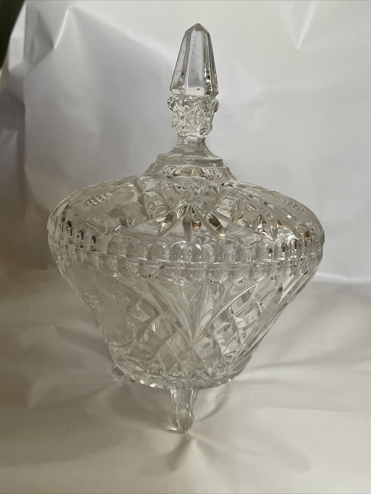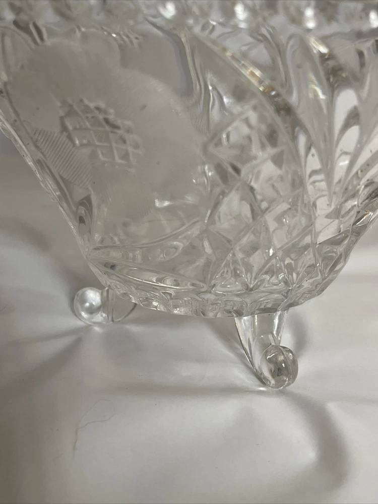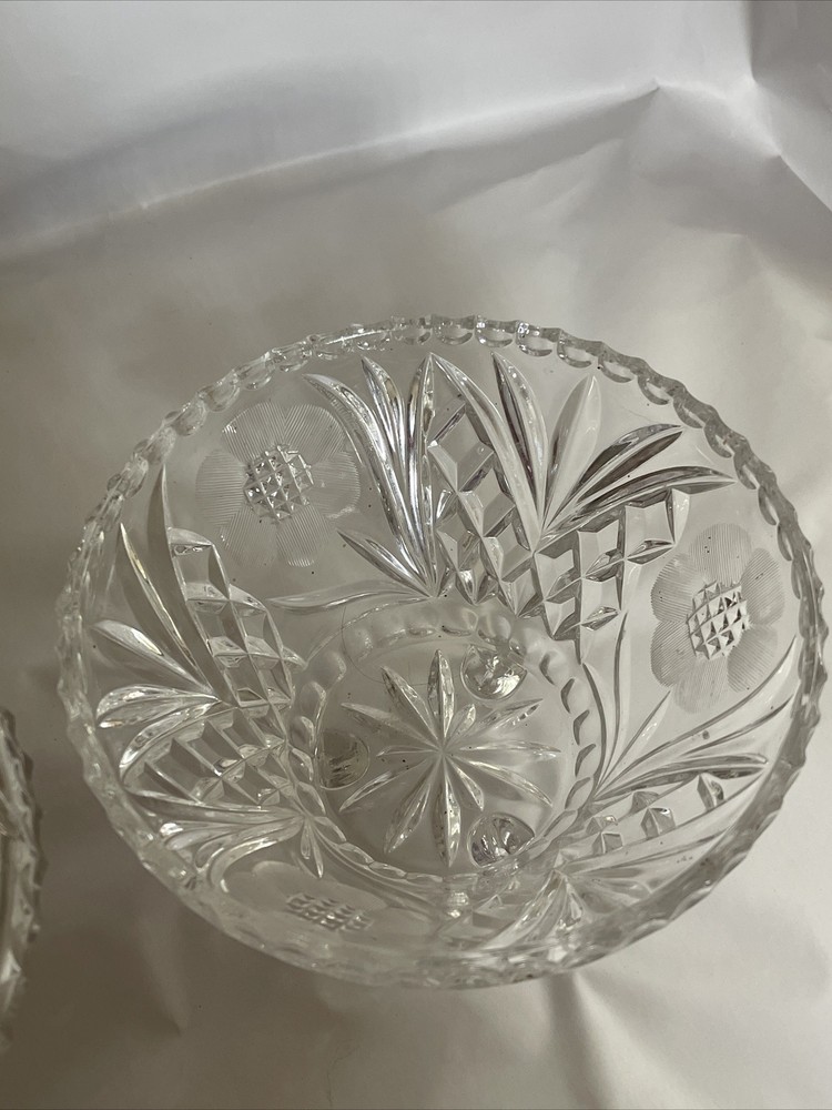 This exquisite candy dish is a genuine lead crystal piece, crafted in West Germany by skilled artisans. The round, clear glass dish measures 6.5 inches in diameter and stands 9 inches tall on its footed base. The intricate cut glass design features a beautiful flower theme, making it a stunning decorative piece that is sure to impress. This candy dish is a vintage original piece, handcrafted with precision and care. It has a single compartment and is lightweight, weighing only 3 pounds and 1 ounce. While it is perfect for serving candies or other small treats, it can also be used as a beautiful centerpiece or decorative item in any home.