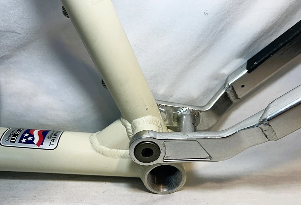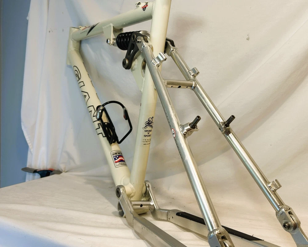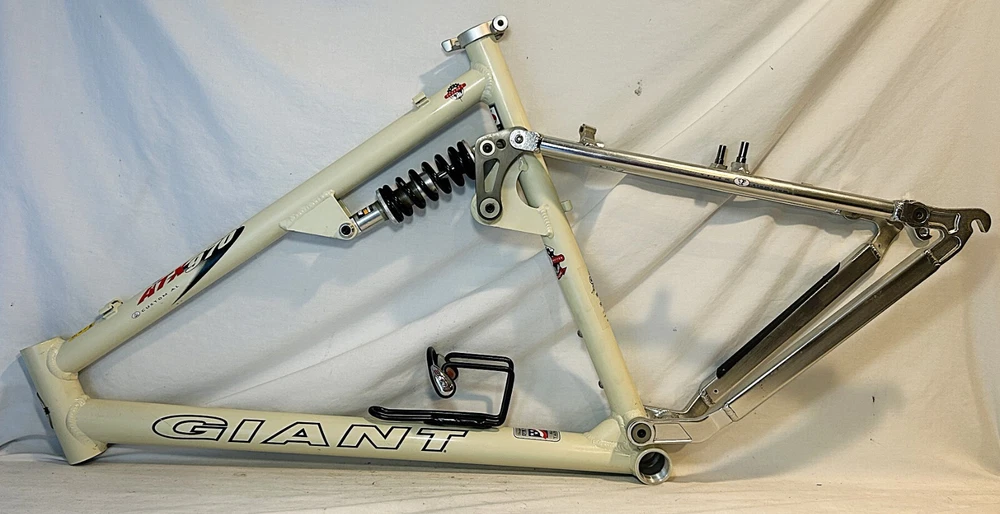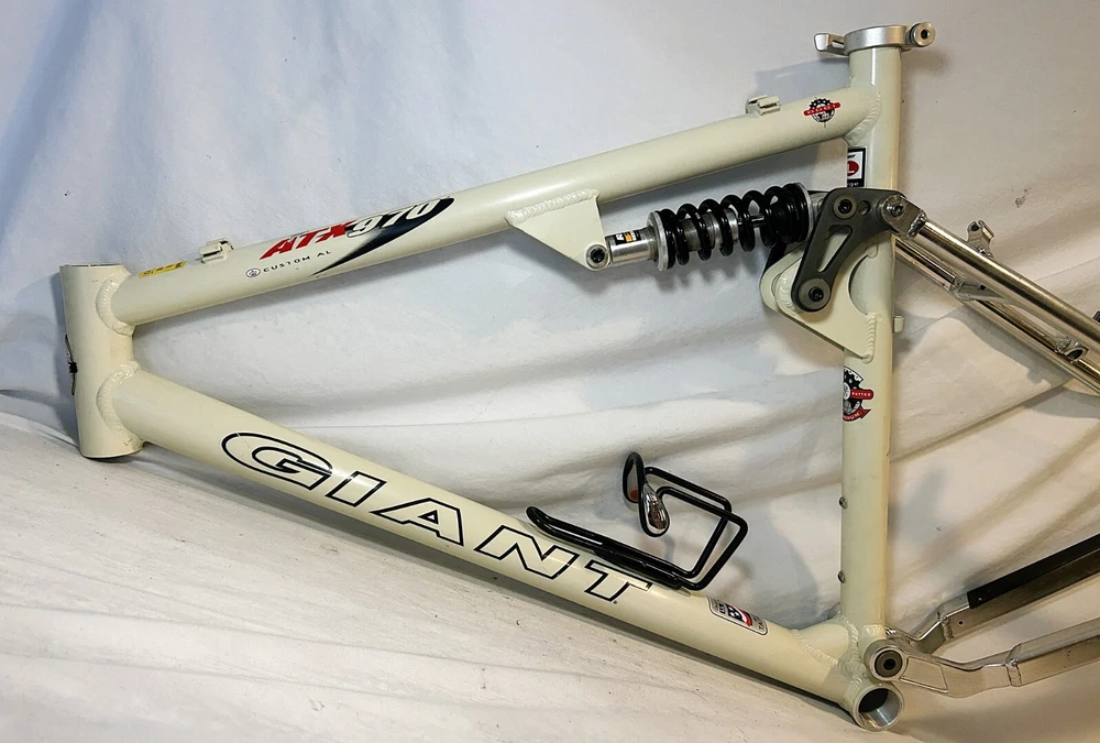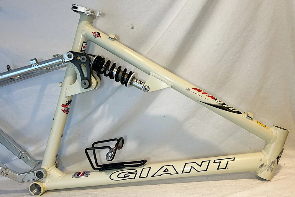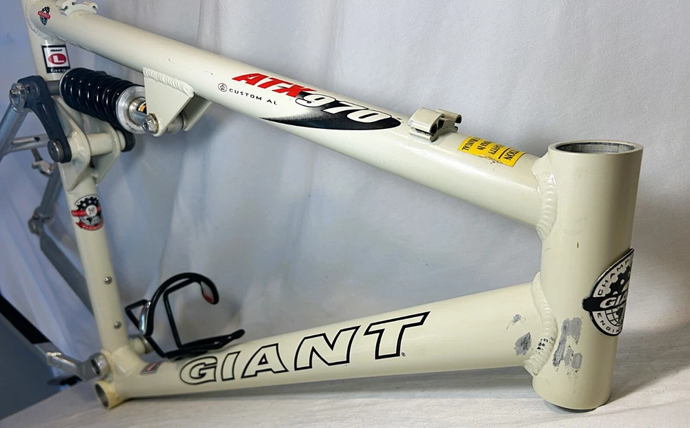 Vintage Giant ATX 970 full suspension aluminum Mountain Bike frame Vintage 90's full suspension mtb frame. This frame takes 26" wheels and was running cantilever brakes. This is labeled as a Large frame - see measurements below. In good condition but still is a used item that shows some wear that may include chips, scratches, cable rub, and other defects associated with a 25-30 year old bike. Please view all pics for an accurate representation. Approximate Measurements : Center to top of top tube : 19" Center to top of seat tube : 20.5" Top tube length: 23" Head tube length: 135mm Head tube diameter: 1.125 (1 & 1/8") Rear Spacing: 135mm Seat post size: 30.8 Weight: 7 lbs. 4 oz. IMPORTANT: Please read this description and thoroughly view all pictures before bidding. Please ask questions if needed. International Shipping will be handled by Ebays Global Shipping Program so fees will apply. I have no control or access to view these fees...all handled by EGSP. I will gladly leave Positive Feedback upon receiving it. Thank You and Have an Awesome Day !