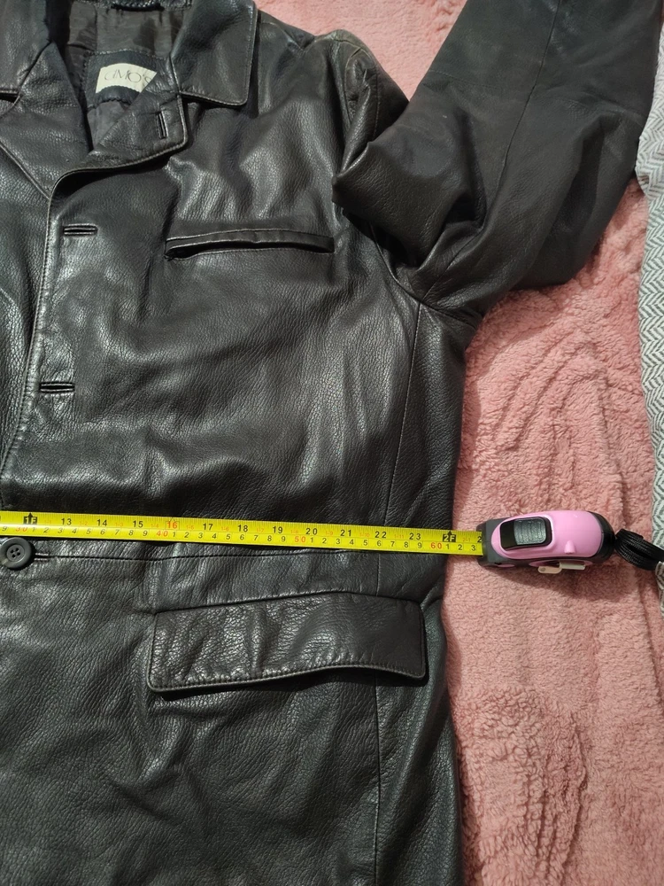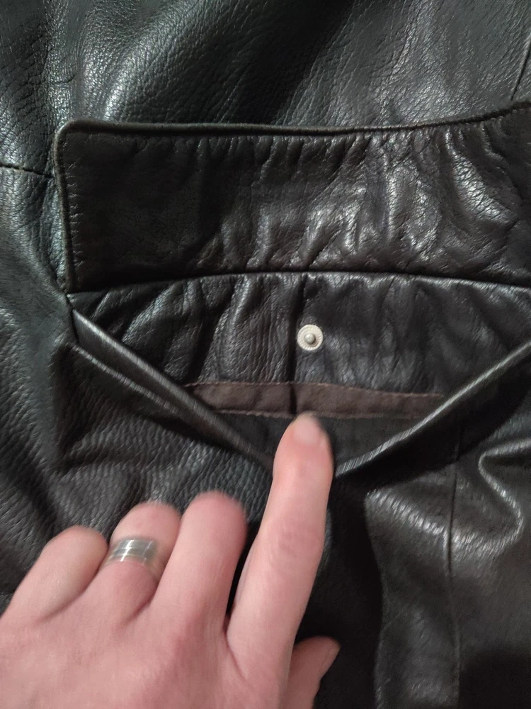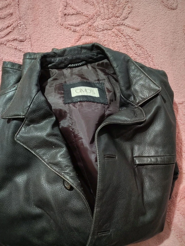 THIS JACKET IS AN OVERALL GOOD CONDITION THERE IS A IMPERFECTION OR TWO IN THE LEATHER THAT I TRIED TO TAKE A PICTURE OF, PLEASE SEE PHOTOS OVERALL GOOD CONDITION. NOT SURE IF IT IS MISSING A BUTTON OR NOT? The Vintage Gimo's Leather Jacket in size Large is a classic piece made in Italy. The dark brown color and leather outer shell give it a timeless and designer appeal. This heavy coat style jacket features a zip and button closure, lined interior, collared neckline, and pockets for added functionality. Made with high-quality viscose lining material, this jacket is perfect for a dry clean only to maintain its authenticity and sophistication. Ideal for men looking for a rugged yet stylish addition to their wardrobe.