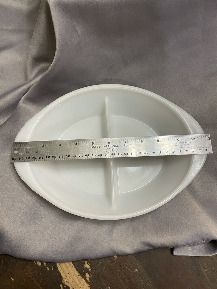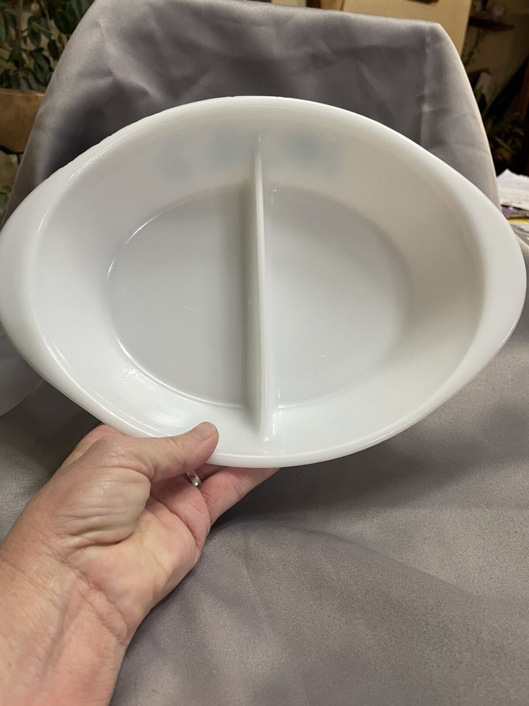 Country of Origin:United StatesMaterial:GlassNumber of Compartments:2Production Style:Milk GlassPattern:FloralType:Casserole DishShape:OvalTheme:FlowerColor:BlueProduct Line:Blue ThistleBrand:GlasbakeVintage:Yes