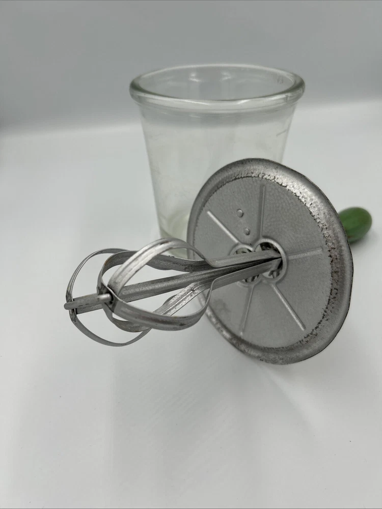 This vintage hand crank egg beater features a clear glass jar with a ribbed pattern, a metal lid with exposed gear mechanism, and a green handle knob. Designed for manual mixing, it reflects classic early kitchenware craftsmanship and makes a great collectible, display piece, or rustic farmhouse décor item. The item is undated, with no visible manufacturer markings or stamped year. The mechanical components appear intact, and the piece shows age-related wear consistent with vintage kitchen tools. Item comes as is. Please review photos before purchase and feel free to ask any questions. Condition Used. Shows visible wear consistent with age, including surface patina and discoloration on metal components. Glass jar appears intact with no major cracks noted. Specifications Item Type: Hand Crank Egg Beater / Mixer Era: Vintage (undated) Material: Glass jar, metal lid and mechanism Handle: Green handle knob Pattern: Ribbed glass Operation: Manual hand crank Features Manual crank-operated mixing mechanism Ribbed glass jar design Exposed metal gear assembly Classic vintage kitchen aesthetic Suitable for display or collection Shipping Ships within 2 business days Carefully packaged Tracking uploaded promptly Smoke-free storage environment Notes Undated vintage item. Surface wear and patina present on metal components. No maker’s marks or production date observed.