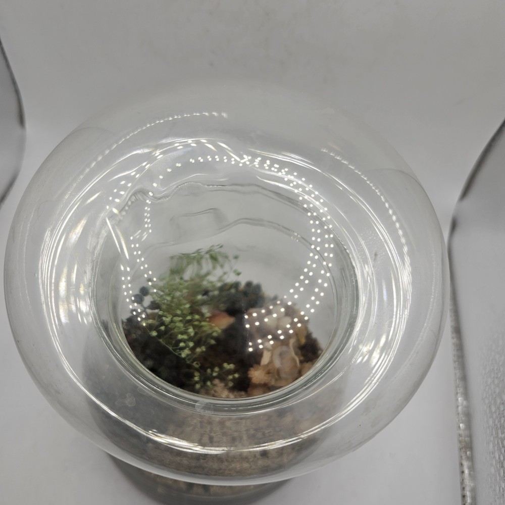This vintage collectible is a glass mushroom adorned with woodland terrarium deer and flowers. The mushroom is made of multi-color glass and features intricate detailing. Perfect for adding a whimsical touch to any decorative display. The jar has a lid. See photos for wear