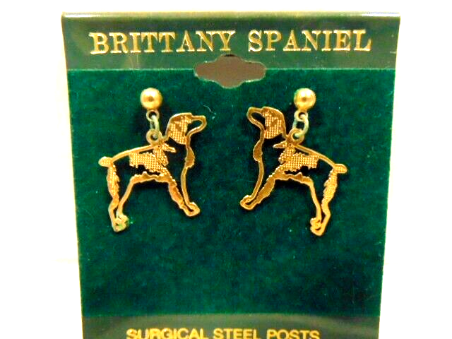 Here is an " old store stock" gold color pair of Brittany Spaniel dog shaped earrings. They are unused and were purchased from a business that closed. They are about 7/8th inches wide. The display card is about 2 1/2 X 2 3/4 inches. Please see pictures and ask any questions . Thank you for looking. (Inv 28,6 )