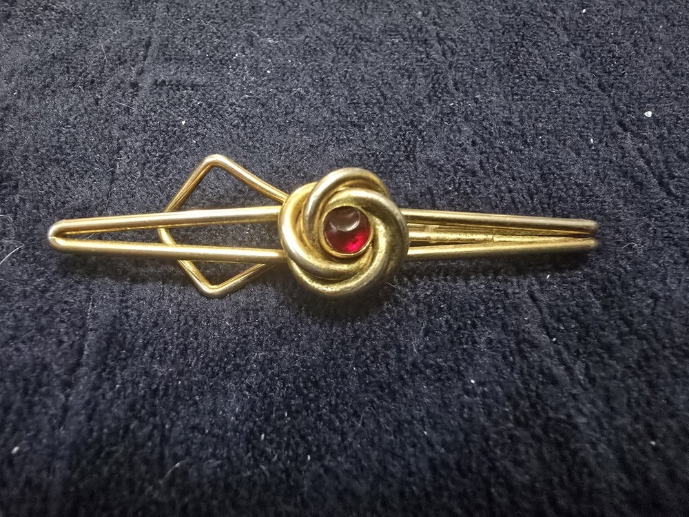 The Vintage Swank Love Knot Tie Bar features a red cabochon stone set in yellow gold filled metal, making it a stylish accessory for all occasions, especially Valentine's Day. This retro piece from the 1935-1950 era exudes a vintage charm with its knot shape and Art Deco style. Signed by Swank, this tie bar showcases a unique design that is perfect for men looking to add a touch of classic sophistication to their outfit. Made in the United States, this vintage tie bar is a timeless piece that will elevate any formal ensemble. sold as is - well loved