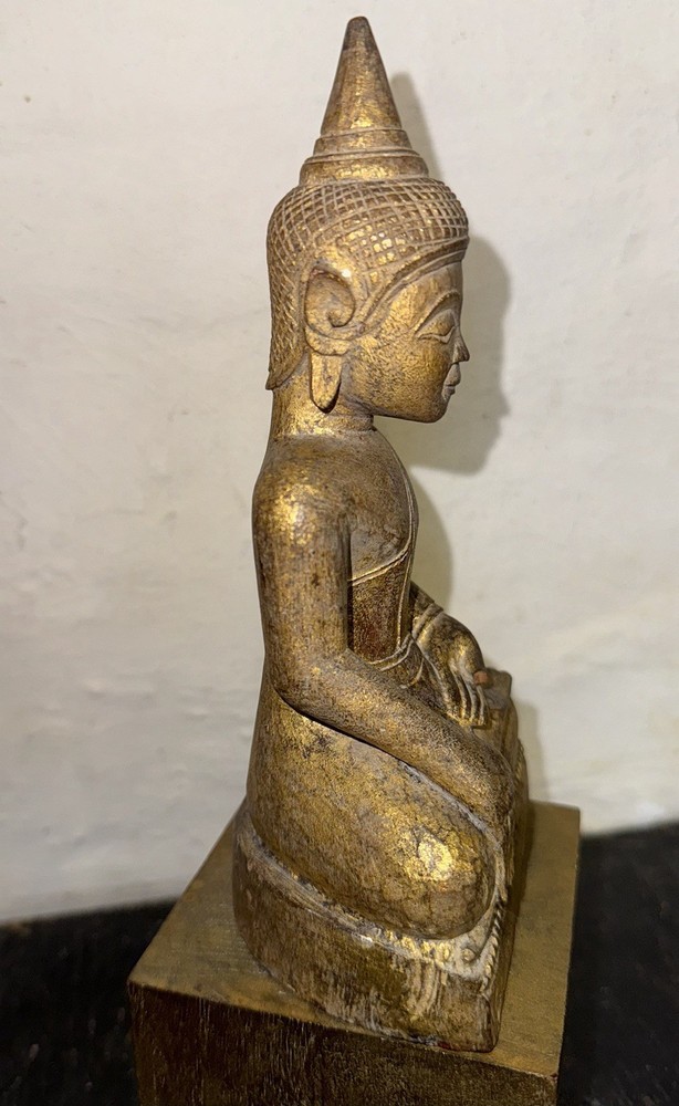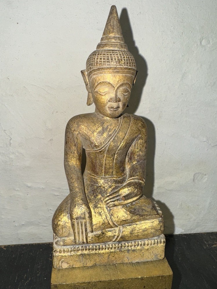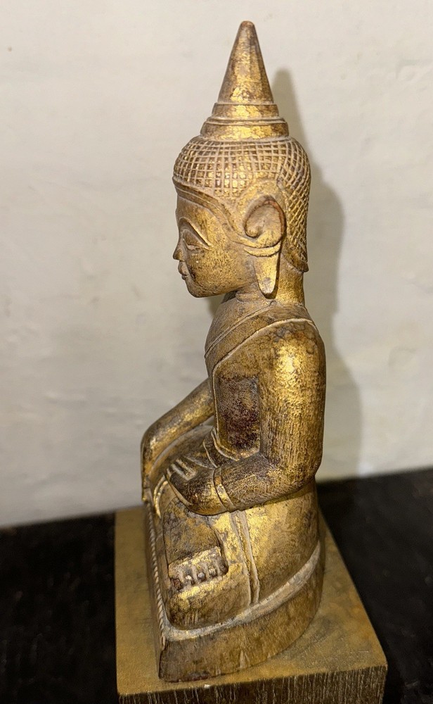 Vintage Gold Painted Hand Carved Buddha In Wood Sitrimg On Base. Guess it was made around 1930. Maybe earlier. In good condition. No damages or repairs. Figure With wonderful patina. Measures: 30,5 cm high (included base and figure). SHIPPING OUTSIDE EUROPE: SHIPPING WITH DHL GLOBAL MAIL. INCLUDED TRACK & TRACE. FULLY INSURED. SHIPPING WITHIN EUROPE: SHIPPING WITH GLS. PRICE FROM 20-30 US DOLLARS. INCLUDED T&T. FULLY INSURED. Satisfaction or your Money back gurantee.