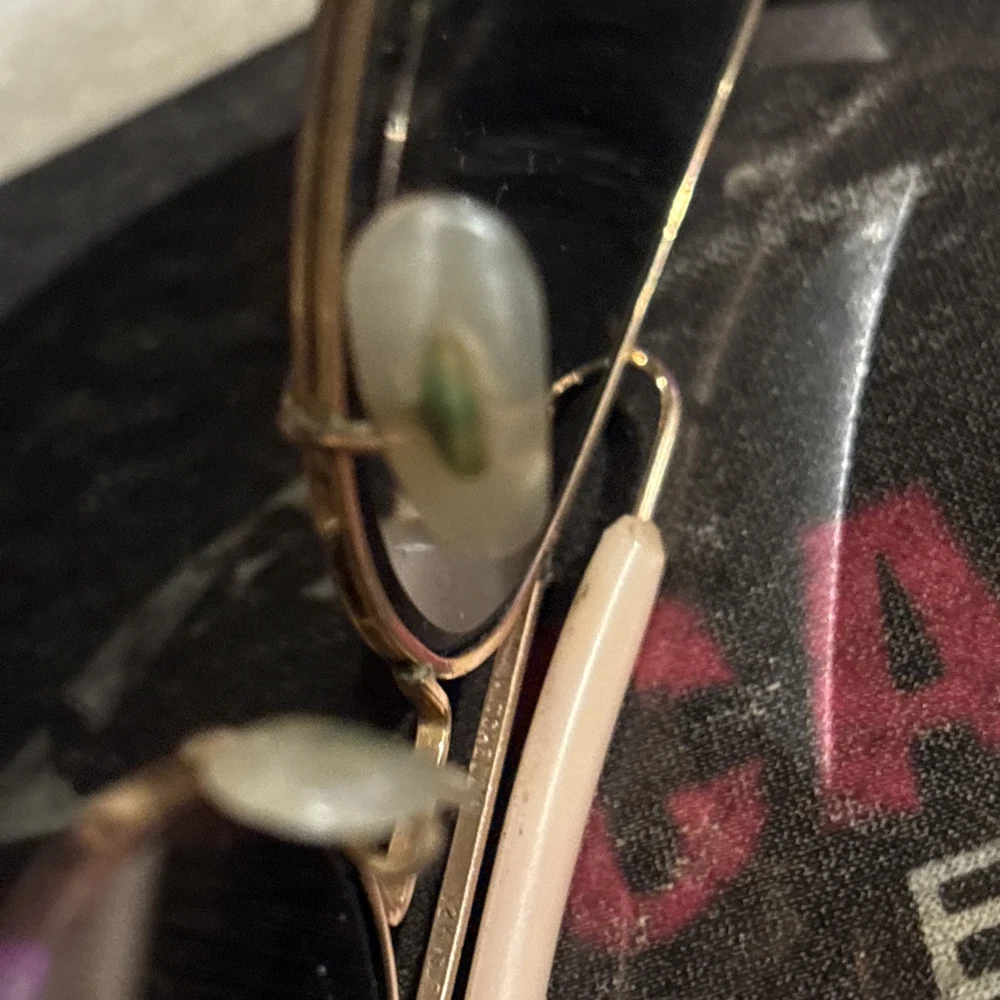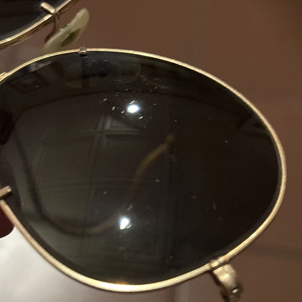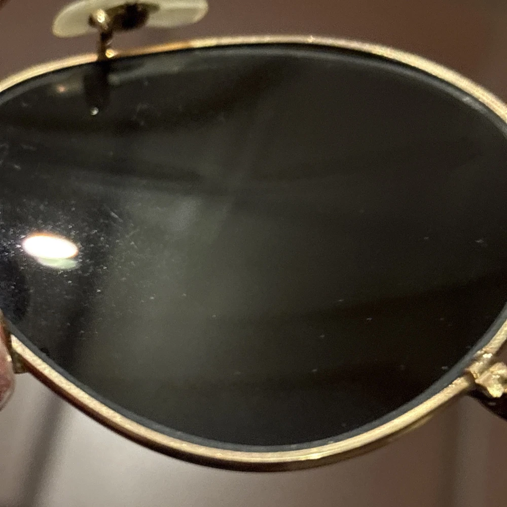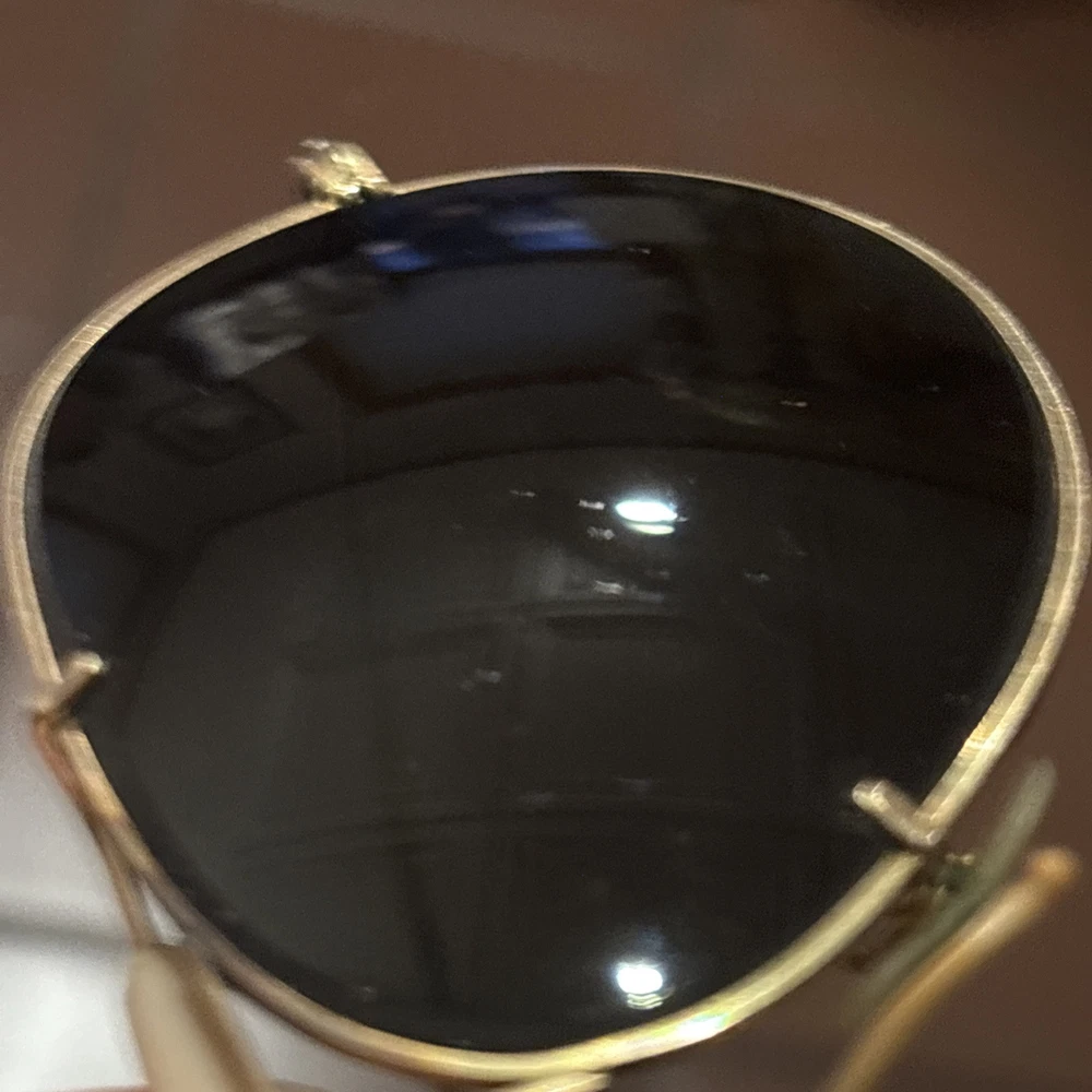 Real aviators , 12K gold plated, donβt know brand or lensβs type. Got them decades ago from my uncle who was in Air Force back in the early 50βs . The only thing stamped on rims is 12k gold . Lenses are clear, no scratches!