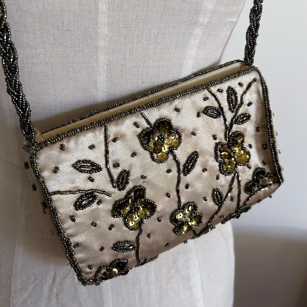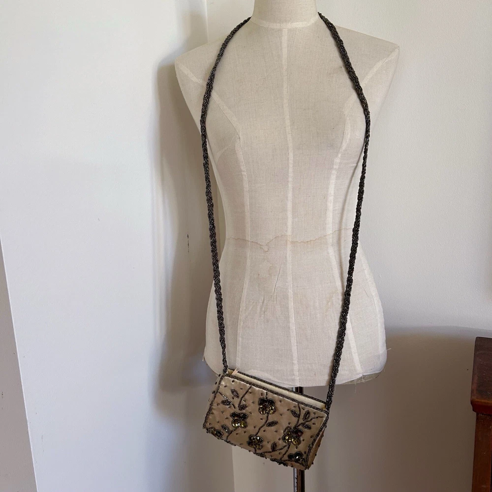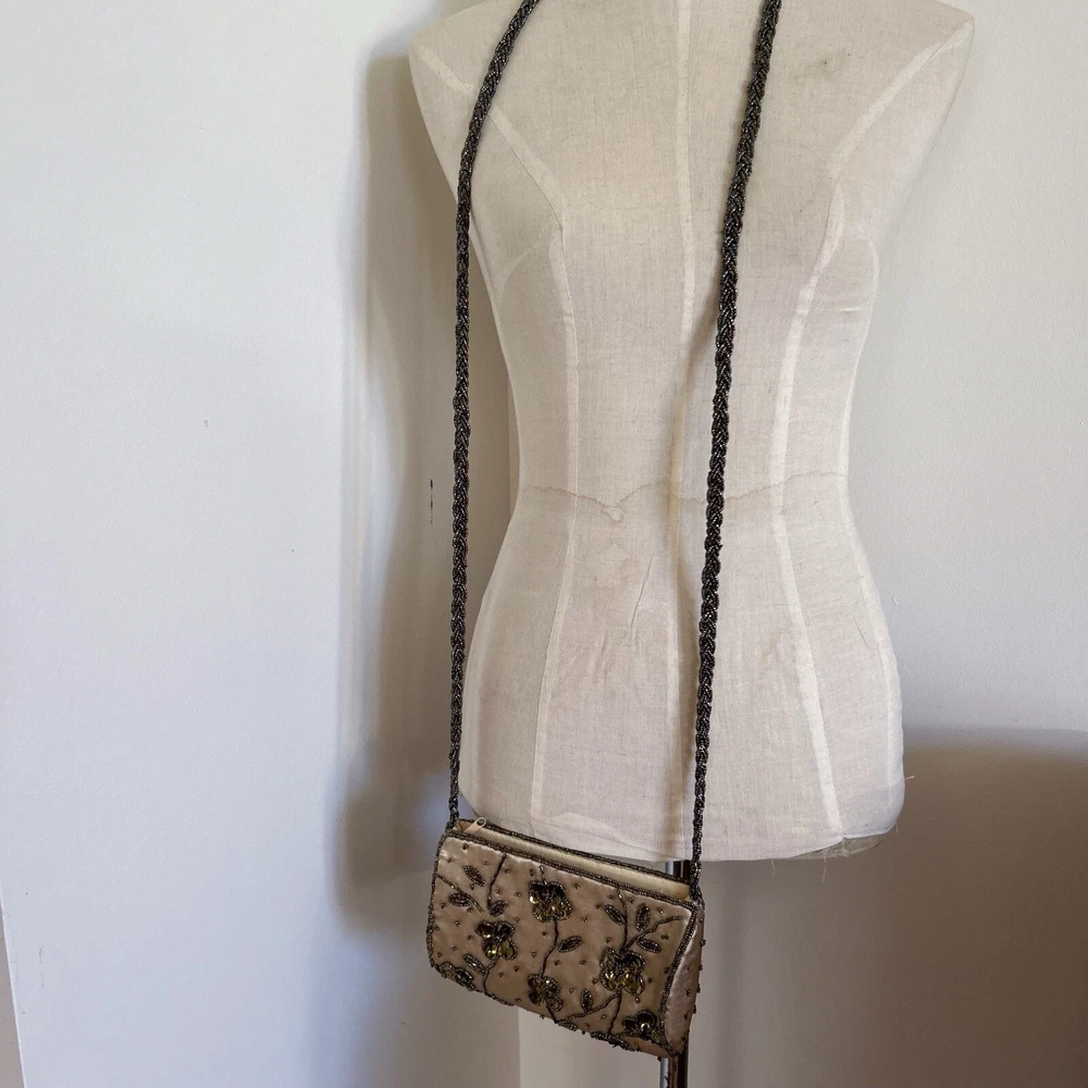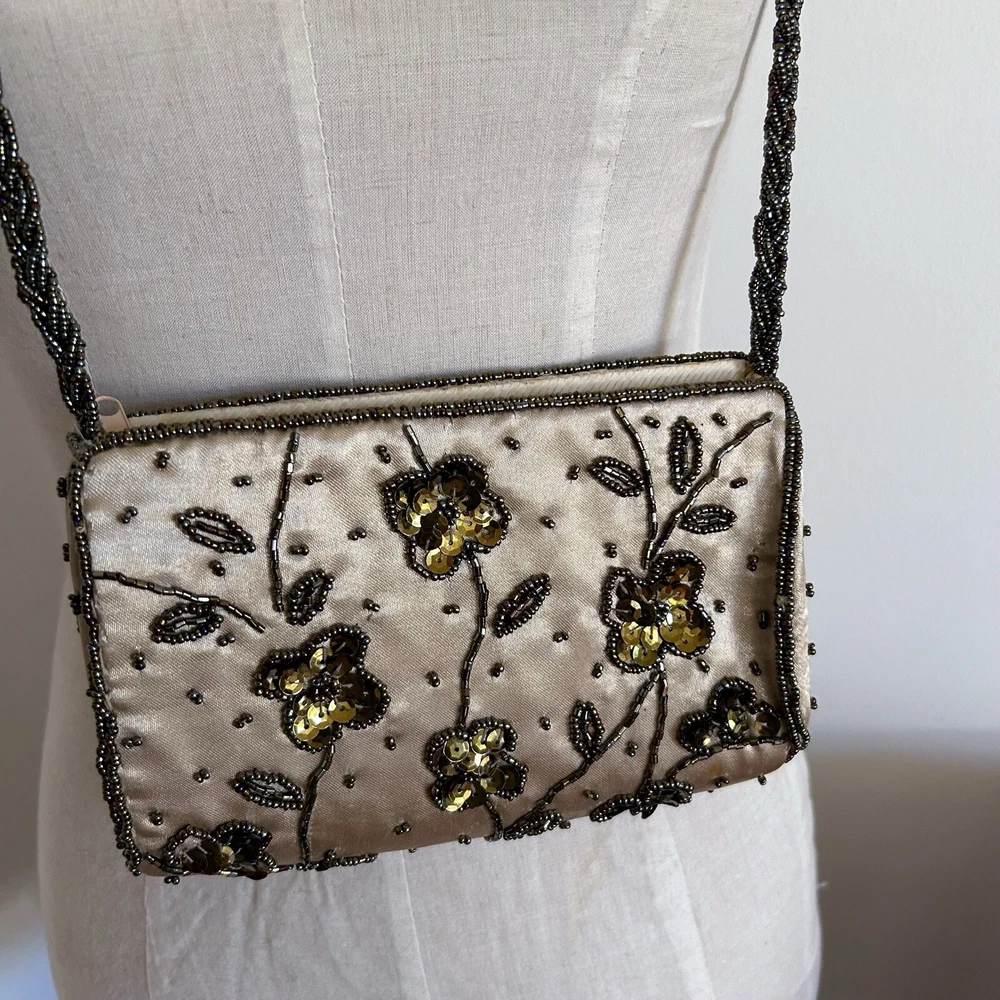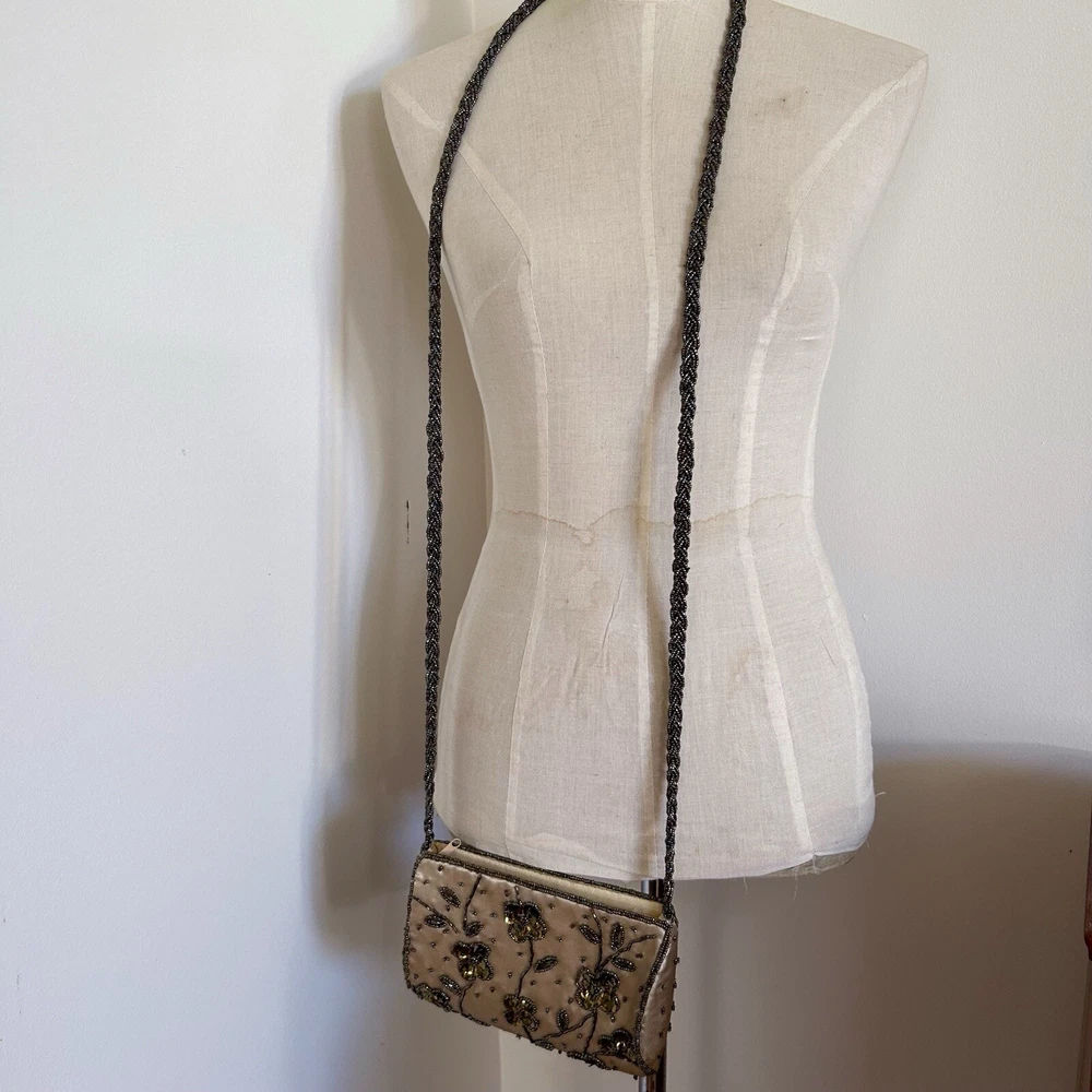 Vintage Gold Satin Beaded Bag Cross Body Evening Bag 90s y2k Embellished Good condition general wear Always happy to combine postage