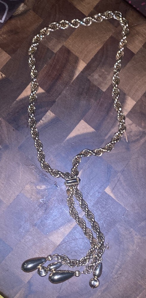 This Vintage Gold Tone Bolo/Lariat Style Twisted Rope Necklace is a stunning statement piece of jewelry. The twisted rope design adds a unique and stylish touch to the piece, while the bolo closure gives it a secure fit. With its beautiful gold tone color and vintage aesthetic, this necklace is perfect for adding a touch of elegance to any outfit.