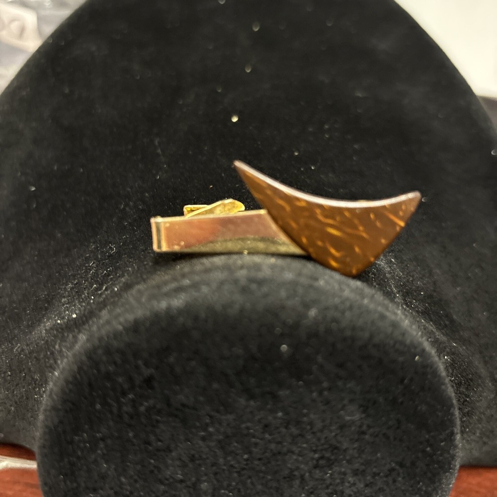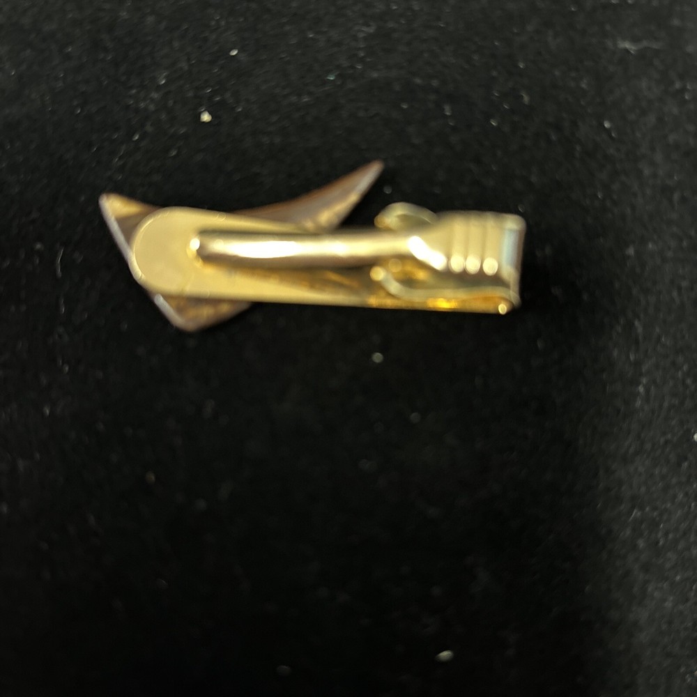 This vintage tie clip features a classic mid-century design with a boomerang shape, made of gold-tone metal. The tie clip is a stylish accessory for men's formal wear, adding a touch of sophistication to any outfit. The brand associated with this tie clip is CENTURY, known for producing quality men's jewelry pieces. Perfect for adding a retro flair to your tie ensemble, this gold-tone tie clip is a timeless and versatile accessory.