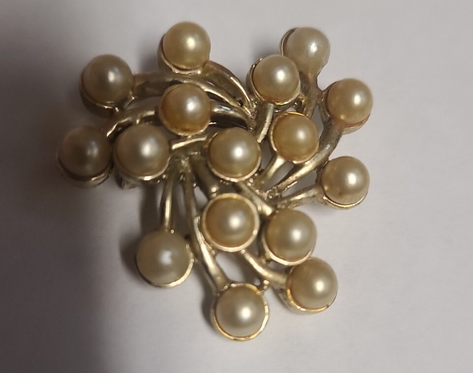 This vintage Emmons pin features delicate gold tone metal branches adorned with beautiful faux pearls. The artistically-crafted brooch is signed and adds a touch of elegance to any outfit. Perfect for special occasions like Christmas, anniversaries, birthdays, and christenings, this piece is a must-have for vintage jewelry collectors. The pin is in excellent shape and will make a great addition to your collection.