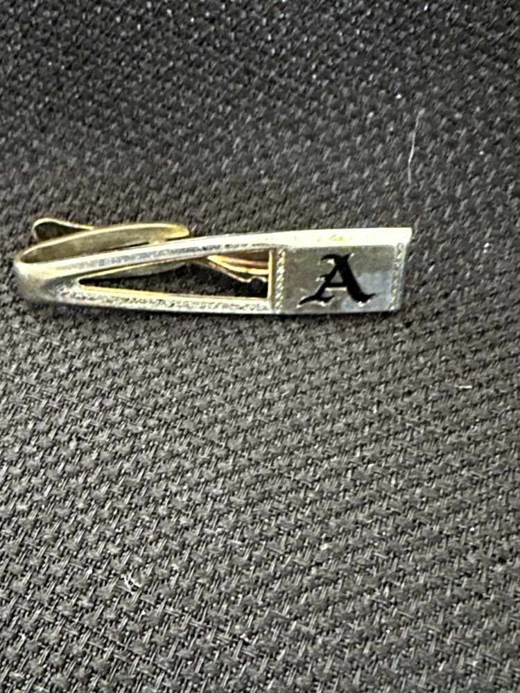 The product is a vintage gold tone tie clip featuring an open bar design with the initial "A" engraved on it. Designed for men, this tie clip adds a touch of elegance and sophistication to any formal outfit. The gold color adds a touch of luxury, making it a stylish accessory for any man's wardrobe.
