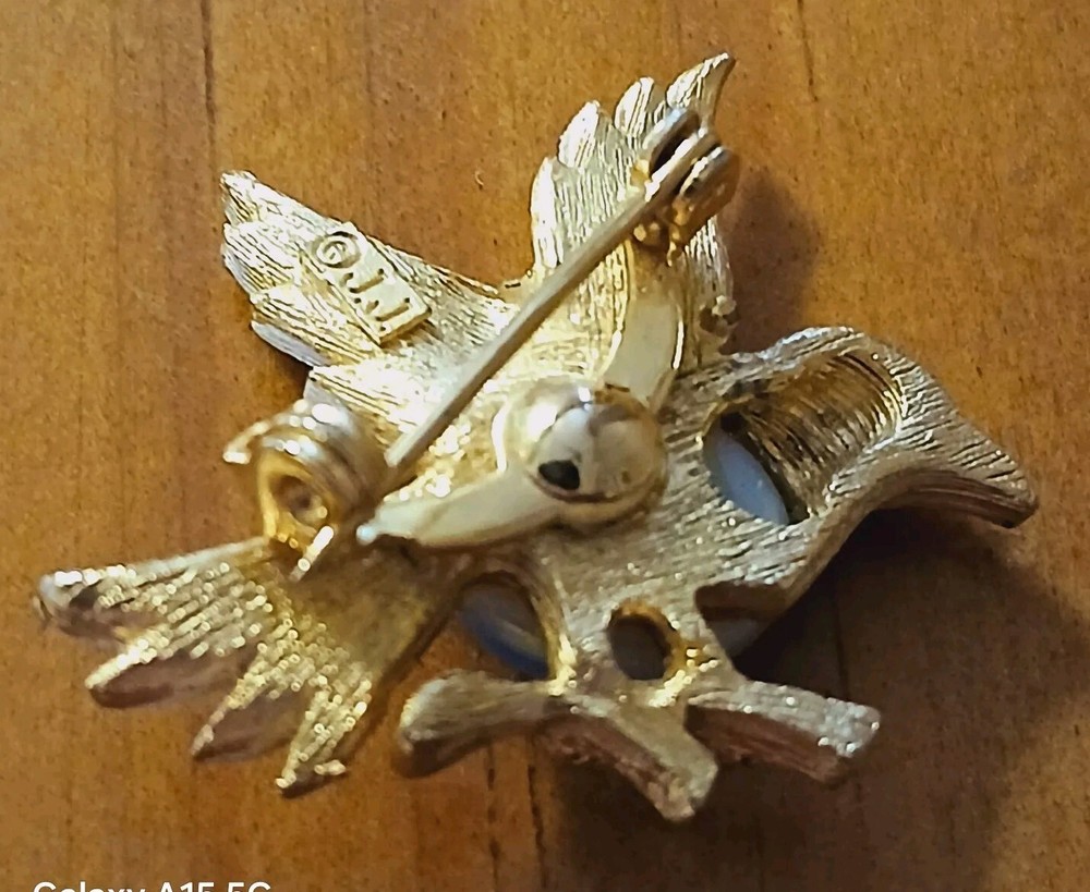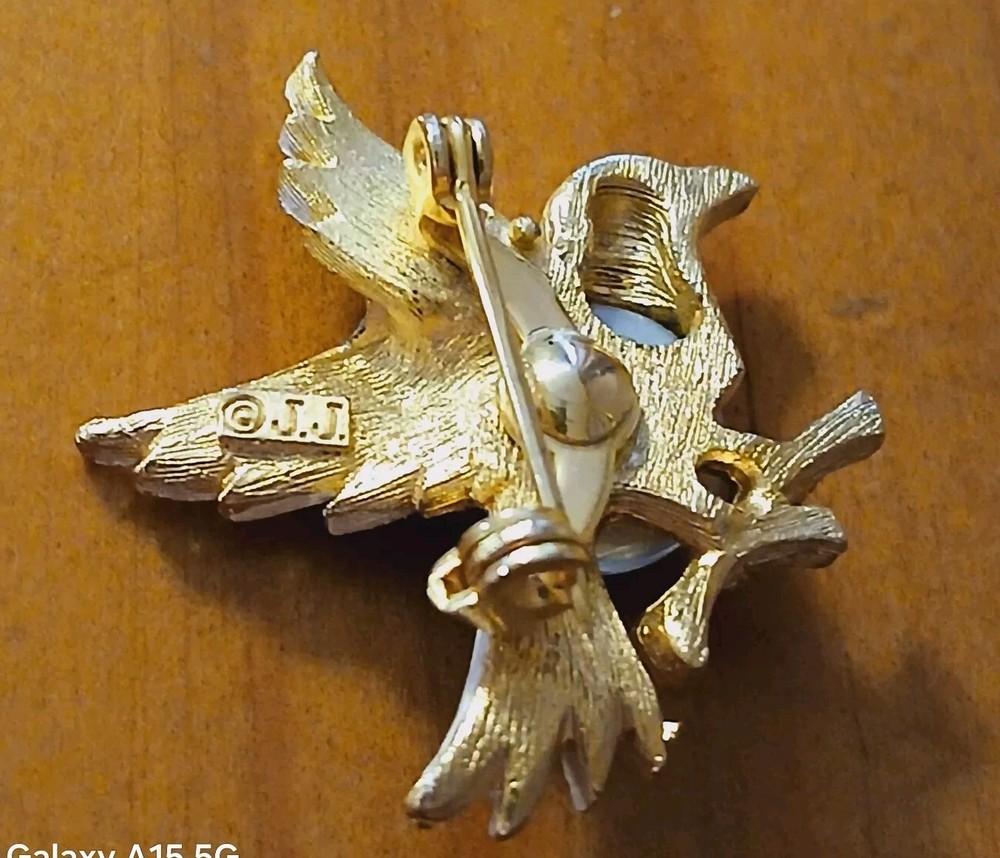 This Jelly Belly brooch is a unique addition to any vintage jewelry collection. This brooch has a gold toned bird and a round stone with blue and white stripes. The brand is well-known for its quality, and this brooch is no exception. Pre-owned and in good condition.