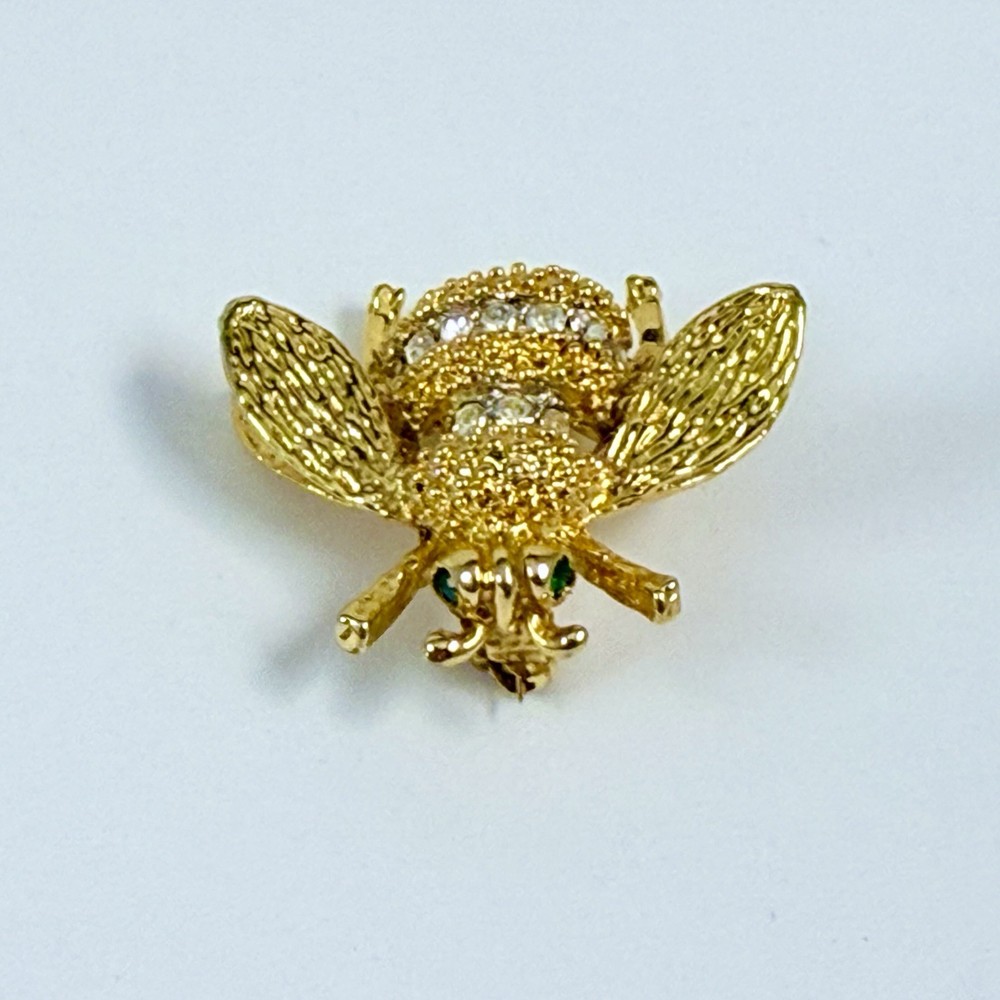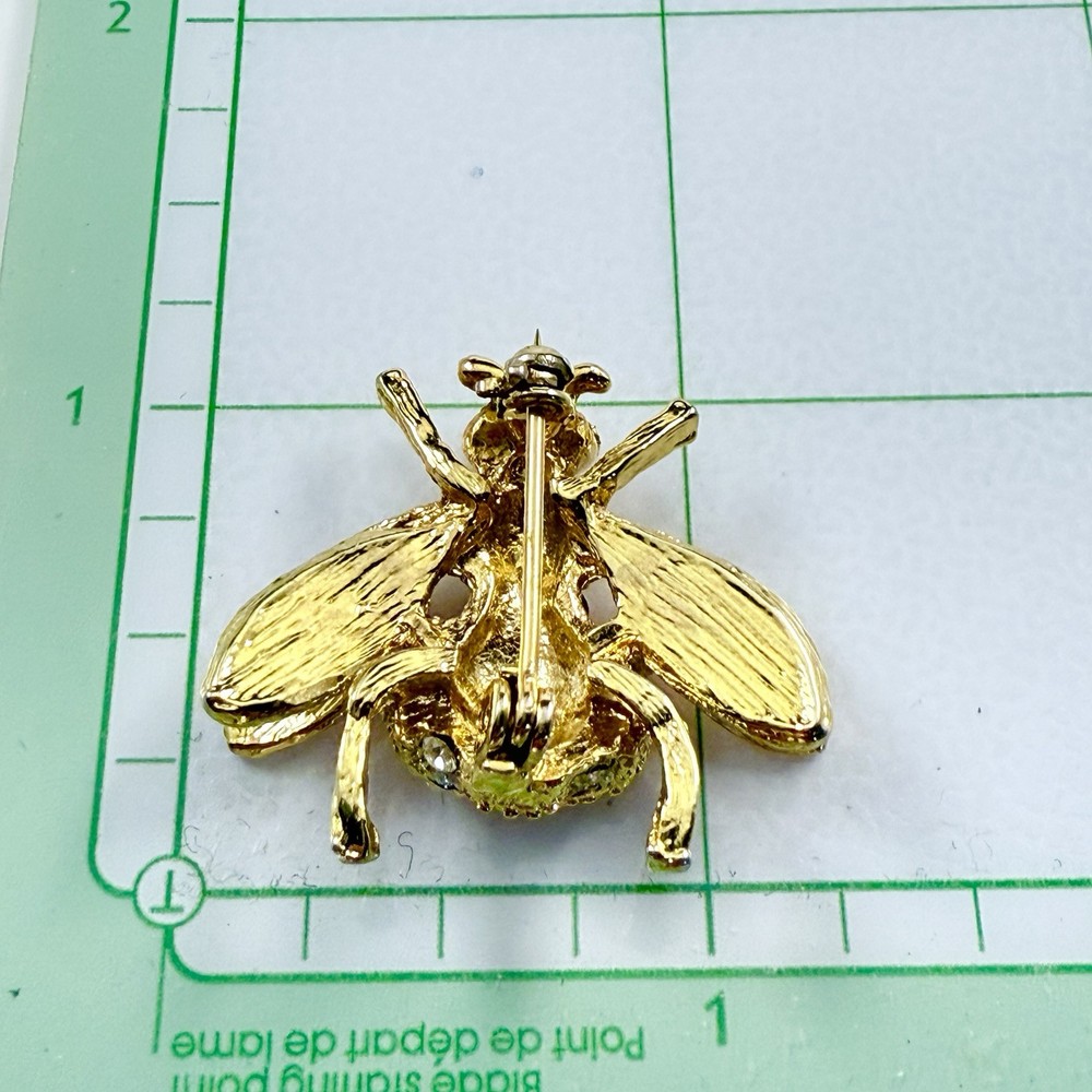 Vintage Rhinestone Bumble Bee Gold Tone Brooch Pin. Pre-Owned Estate Jewelry in Very Good Condition. Ready to wear, give as gift or add to a collection. Our Vintage items are mostly from estate sales and vary in age from 100+ years old to more modern pieces. Please use your judgement. Items are photographed on a measuring matte with one-inch squares to give you an idea of size. Any photography props / holders you see are not included.
