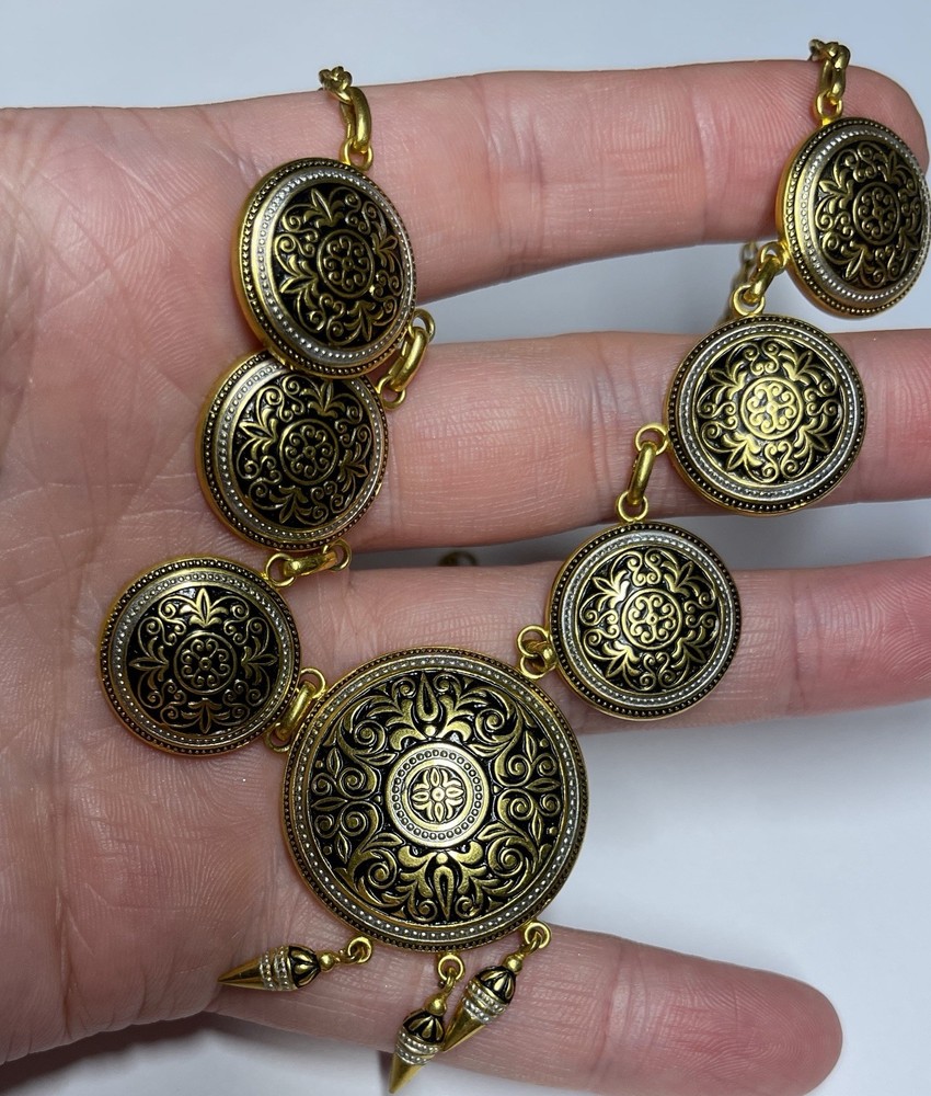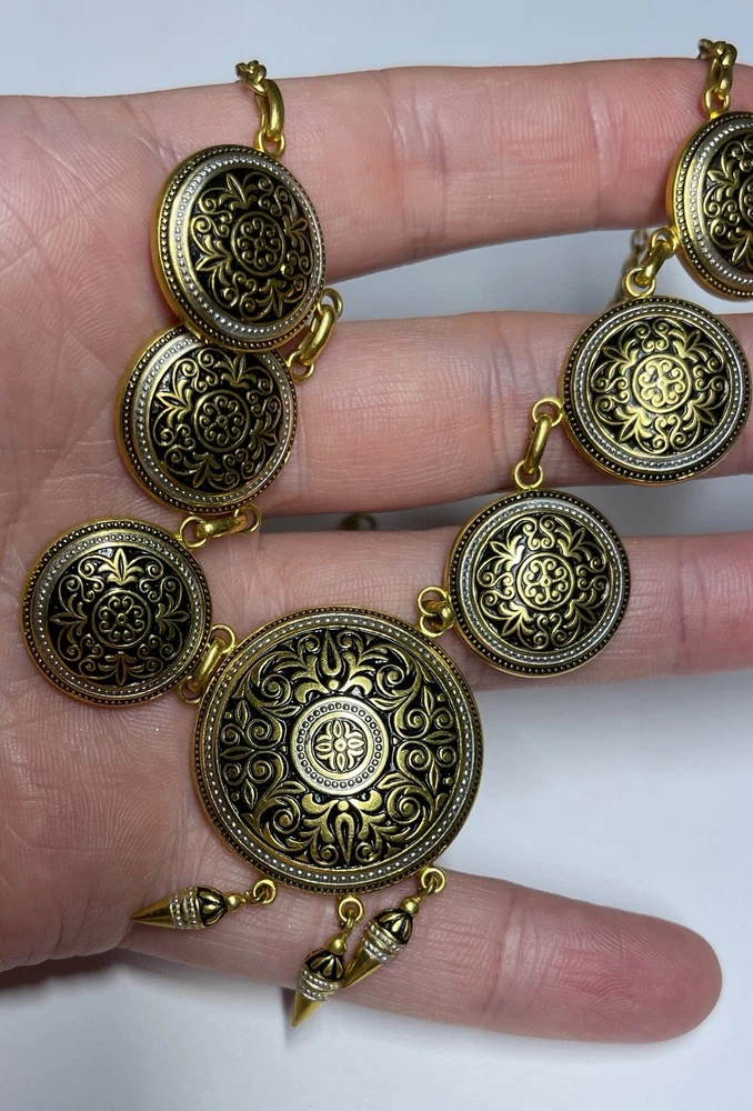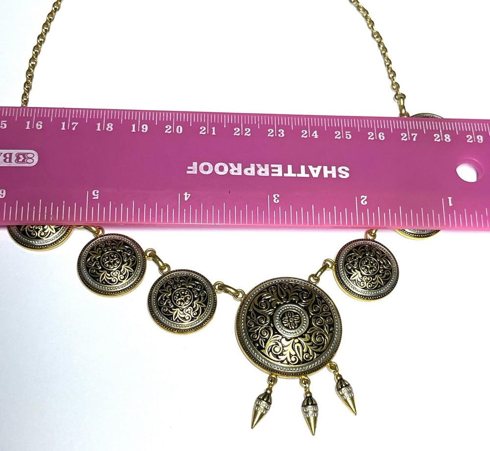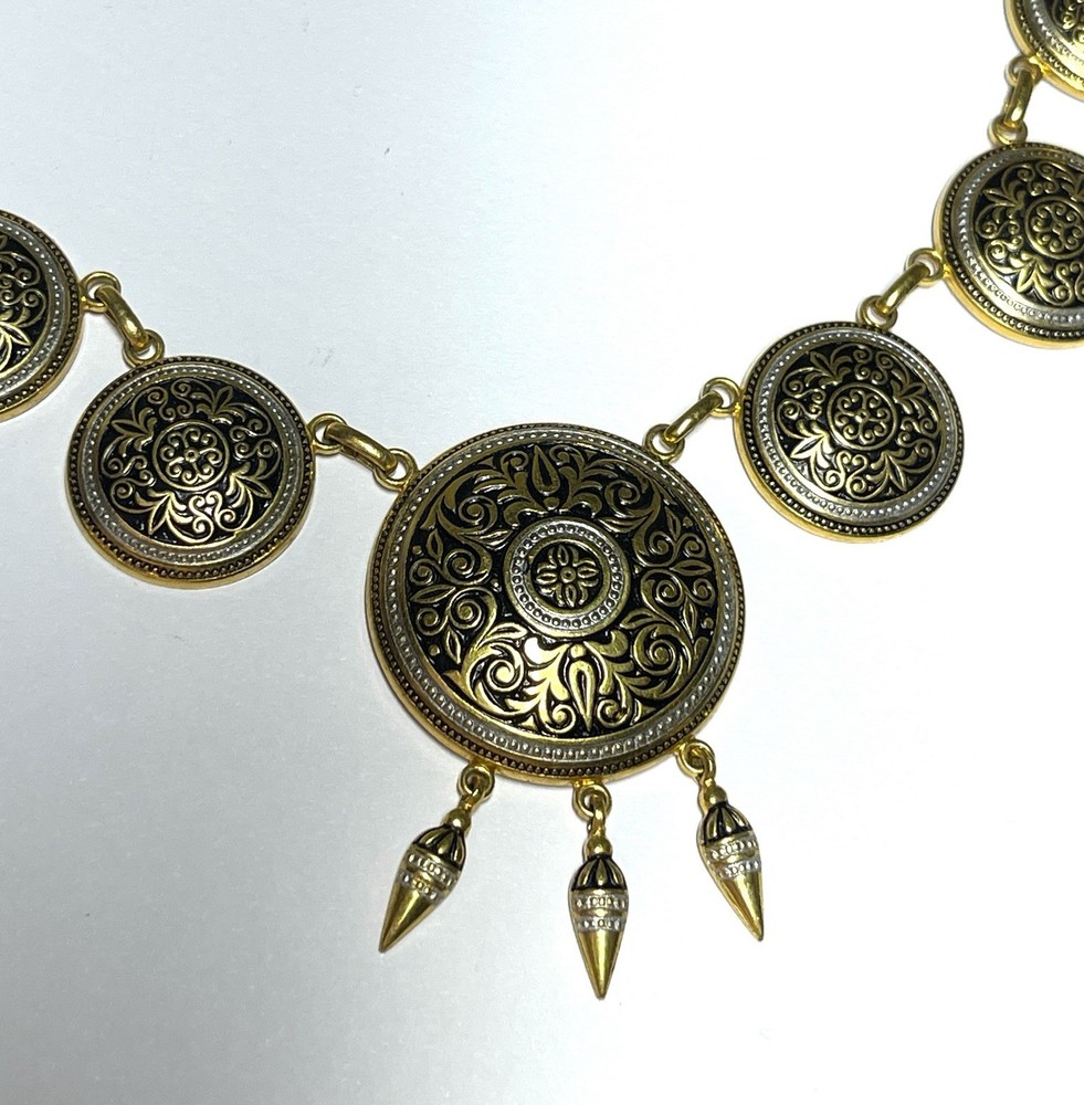 Vintage Gold Tone Spanish Damascene Style Medallion Necklace 18” in Length Be sure to see Photos Thanks for Looking