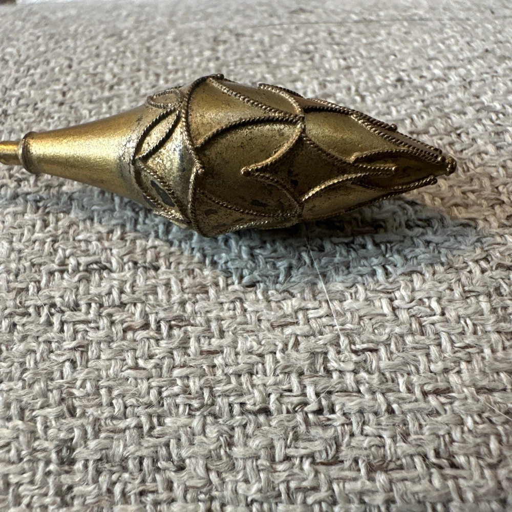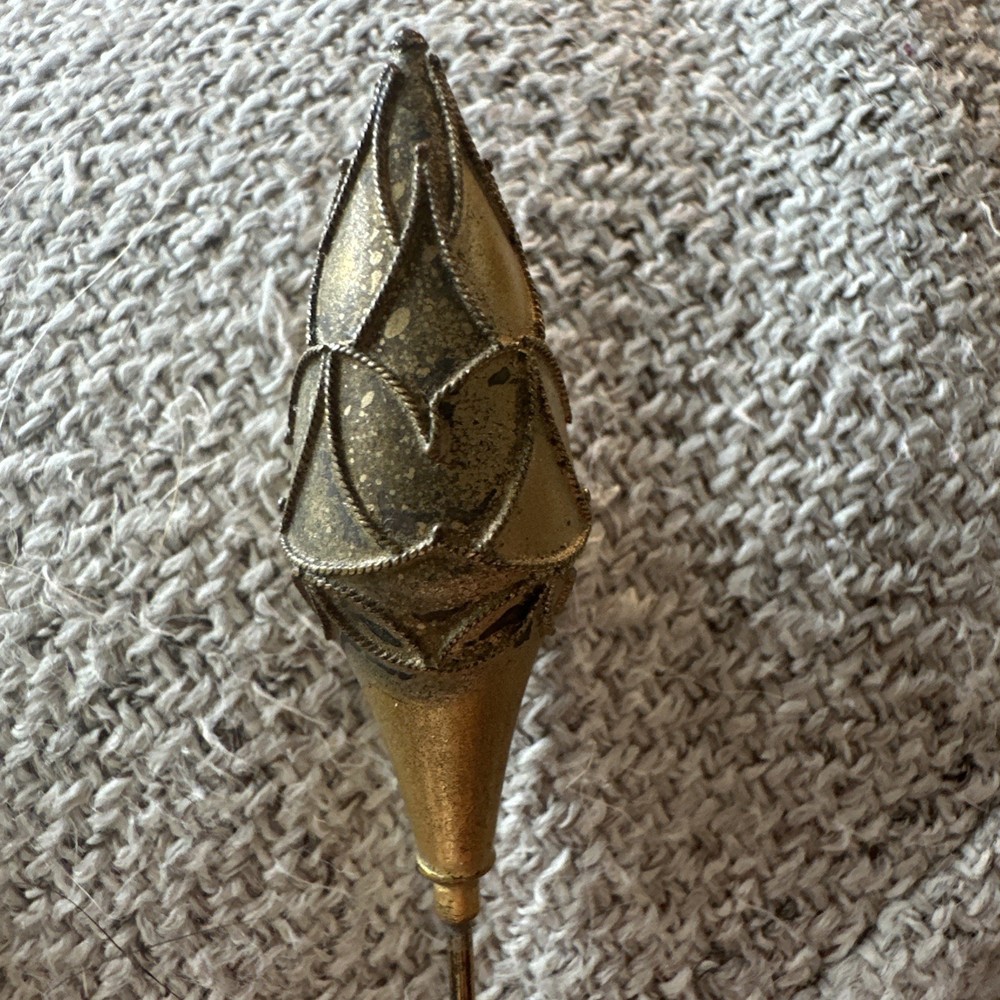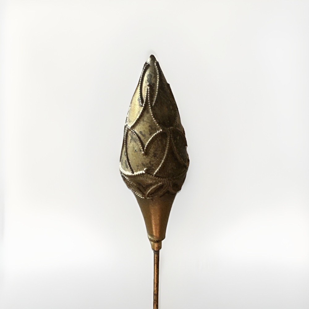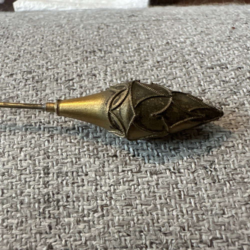 This vintage gold tone teardrop Victorian hatpin is a beautifully crafted collectible item made of metal. Measuring 9.25 inches in length, this hatpin exudes a classic and elegant style reminiscent of the Victorian era. Perfect for adding a touch of old-school charm to any outfit or collection, this hatpin is a versatile piece that can be used for various occasions. Its intricate design and unique shape make it a standout accessory for those who appreciate vintage aesthetics.