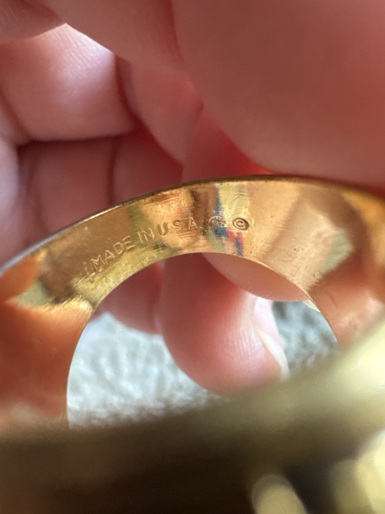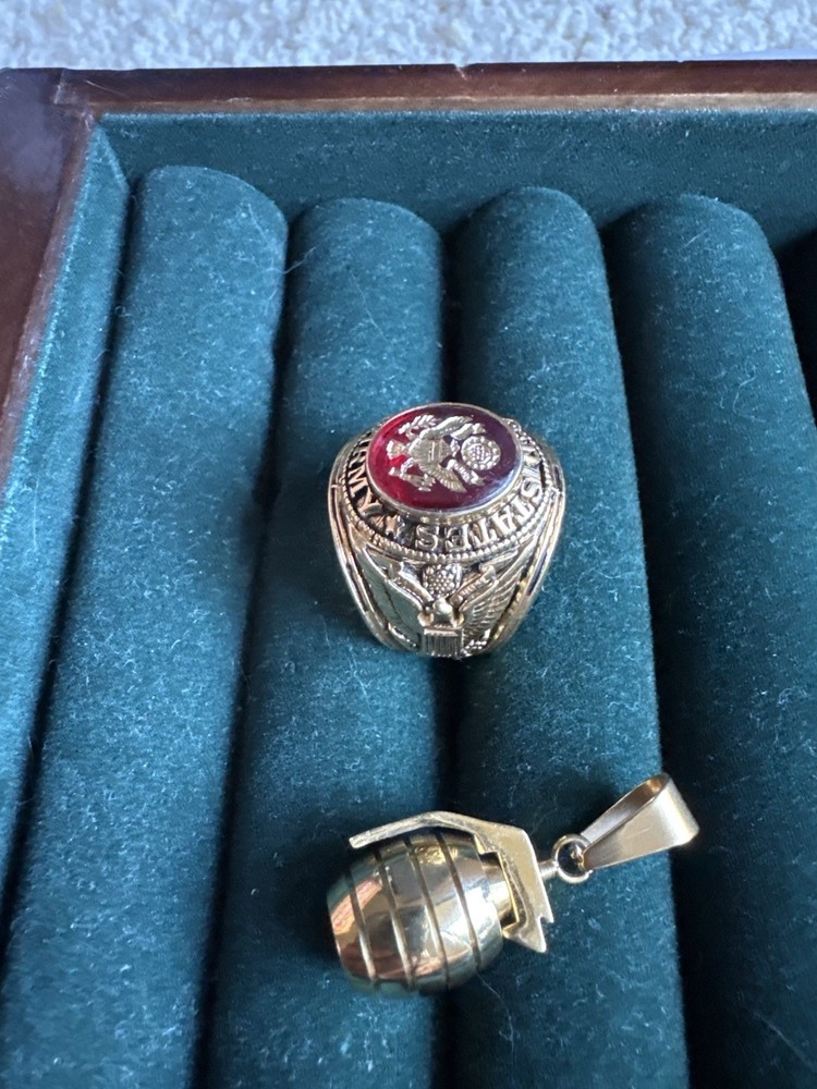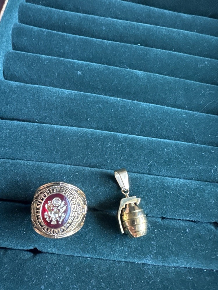 This unique vintage-style jewelry set includes a bold U.S. Army-style ring with an eagle and crest design in a red-tone glass center, and a realistic miniature grenade-shaped pendant. Both items have a shiny gold-tone finish. • The ring is marked “Made in USA” inside. • The grenade pendant has a realistic 3D look. • Material: Gold-tone metal (base metal with plating) • Ring Size: Approximate size 10 (please refer to photos or message for exact measurement). • Great for collectors, military-themed fashion, or as a gift. Note: These are not made of solid gold. No markings indicating karat purity were found, so we are listing as gold-tone costume jewelry. Sold as-is. Please see all photos for condition and details.