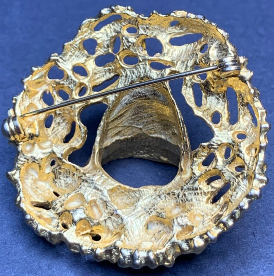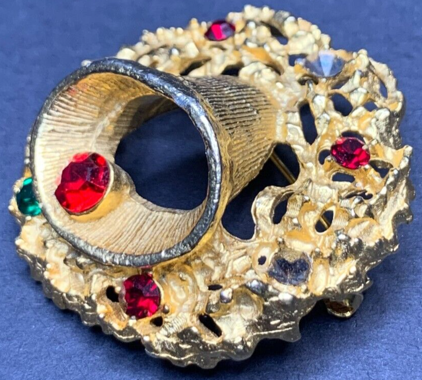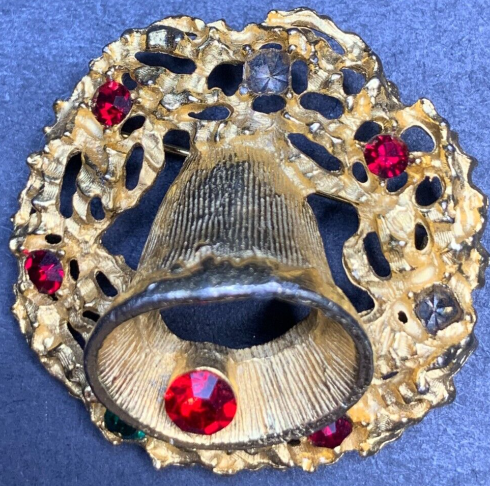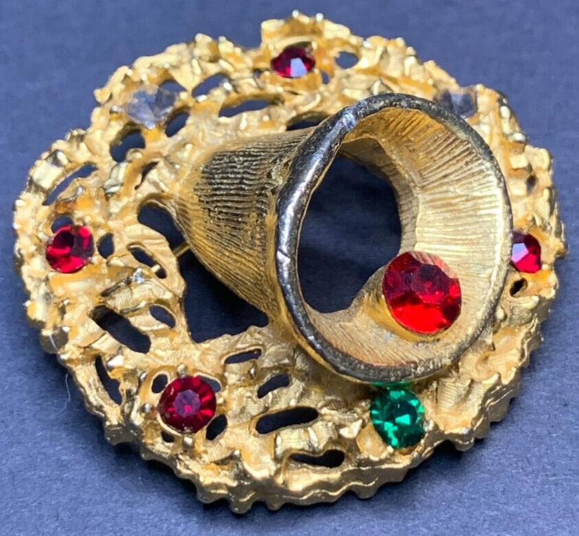Vintage Gold Tone Wreath Bell Brooch with Crystal Rhinestone Accents