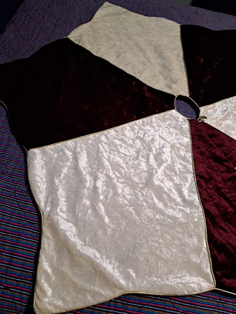 Star shaped Christmas tree skirt burgandy and cream with gold trim and gold buttons. Small mark, last pic.