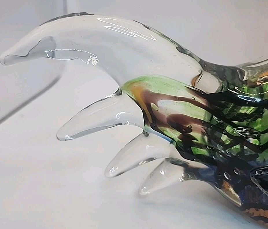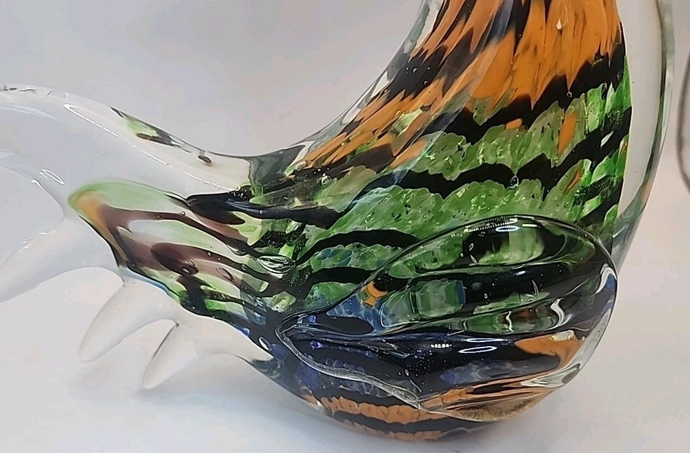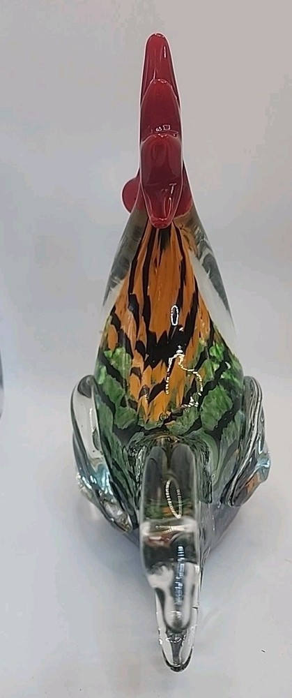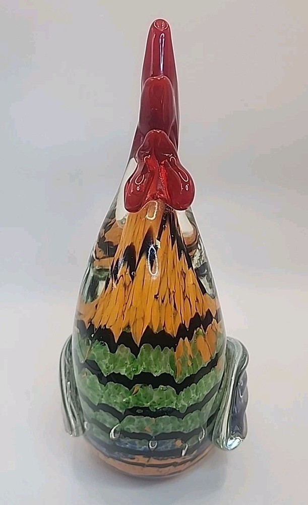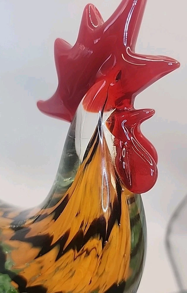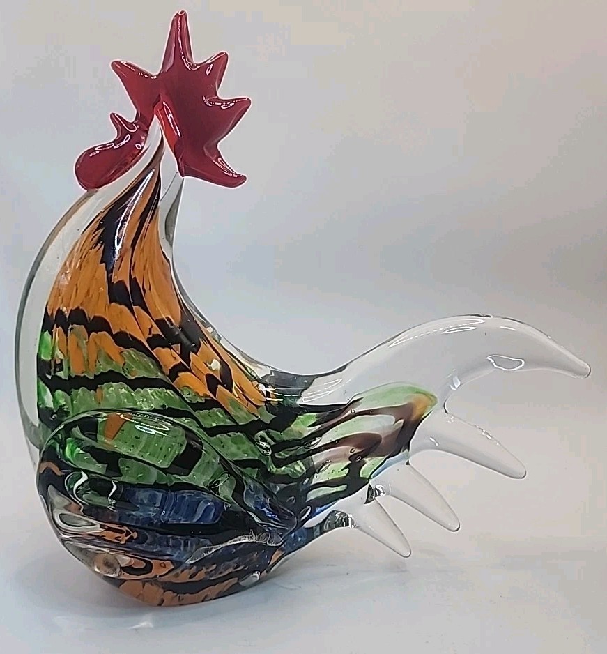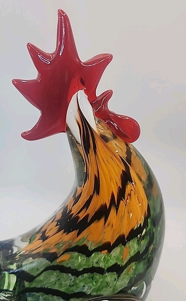 This vintage hand-blown art glass rooster figurine from Chinese origin is a stunning piece of decor that stands at 9 inches tall. Signed by the brand Gorgeous Designs, this multicolored glass sculpture features intricate details and a unique production style. Handmade with a hand-blown glass technique, this rooster figurine captures the essence of birds with a touch of vintage charm. Perfect for collectors of decorative pottery and glassware, this original piece adds a touch of artistry to any home décor setting. No chips or cracks. Absolutely stunning glasswork.