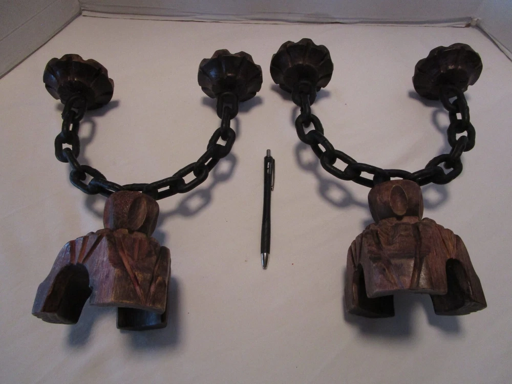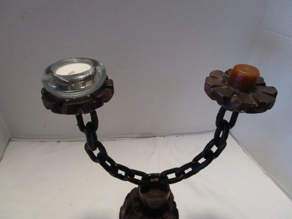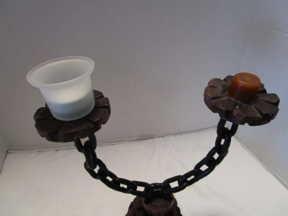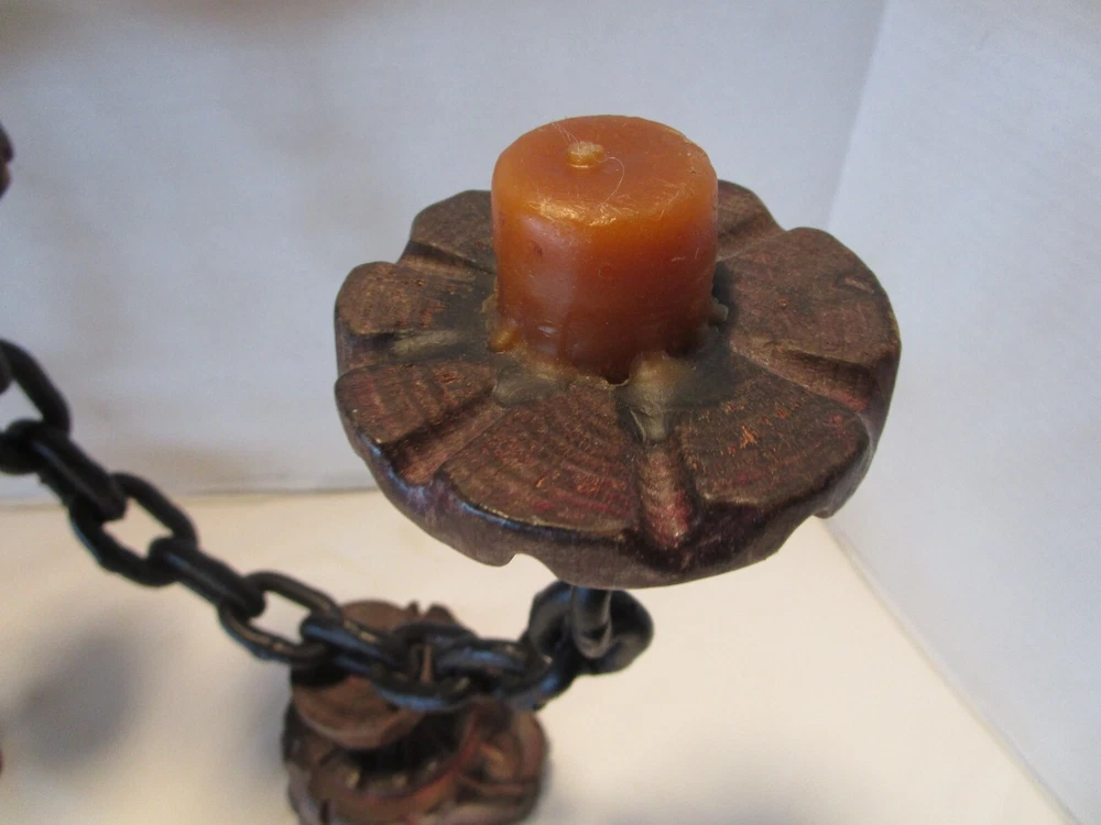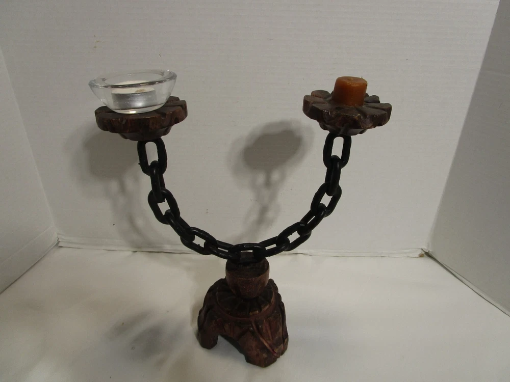 Description: 8/16/14/12/book # 507 Mid Century Modern Spanish- Mediterranean Gothic Medieval carved wood and metal set of 2 tabletop candelabras. Each has a 2-arm iron chain holding up candleholder The base is carved wood, the same as the cup’s/ candleholders. The chains are welded to stay up. They are not exactly identical as they are handcrafted in the 1960’s, not machine-made mass production. Each is approx. 13” tall x 10.5” wide and 4.5” deep Unpacked they weigh 3.75 pounds The candles are decorative only- I have a few pictures showing that you can use other candles if you want. Nice retro used condition- appropriate patina for their age, as found. Please zoom and view all pictures for more details as they are part of the description. I DO MY BEST TO DESCRIBE EVERY LISTING BUT I AM NOT AN EXPERT AND ITEMS ARE SOLD “AS IS”. My idea of great/good may be different than yours, so EXAMINE PHOTOS CAREFULLY since they are binding and a supplement to the word description in case I should miss something. If I fail to mention something, it does not qualify as “item not as described” if it shows in my pictures. EACH PHOTO IS WORTH A THOUSAND WORDS AND THEY ARE OF THE EXACT ITEM YOU WILL RECEIVE. RETURN POLICY: Returns are acceptable ONLY if the item doesn’t match the description, is defective, or grossly misrepresented. All sales are final. THIS MEANS I DO NOT ACCEPT RETURNS for FIT, SIZING, COLOR ISSUES, OR BUYER'S REMORSE. Please zoom and view ALL pictures for more details as they are part of the description. Email me with any questions you may have. Please note: Buyer pays ALL return shipping and fees. · FEEDBACK I do not leave feedback until the end of a transaction. The transaction is considered over once I receive feedback from you confirming that you have received it and expressed satisfaction with it. If you are unsatisfied with your purchase, please contact me before leaving a neutral or negative feedback- so I can fix the issues. Thanks again for shopping at our eBay store and look forward to serve you. · · Email me with any questions. · No reasonable offer refused.