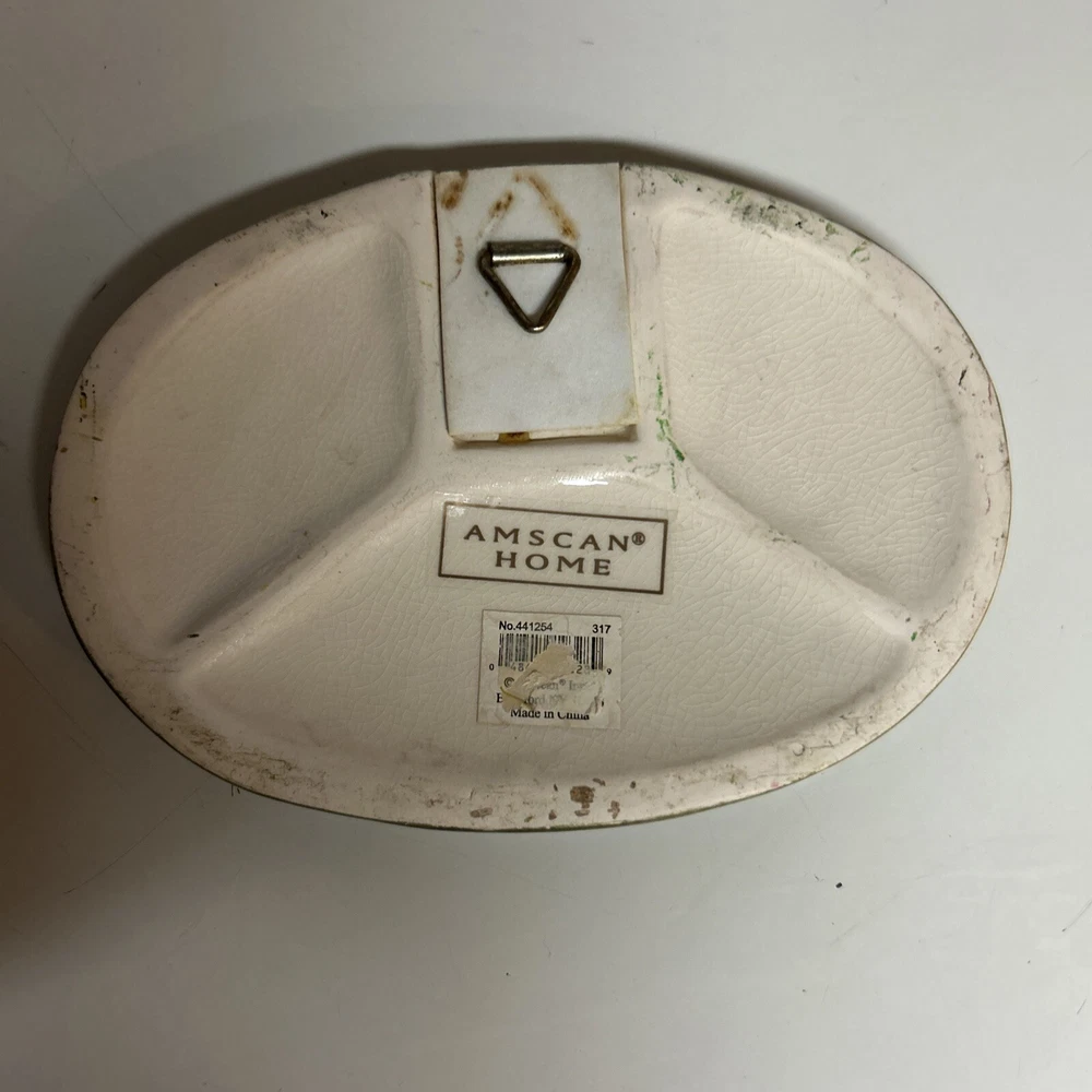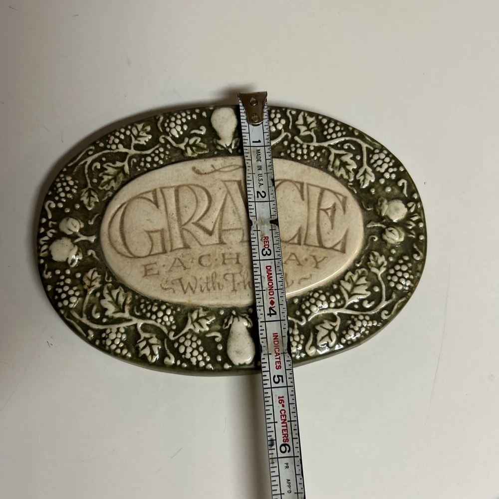 This vintage Amscan plaque and stand is a beautiful addition to any room. With a classic style and a 3D effect, it features hand-painted vines and fruit in olive green, cream gold, and glossy finishes. The plaque is small, measuring 4 1/2" in height and 6 1/2" in width, and it comes with a hanging feature for easy display. The plaque is perfect for anyone who loves art, inspirational words, or religious themes. It is made of ceramic material and can be cleaned with a damp cloth. The plaque is not personalized and does not require any additional parts. Its model name is "Grace" and it weighs 10.5 ounces. This plaque is a great way to show your thankfulness and add a touch of cottagecore, Victorian, or momcore vibes to your home. Excellent condition Comes with stand or can be hung on wall
