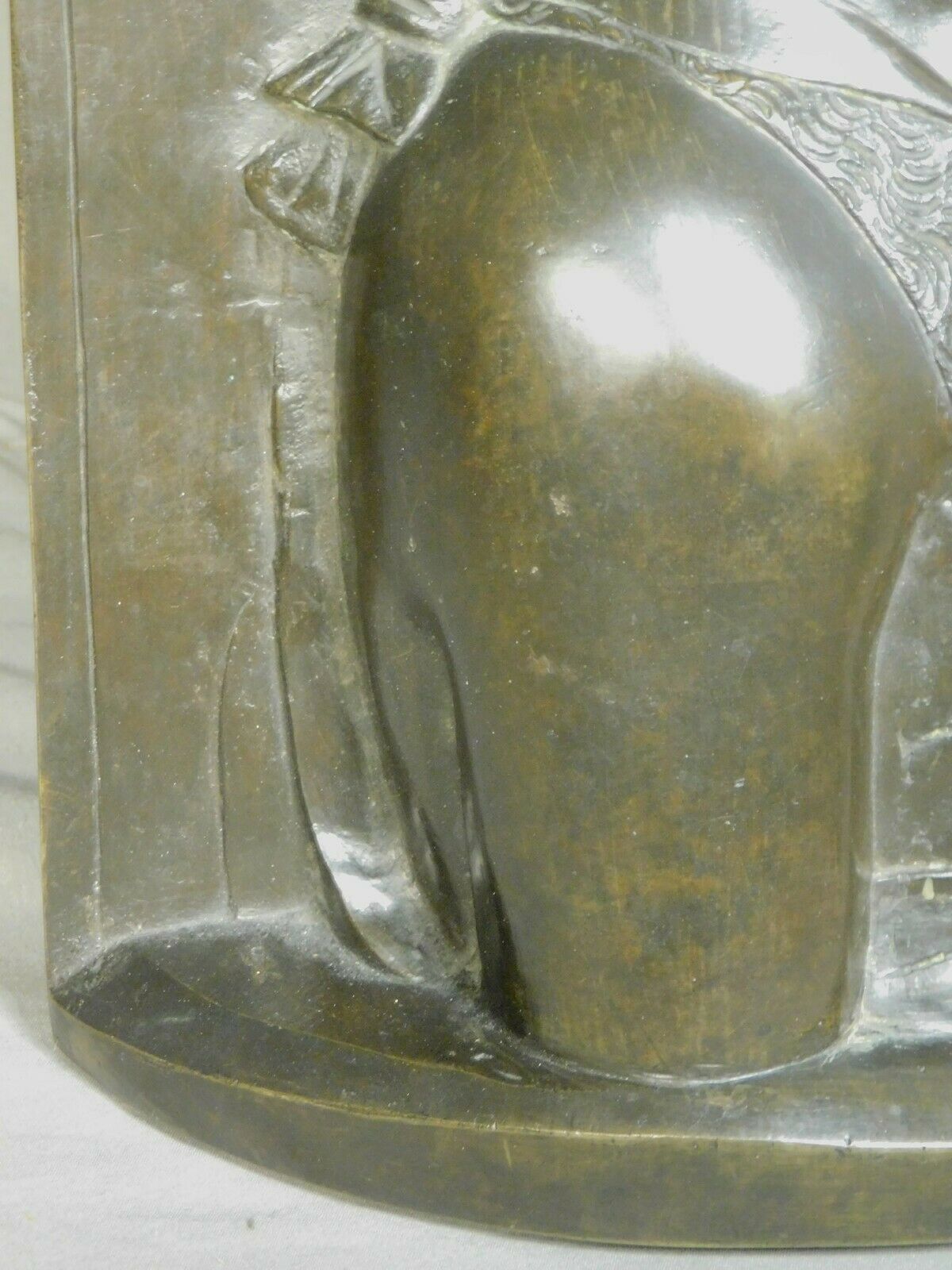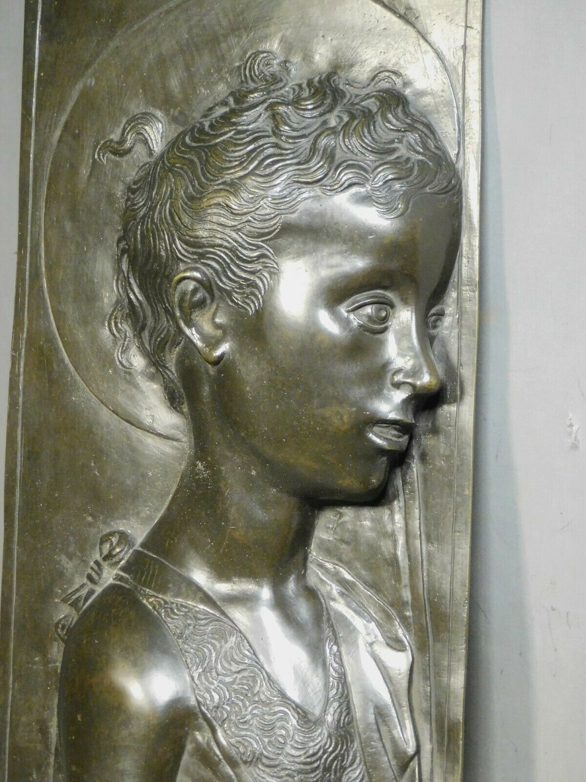 This sensitive lost-wax, cast bronze relief after the young Desiderio da Settignano (Florence, c.1430-1468) dates from the early 1900's and was likely crafted in Italy as a souvenir of the grand tour. Measuring 19 1/8" tall x 9 1/8" wide x 2 1/2" deep, it depicts the young John the Baptist as a young boy in profile wearing his rough fur garment. The deeply cut details and warm patina make this a particularly pleasing replica of Desiderio's masterpiece. WE ARE ALWAYS HAPPY TO SHIP WORLDWIDE IF ALLOWED BY USPS. Please contact for international shipping cost quote. Stated U.S. shipping charges are for FEDEX GROUND in the contiguous 48 states. Higher rates may apply for AK and HI or USPS shipping. Please e-mail me if you have any questions. PAYMENT POLICY: Unless arrangements are made prior to bidding, payment is expected within 7 days after the end of the auction or the item will be re-listed. Visa/MasterCard payments accepted through PayPal. Indiana residents must add 7% sales tax. On all INTERNATIONAL SHIPMENTS merchandise will be declared as such (not gifts or commercial samples) and value stated as the actual sale price. LARRY