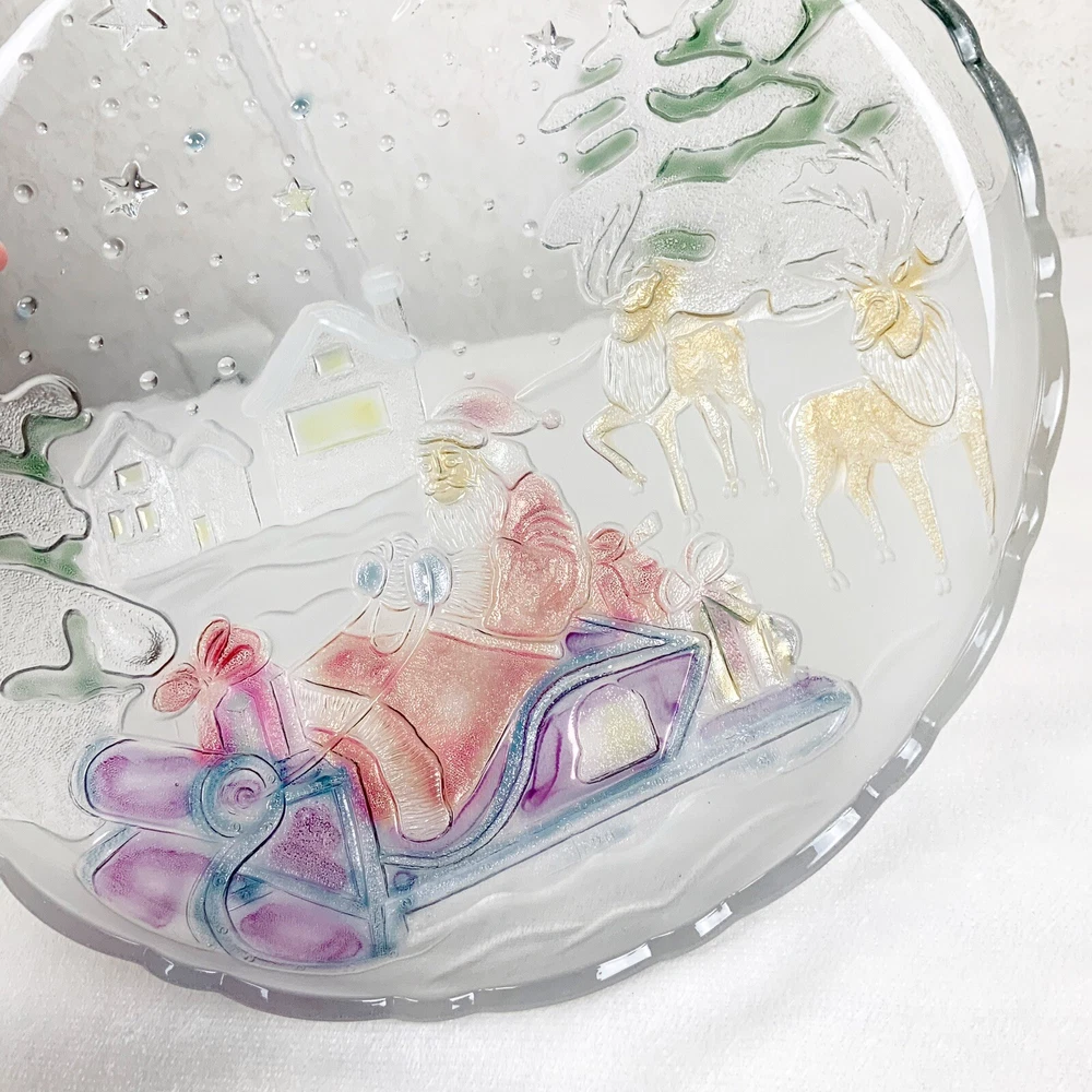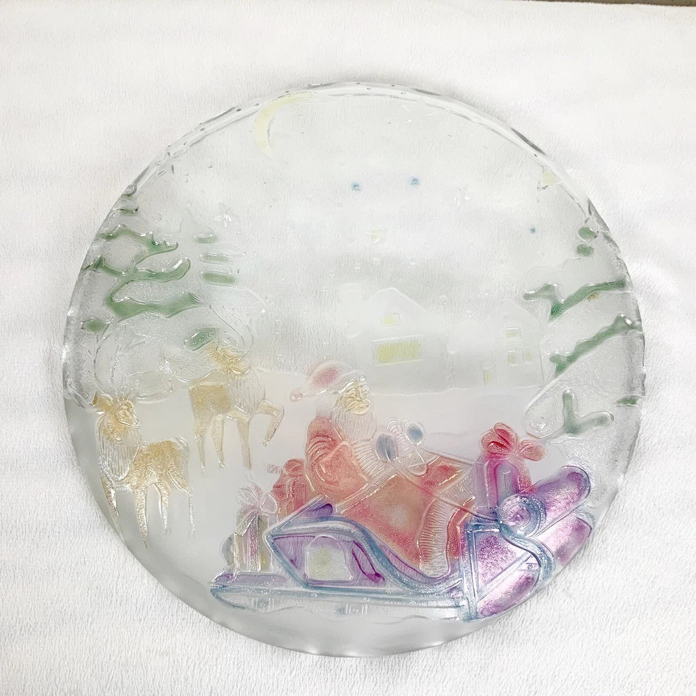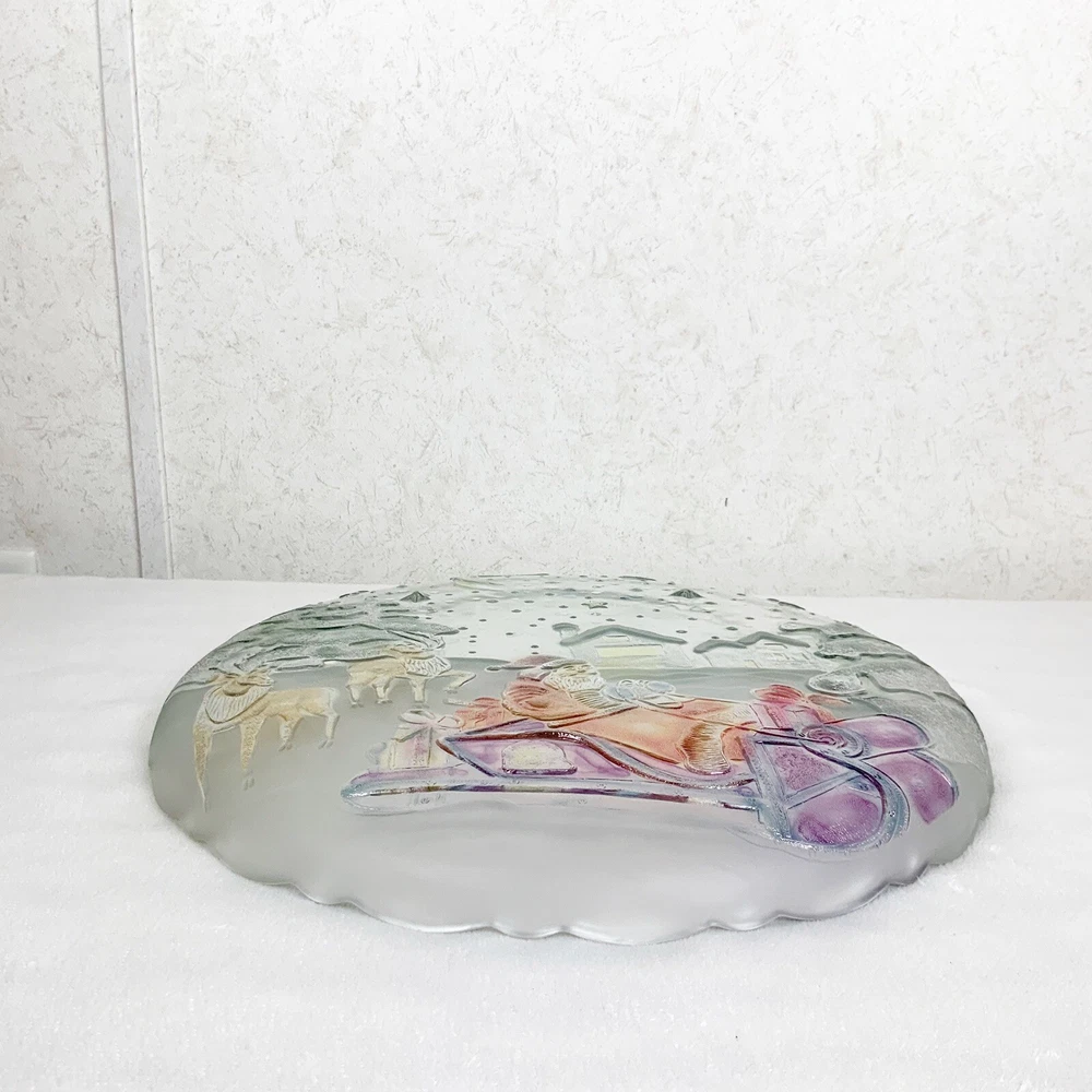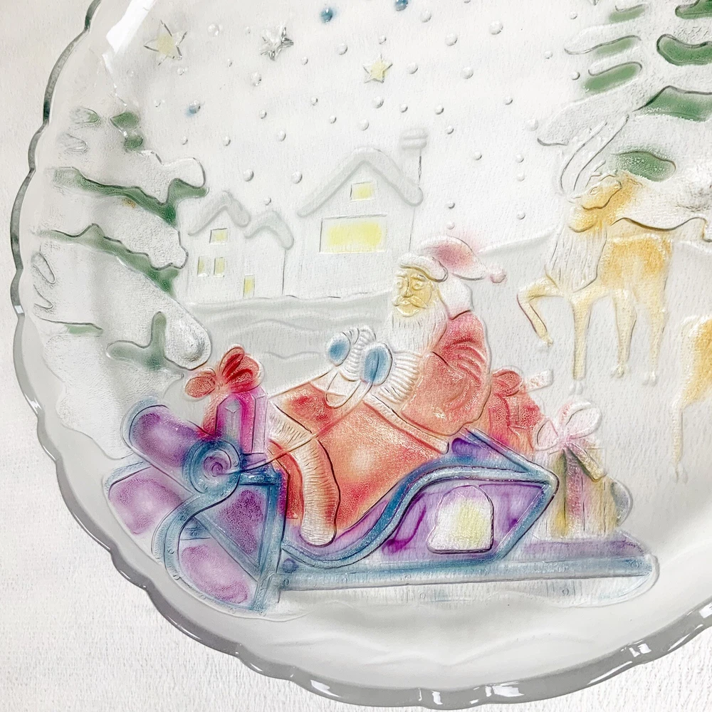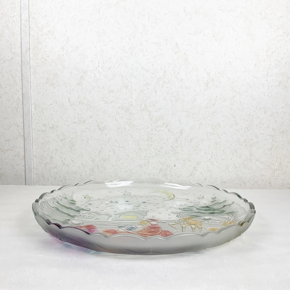 Vintage Excellent condition. Box has some wear Grandeur Noel Round heavyweight glass serving platter Christmas pattern, Santa in his sleigh with reindeer, trees, snow, houses Colorful, paint has a sheen when the light hits Hand painted Do not use in dishwasher 14” Comes in original box