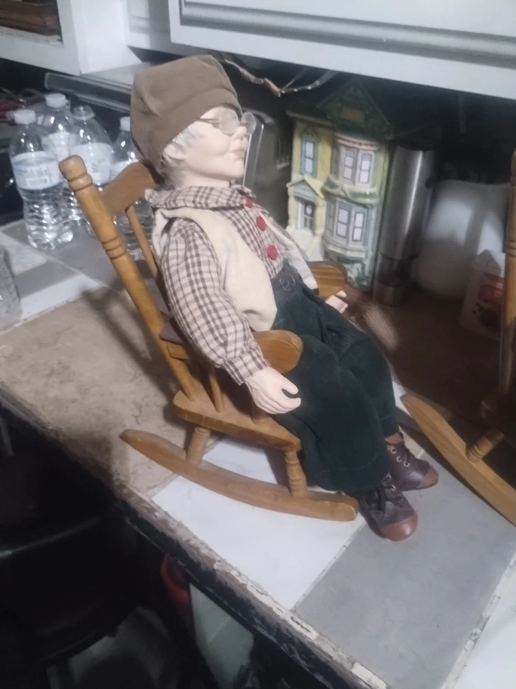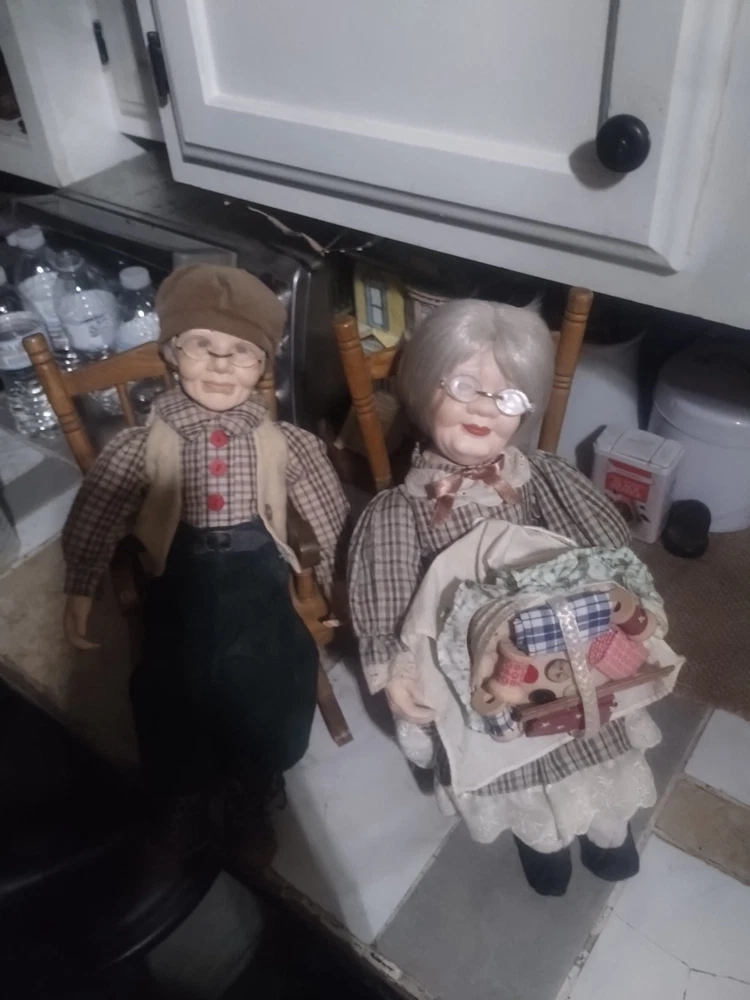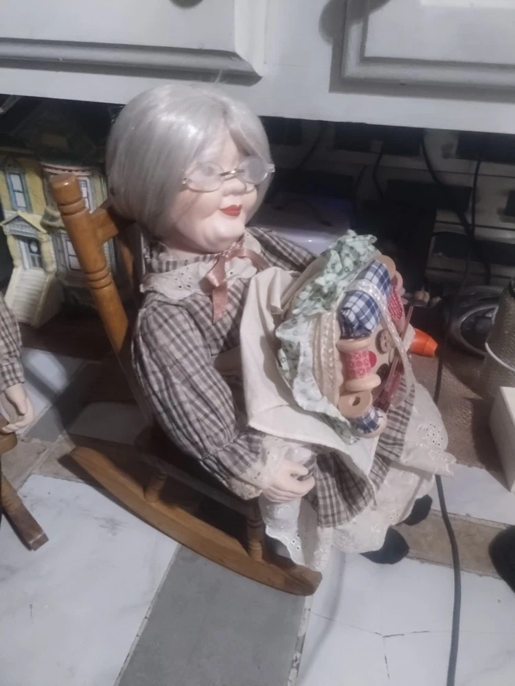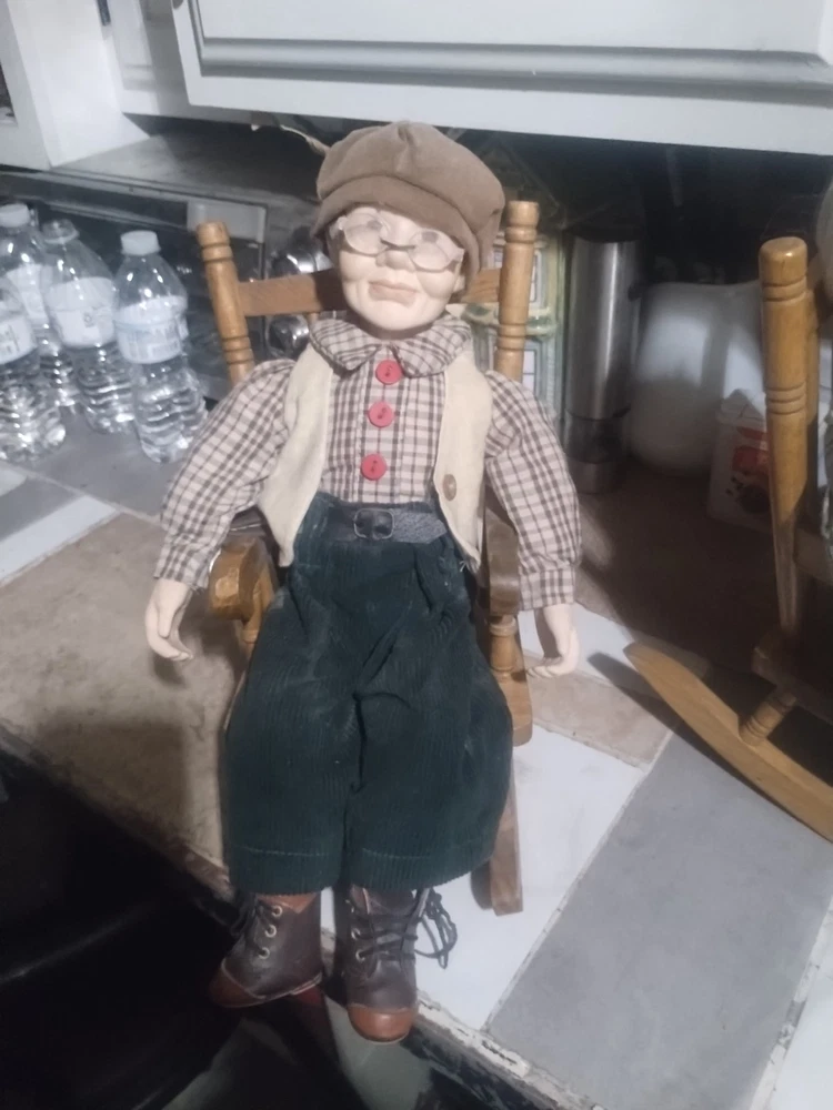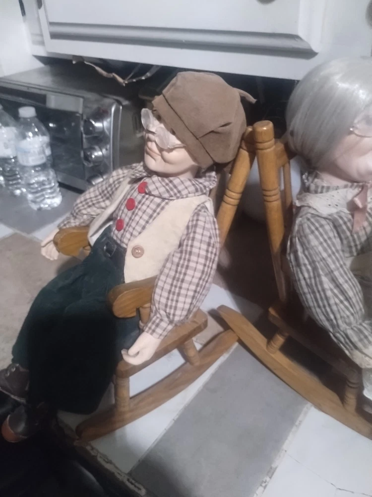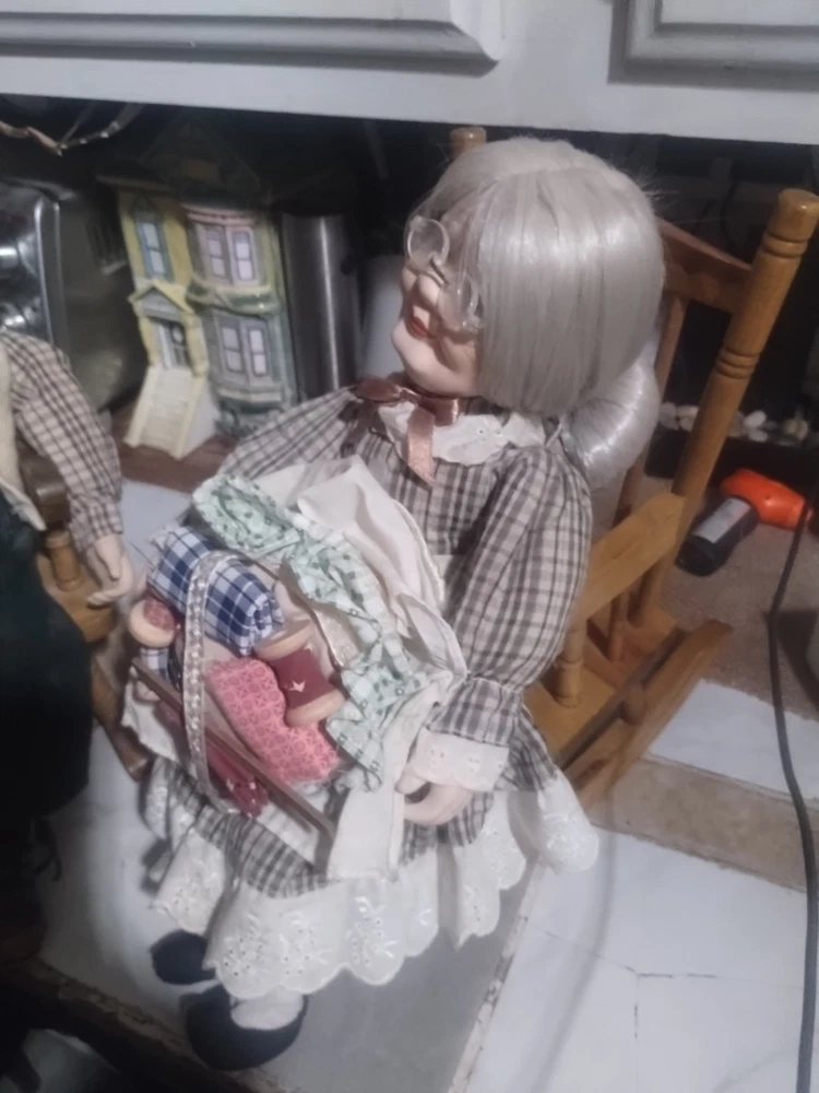 These vintage porcelain dolls are a lovely addition to any collection. The dolls are dressed in traditional folk art clothing and are sitting in wooden rocking chairs. The dolls are in pristine condition and are perfect for display.