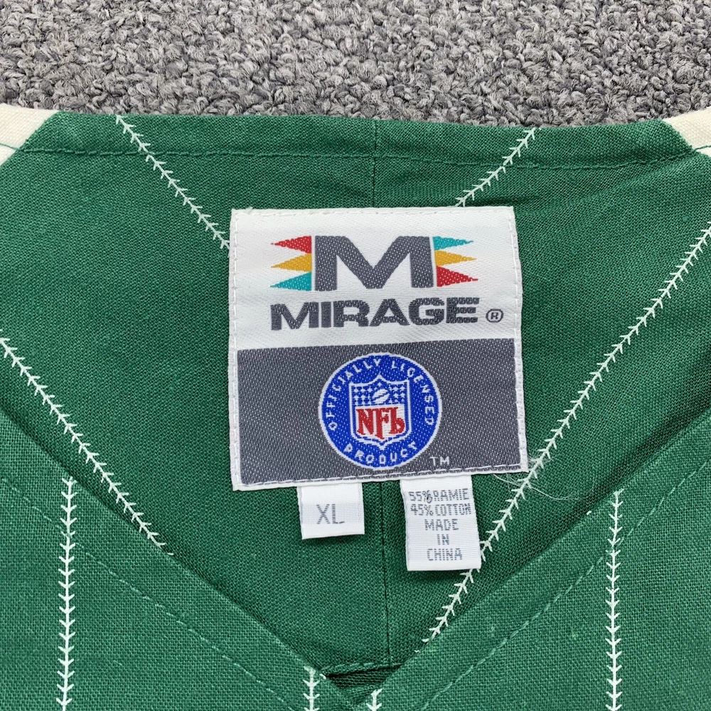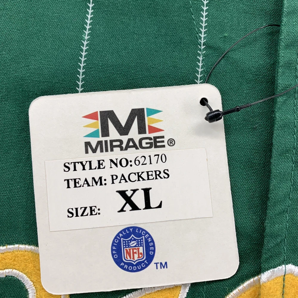 Product:JerseyBrand:MiragePre & Post Season:Regular SeasonLeague:National Football League (NFL)Officially Licensed:YesGender:MenTeam:Green Bay PackersCountry/Region of Manufacture:ChinaSport:FootballSize:XLColor:GreenPlayer:NA