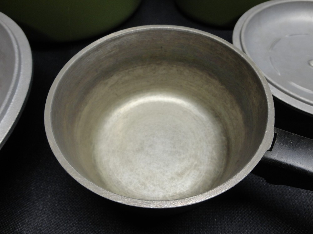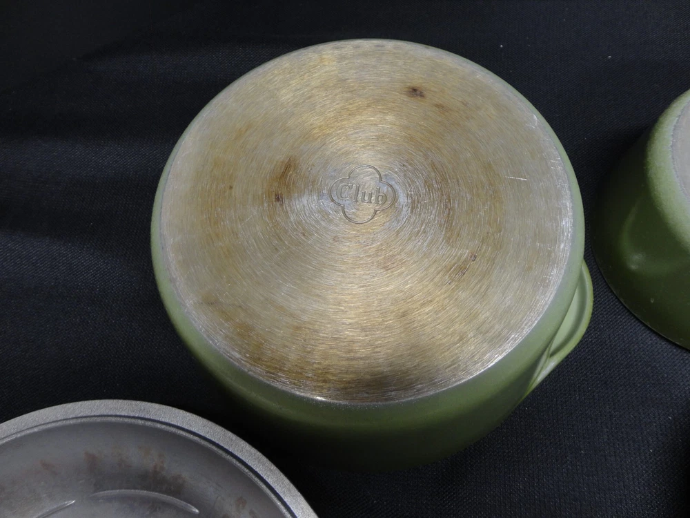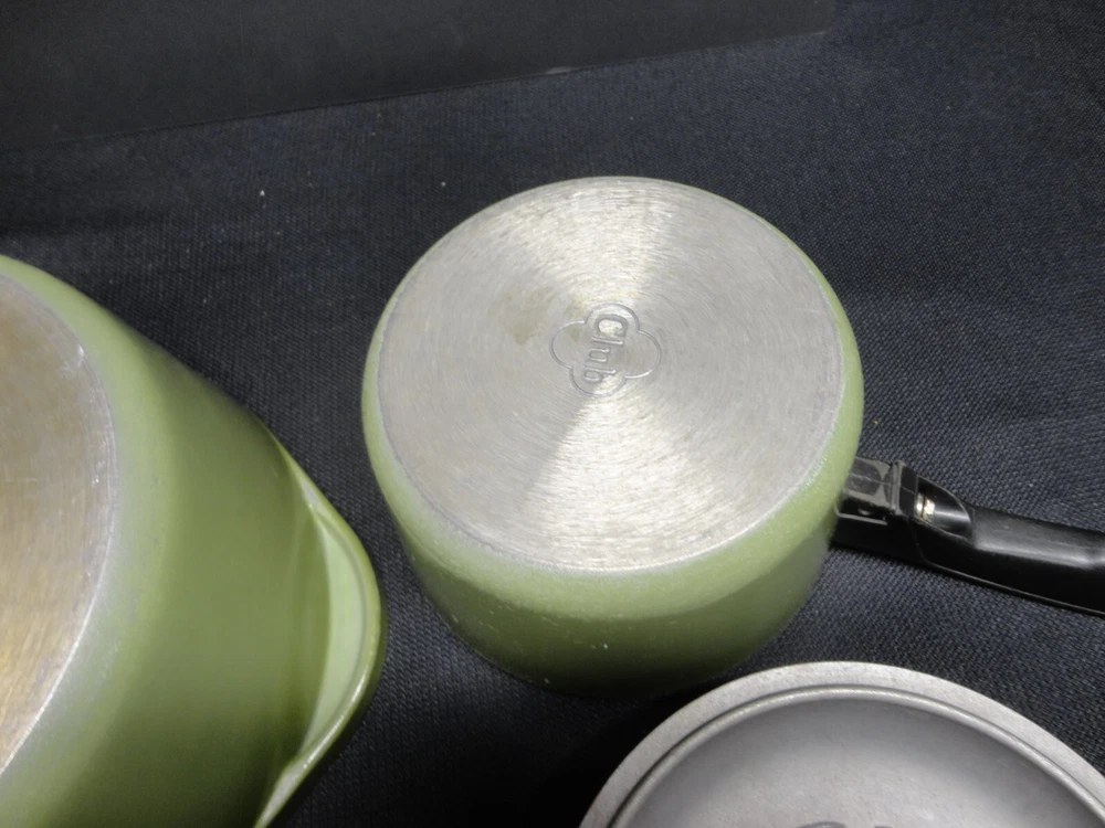 This vintage Club Aluminum six-piece pots and Dutch oven set is a rare find for collectors of antique cookware. The set includes round pots and a Dutch oven all in a classic green color with enamel paint surface coating. Made in the United States, this set is compatible with electric and gas stoves, making it a versatile addition to any kitchen. The original pieces from the Club Aluminum brand are a true vintage treasure for those who appreciate quality and nostalgia in their cooking utensils.