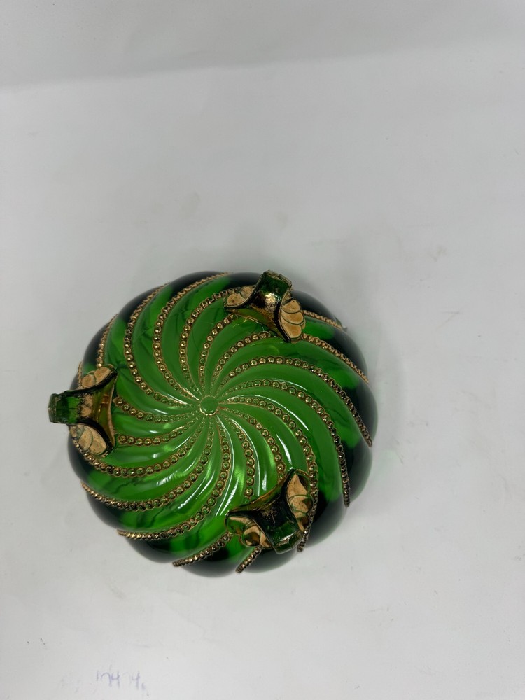 This vintage green glass footed bowl is a stunning decorative piece featuring a swirl pattern with gold accents and raised beaded detailing . The bowl sits on three ornate feet with gold-painted designs, adding an elegant touch to any space. ๐ Key Features: Material: Green glass with gold-painted details Size: 7.5โ wide x 4โ tall Condition: Excellent vintage condition with minor wear on gold detailing Perfect for: A centerpiece, candy dish, or trinket bowl Style: Victorian, Mid-Century, Bohemian A must-have for glassware collectors, vintage home decor lovers, and those who appreciate fine craftsmanship.