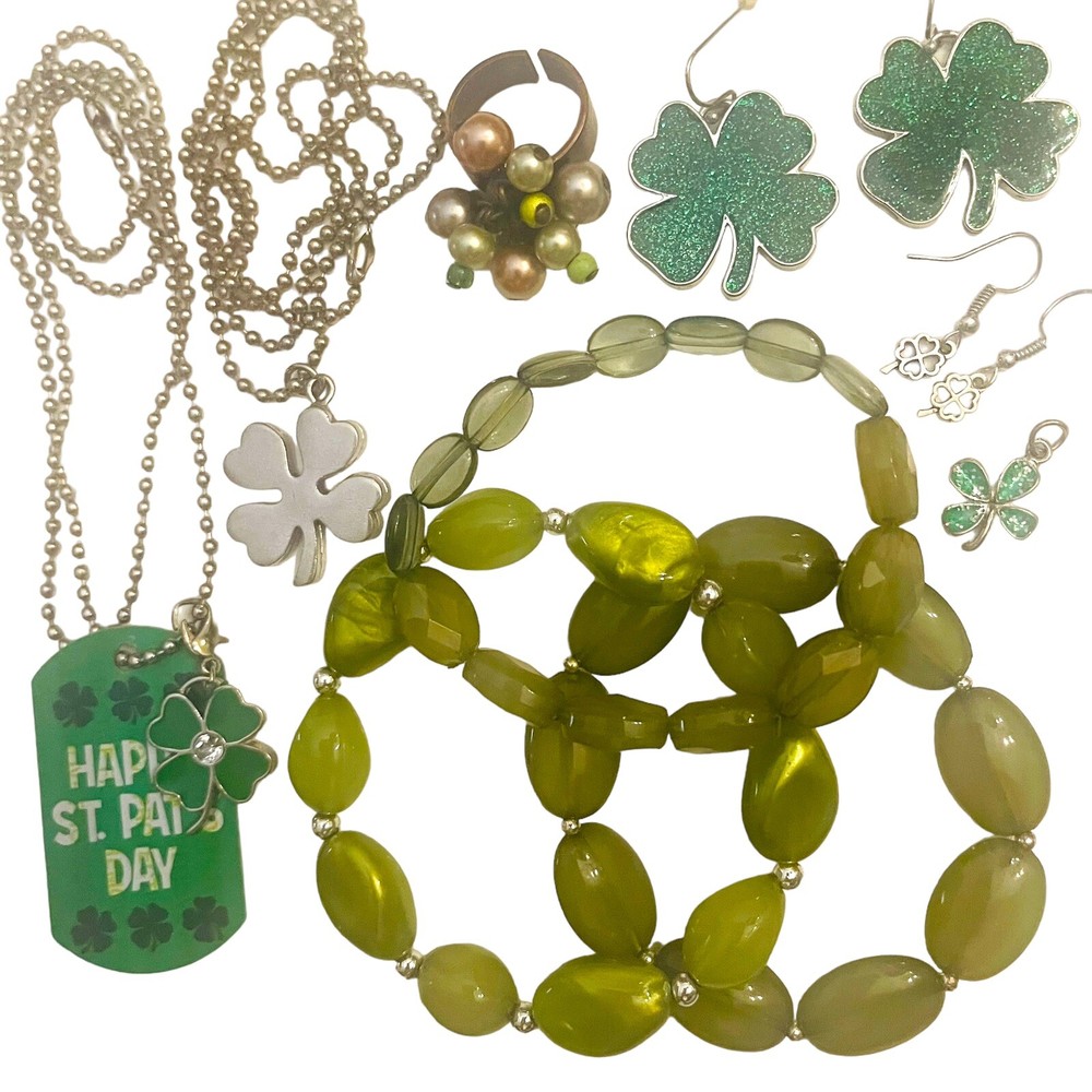 Fun lucky charms or St. Patrick's Day themed mix with necklaces, bead bracelets, earrings, pendant, charms and a ring. Pieces are wearable but would also be great for bead and charm harvest to use in your own jewelry designs and other craft projects. Collection features the color green of course and lucky four leaf clovers. 10 piece lot includes 2 ball chain necklaces with pendants and 1 four leaf clover clip charm, 3 bracelets, 2 pairs of dangle earrings, 1 adjustable ring and 1 small four leaf clover pendant. The length of the ball chains is 22 & 24 Inches. See photos taken with ruler for more description on size of jewelry. See photos. Zoom for more detail and assessment of condition. Feel free to contact me with questions. I will create custom bundles & give discounts for purchases of more than one item/listing + combine shipping for extra savings. Quotes provided on request. All sales are final. Returns are not accepted; however your satisfaction is important to me. Please reach out if there is a problem with your purchase. Thanks! PassionatelyCollected I passionately collect things.....