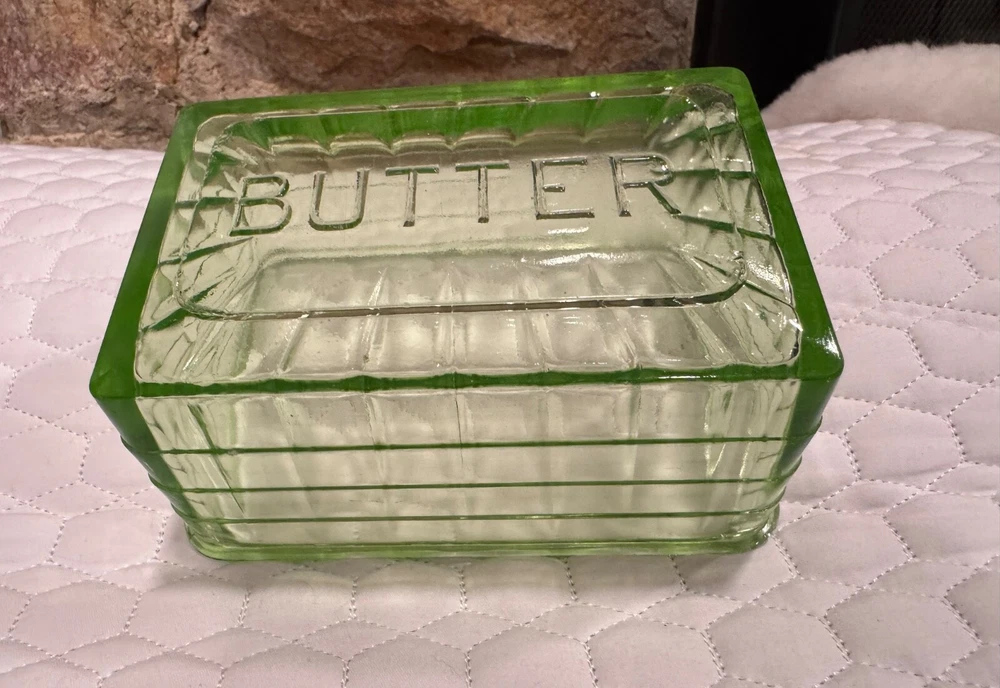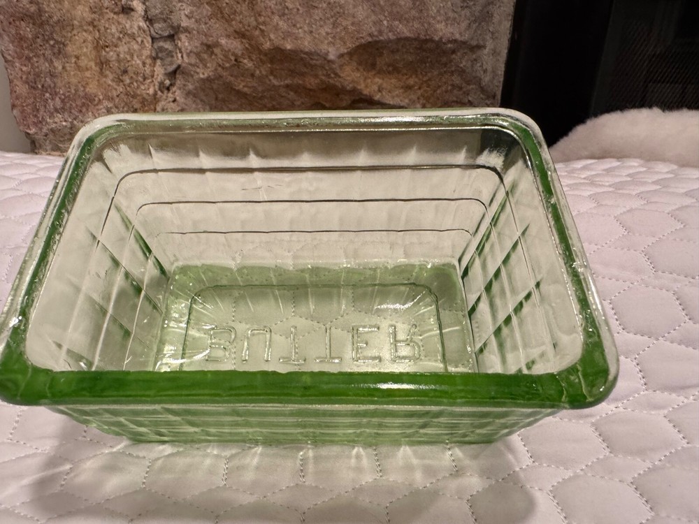 Vtg Block Optic Green Depression Vaseline Uranium Glass Cover for Butter Dish. Condition is Used. Shipped with USPS Ground Advantage.