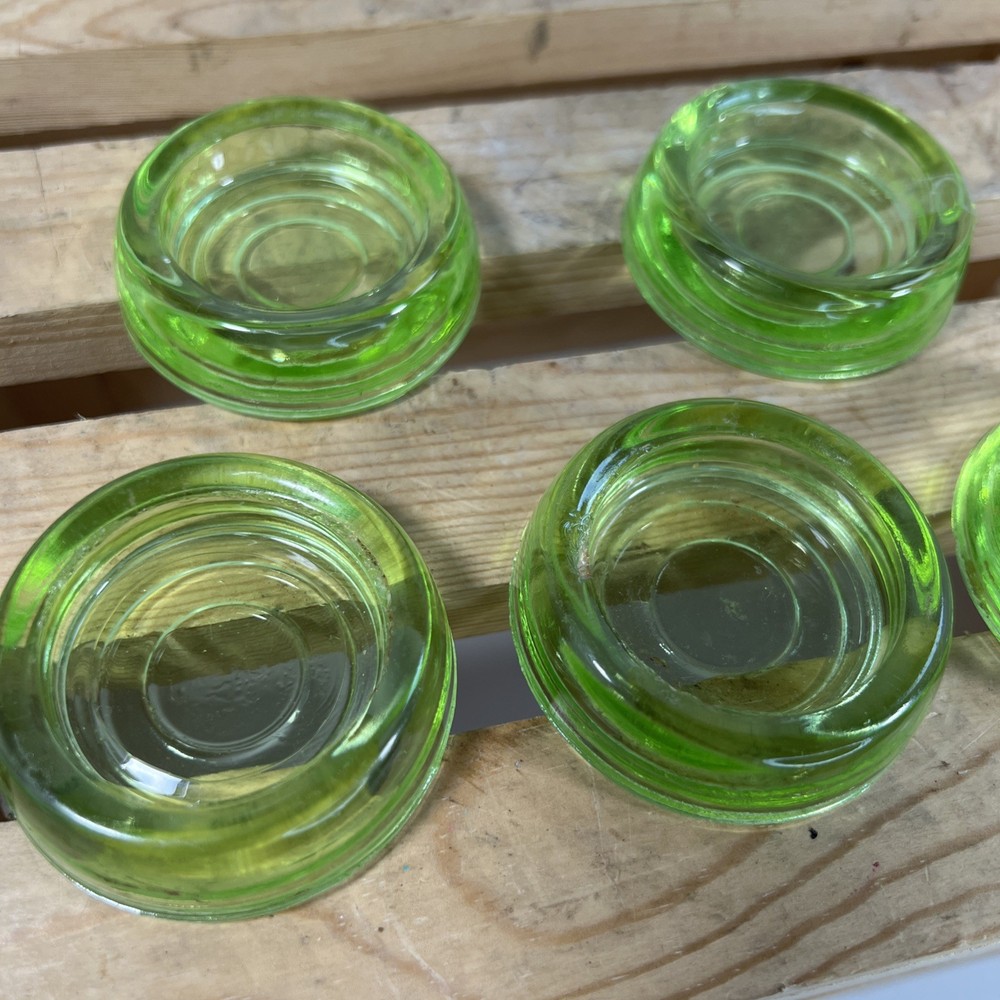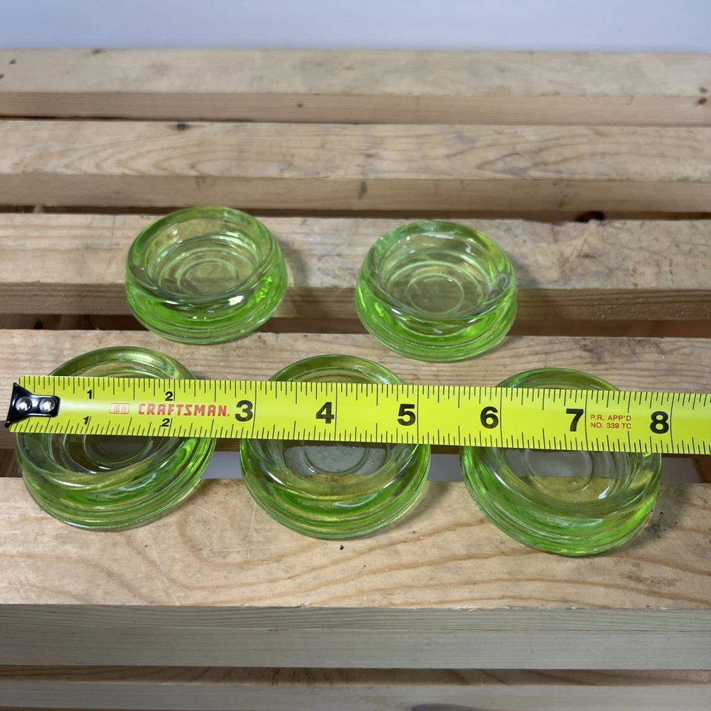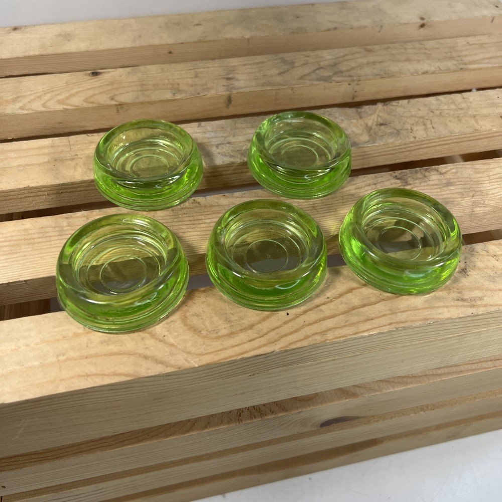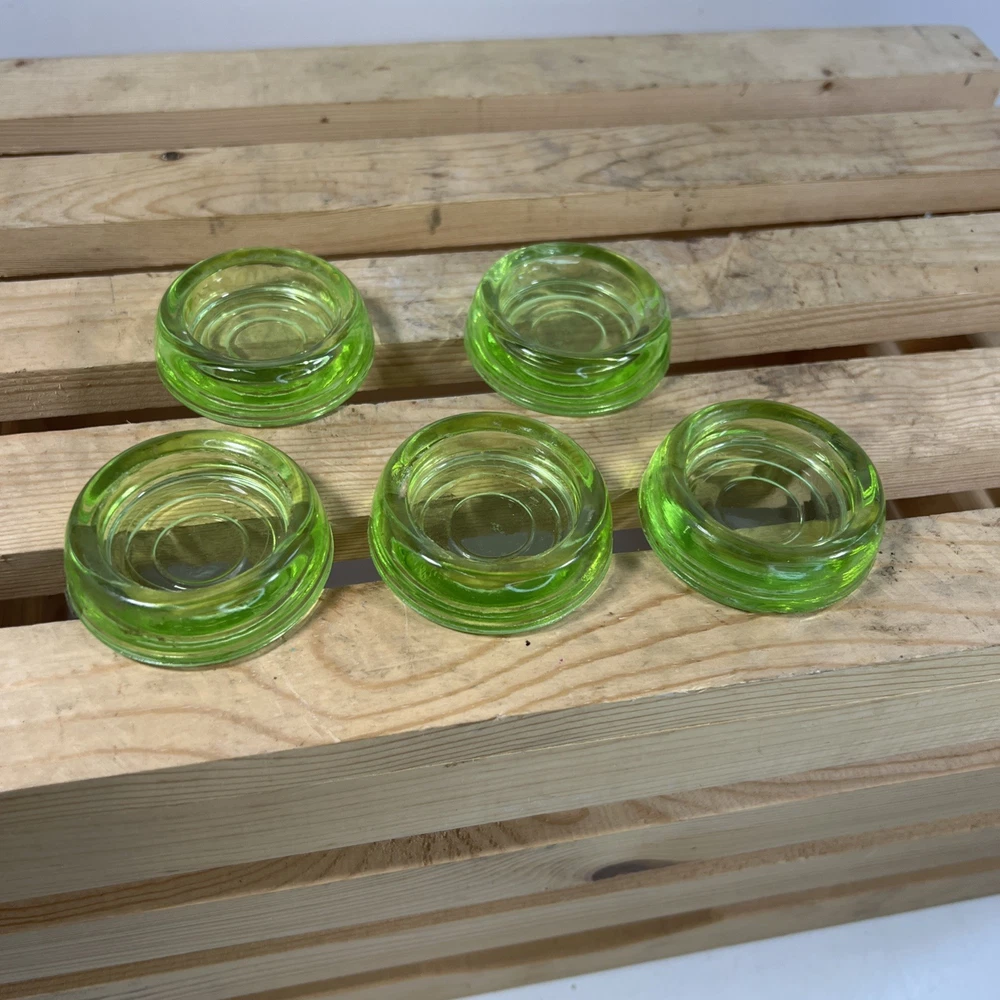 This product is a set of 5 vintage Hazel Atlas green uranium glass votive tea light candle holders. Made in the United States, these round candle holders have a unique and collectible design. The original production of these candle holders adds to their appeal as a decorative piece for any space. The vibrant green color and antique charm make these candle holders a standout addition to any collection.
