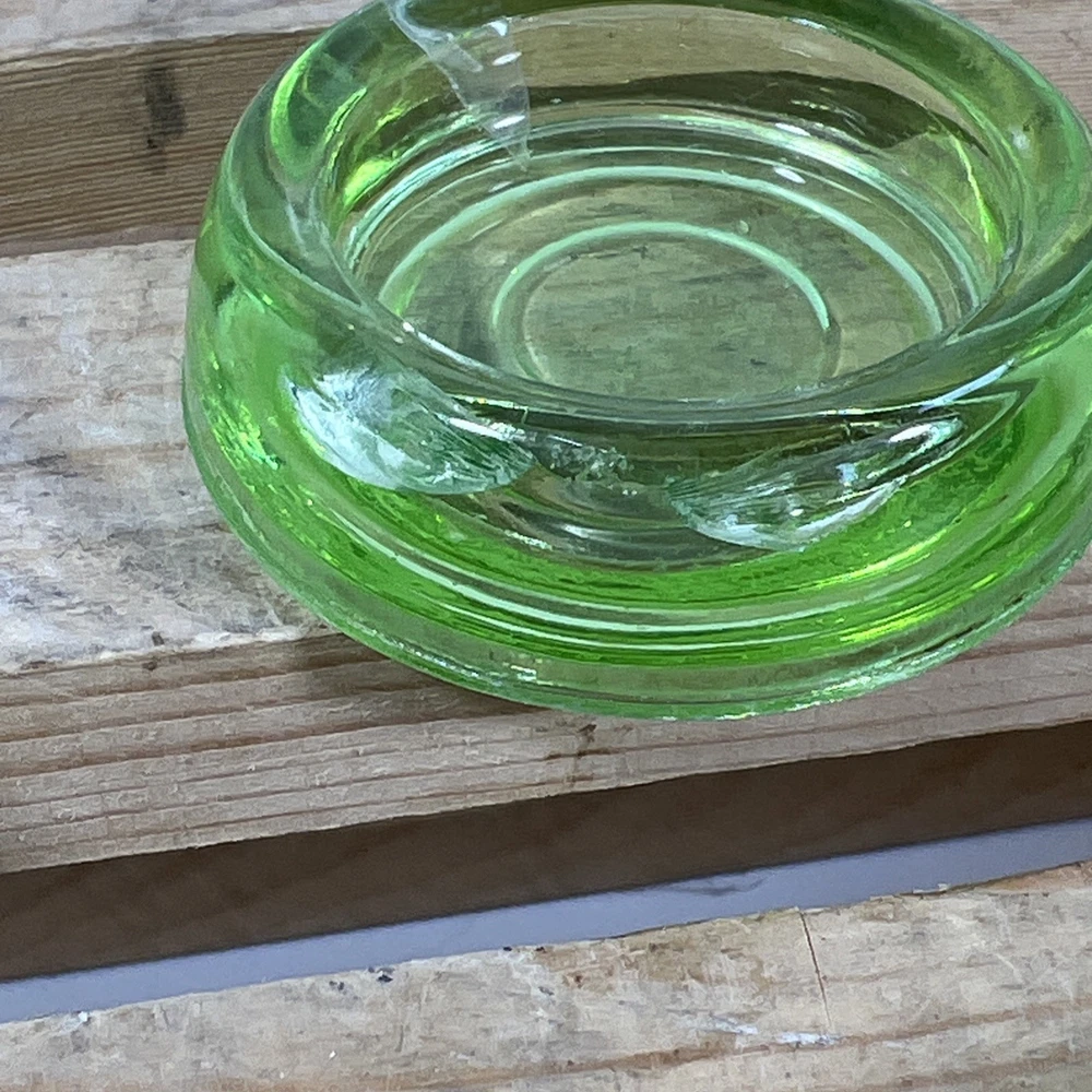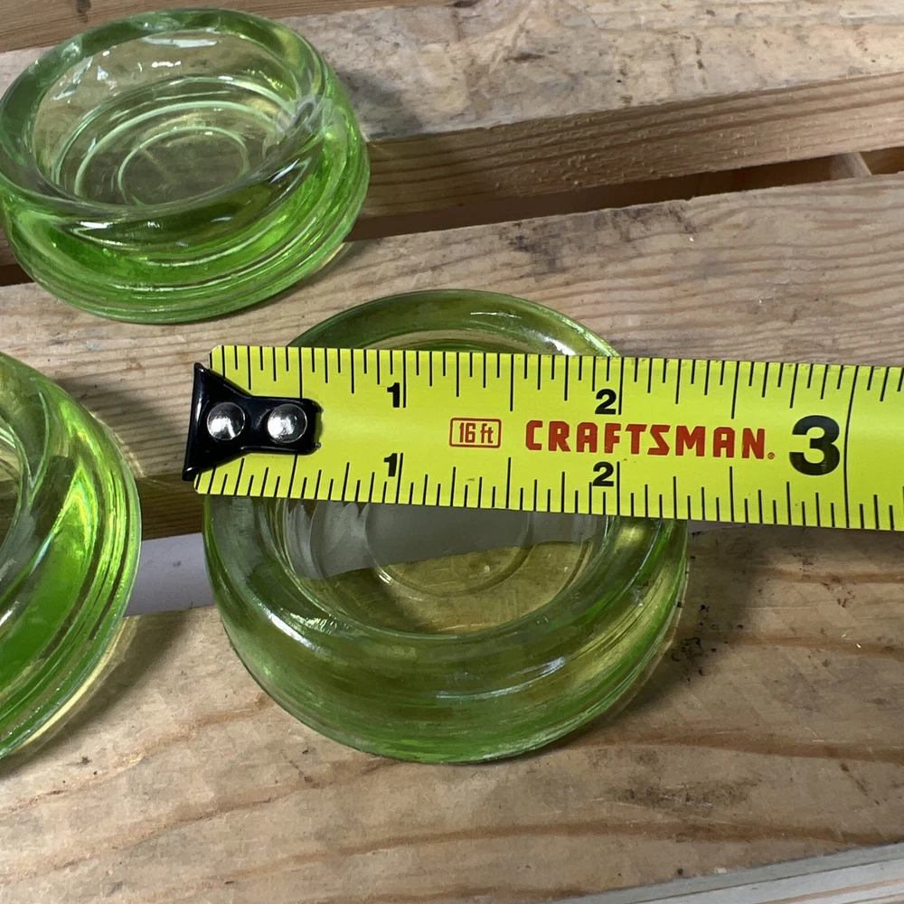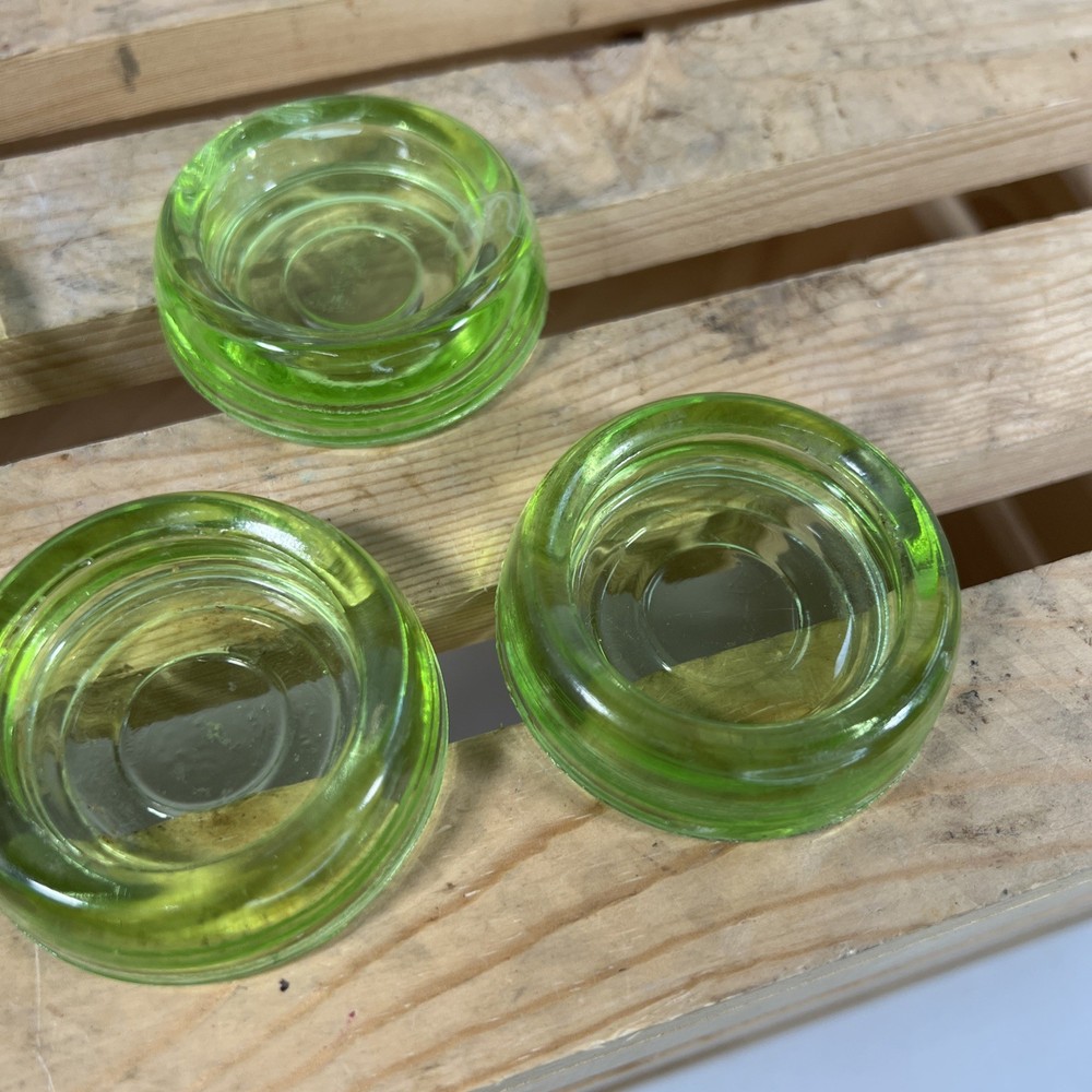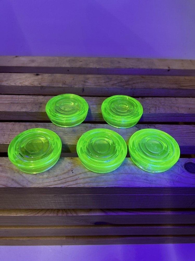 This product is a set of 5 vintage Hazel Atlas green uranium glass votive tea light candle holders. Made in the United States, these round candle holders have a unique and collectible design. The original production of these candle holders adds to their appeal as a decorative piece for any space. The vibrant green color and antique charm make these candle holders a standout addition to any collection.
