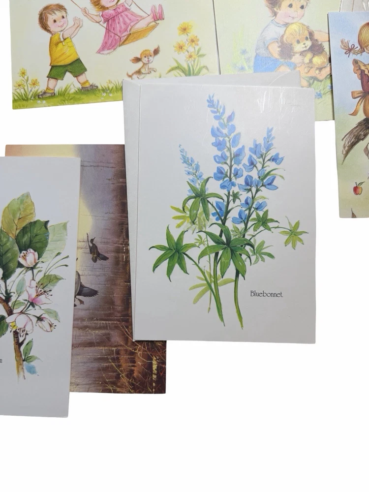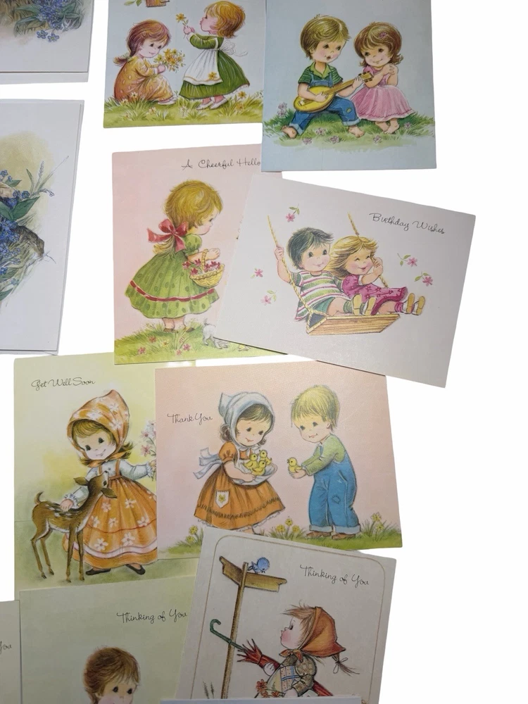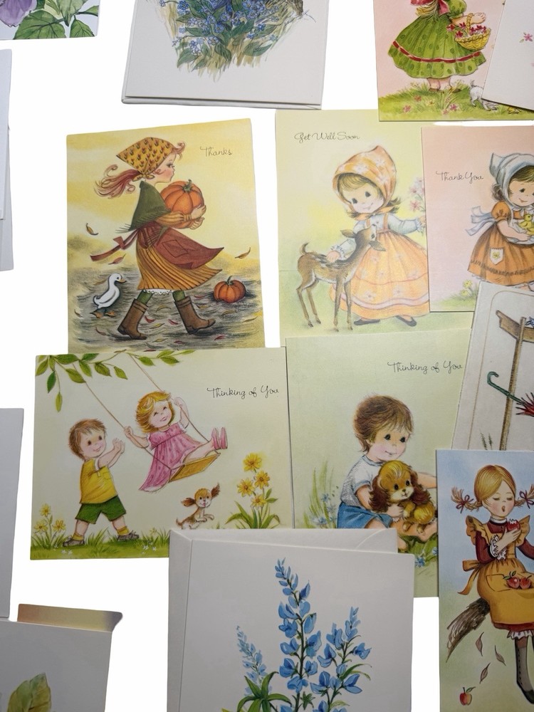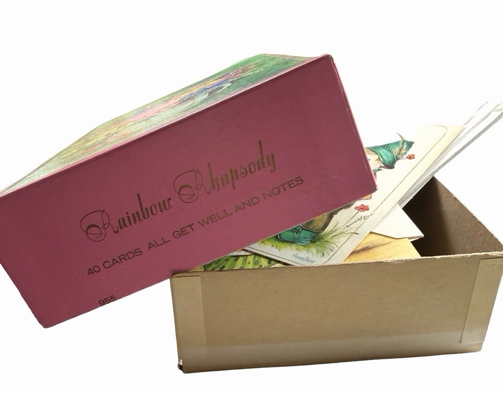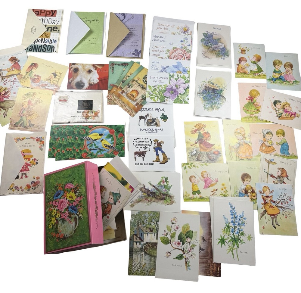 Vintage greeting card lot from an estate, featuring a variety of unused cards with charming illustrations and themes. Includes: * “Thinking of You,” “Get Well,” “Thank You,” Sympathy, and general greetings * Adorable vintage-style children illustrations * Floral, seasonal, and scenic designs * Fold-up floral stationery set * Original vintage “Rainbow Rhapsody” card box (included) Condition: * Cards are unused with no writing * Most include original envelopes * Estate find – may show light age-related wear, corner bends, or slight discoloration * Sold as-is as a mixed vintage lot Great for: * Junk journaling / scrapbooking * Crafting or ephemera collectors * Vintage paper goods collectors Please review all photos for condition and variety.