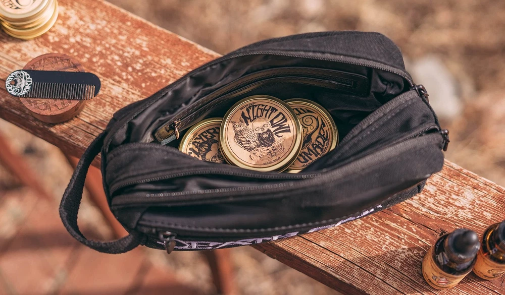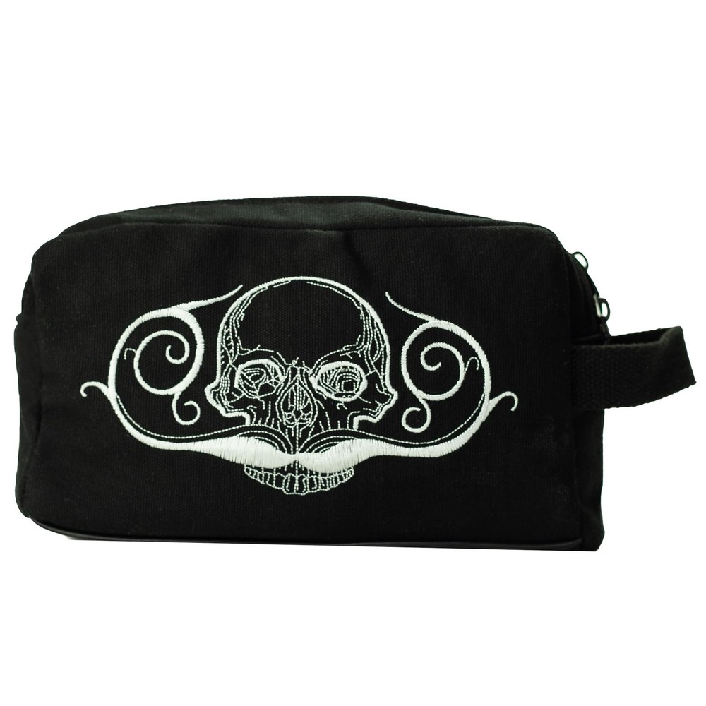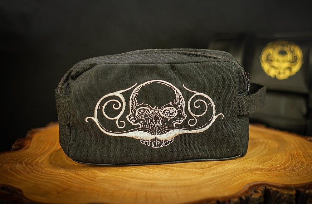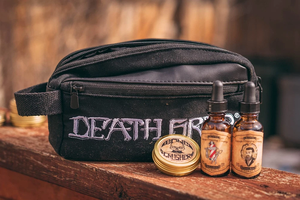 Death Grip Toiletry Men's Grooming Bag Are you tired of trying to cram all of your men's grooming essentials into a tiny toiletry bag? Look no further than the Small Death Grip Travel Bag ! This must-have Dopp Kit is perfect for all your on-the-go needs, whether you're headed on a business trip or just to the gym. Death Grip Travel Bag 10" x5" Crafted from high-quality cotton canvas, vegan leather, and polyester lining, this bag is built to last. And with a collapsible design that measures 10" long x 5" high and 2” wide, it's easy to fit into your backpack or suitcase. You won't have to worry about your mustache wax, beard balm, razors, beard oil, mustache comb, beard comb, shave soap, shave oil, shaving cream, scissors, trimmers, hair pomade, hair gel, mousse, or any other similar hair styling products getting lost or damaged while you're on the go. Death Grip Small Pocket Interior Kit The spacious interior features a large pocket, a smaller pocket with an interior zippered compartment, and an exterior pocket for easy access to your essentials. And with the Death Grip Skull logo on one side and "Death Grip" on the other, this bag is as stylish as it is practical. The bag's handle makes it easy to carry, so you can take your Death Grip products with you wherever you go. The Small Death Grip Travel Bag is the perfect solution for keeping all of your must-have grooming products organized and in one place. And with the convenience of being able to take it with you wherever you go, you'll never have to worry about forgetting something essential again. Whether you're a fan of handlebar mustache wax or just need a reliable place to store your hair styling products, this bag has got you covered. Order your Small Death Grip Travel Bag today and experience the convenience of having all your men's grooming essentials in one stylish and practical place! Keeps all of your men's grooming essentials organized in one place, including mustache wax, beard balm, razors, beard oil, mustache comb, beard comb, shave soap, shave oil, shaving cream, scissors, trimmers, hair pomade, hair gel, mousse, and other similar hair styling products. Made from high-quality cotton canvas, vegan leather, and polyester lining, this bag is built to last and will protect your essentials while you're on the go. Features a collapsible design that measures 10" long x 5" high and 2” wide, making it easy to fit into your backpack or suitcase. Comes with a spacious interior featuring a large pocket, a smaller pocket with an interior zippered compartment, and an exterior pocket for easy access to your essentials. The Death Grip Skull logo on one side and "Death Grip" on the other make this bag as stylish as it is practical, and the bag's handle makes it easy to carry with you wherever you go.