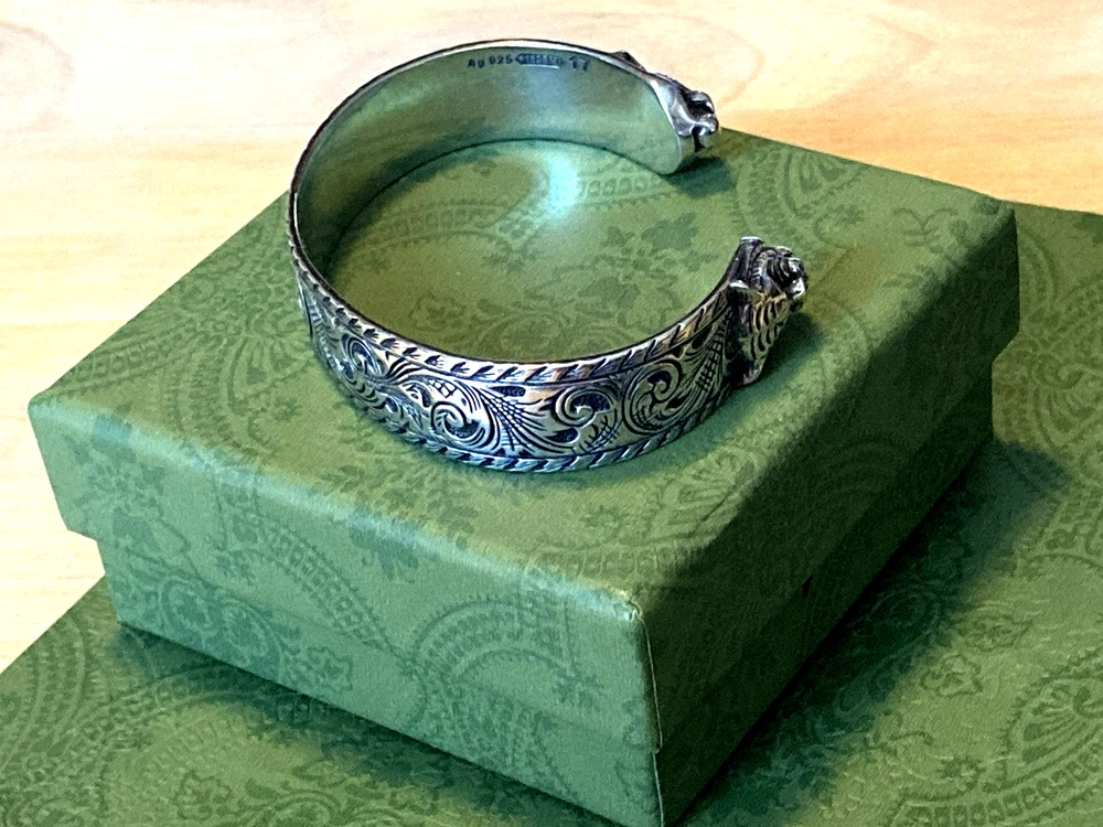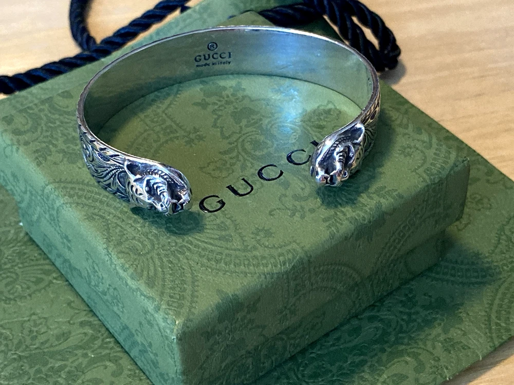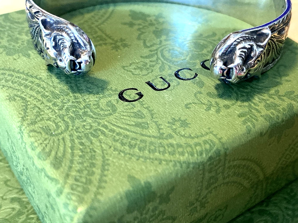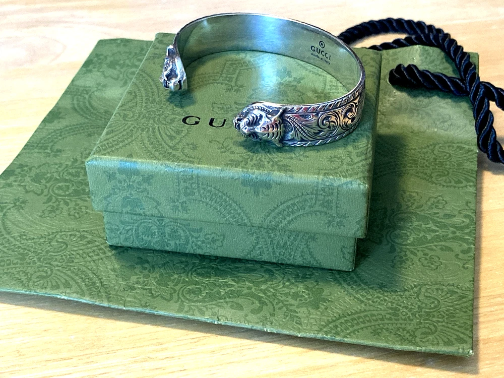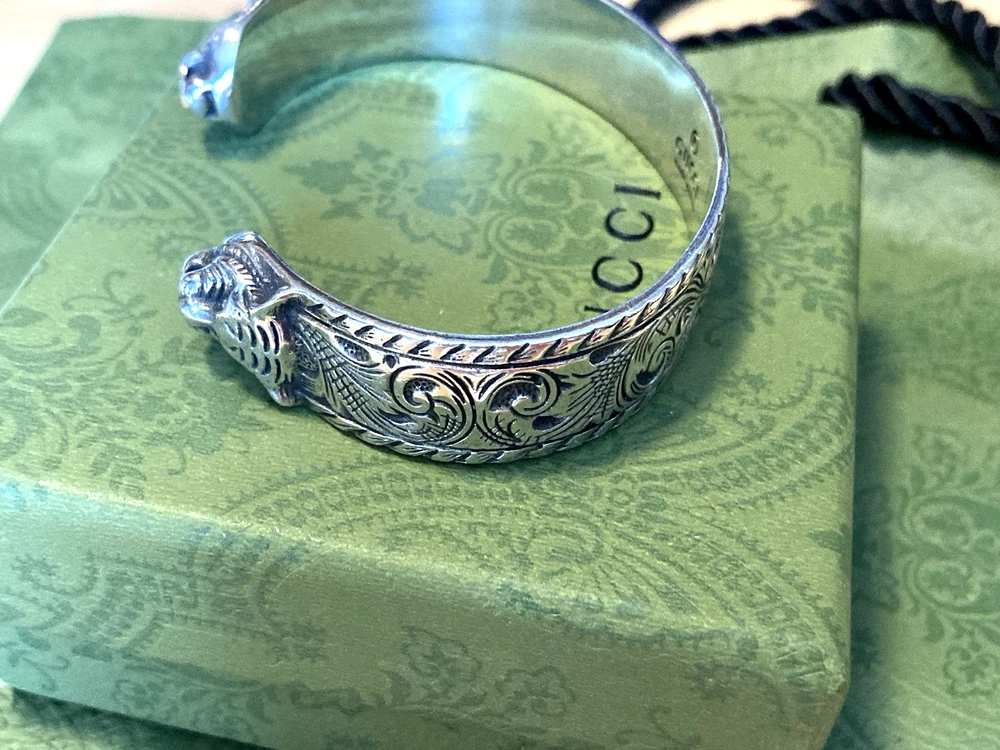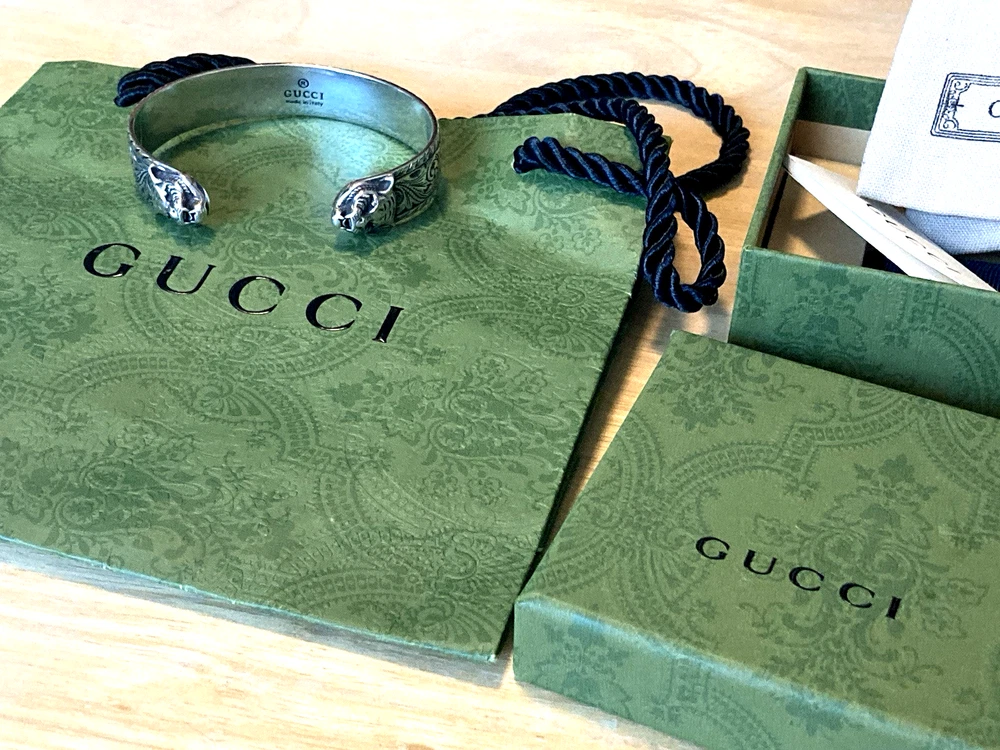 Here is an authentic Gucci Sterling Silver Feline Head Open Bangle Bracelet. Includes original box, pouch, ribbon & booklet. My mom purchased it years ago, and I don't think she ever wore it much (very good condition). Marked size 17 (cm). Weighs 41.1 grams. About 1/2" width. From Gucci, this Cat Head open bangle bracelet speaks to the animal theme that is now synonymous with the House. Crafted in aged 925 sterling silver, this open bangle bracelet features two facing cat heads and is embellished with scrollwork. I do offer a combined shipping discount (message me for details). I only offer shipping within the United States- no international bidders please.