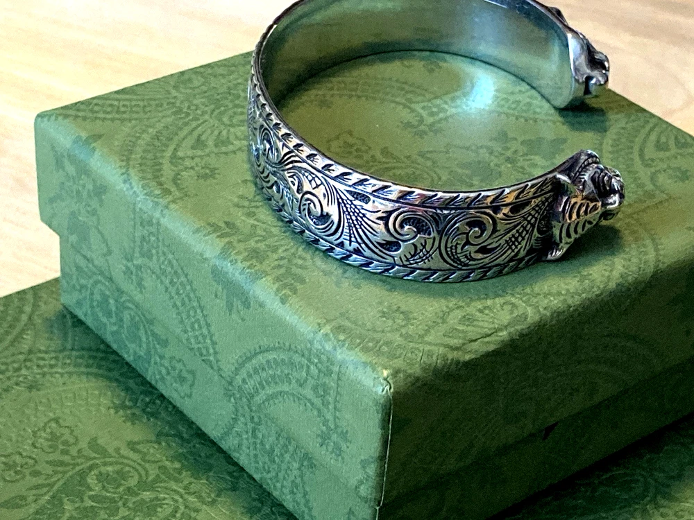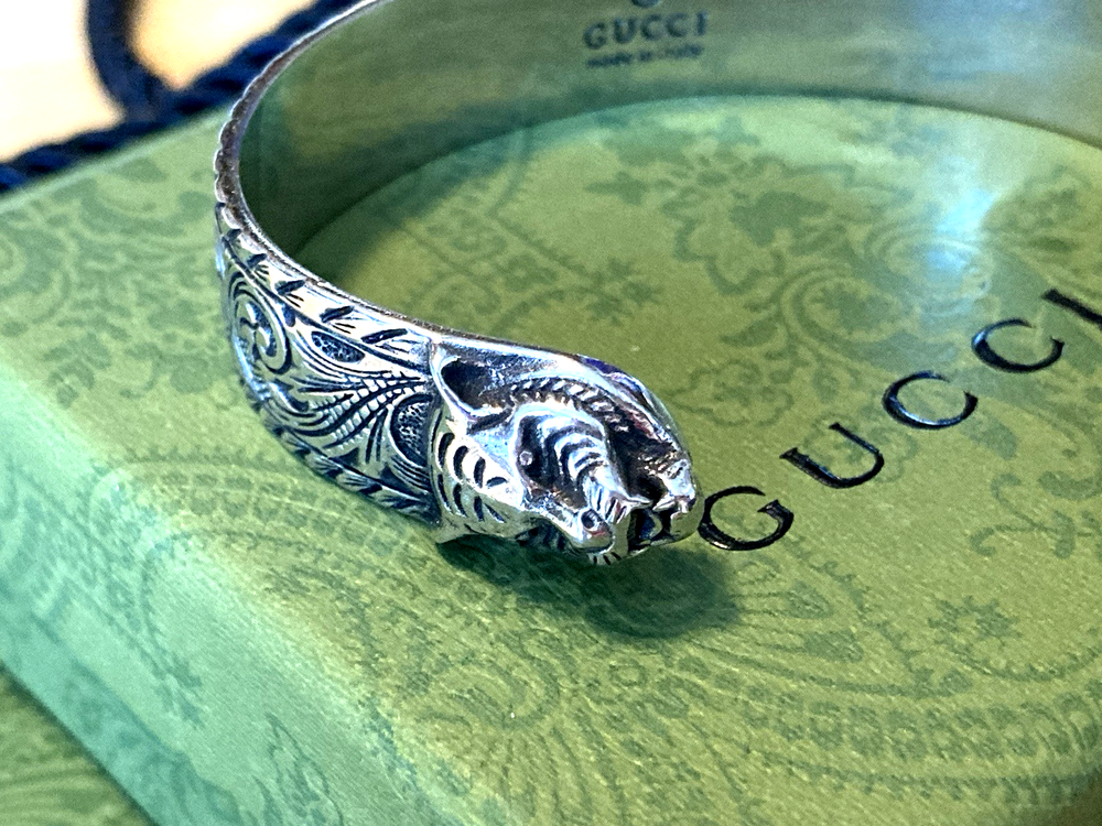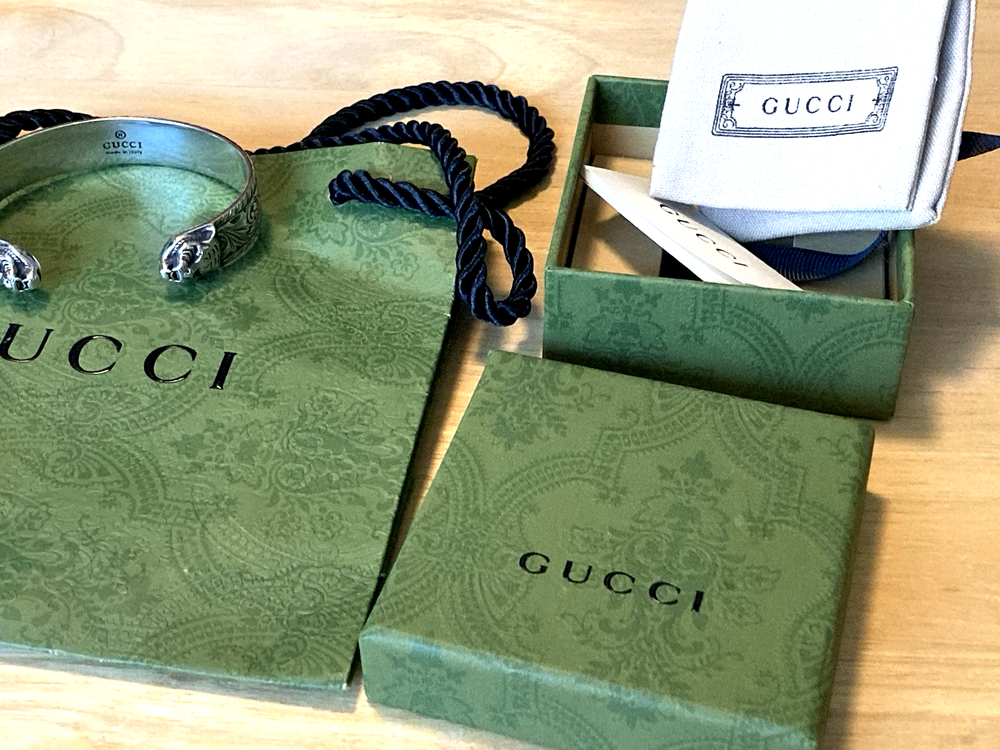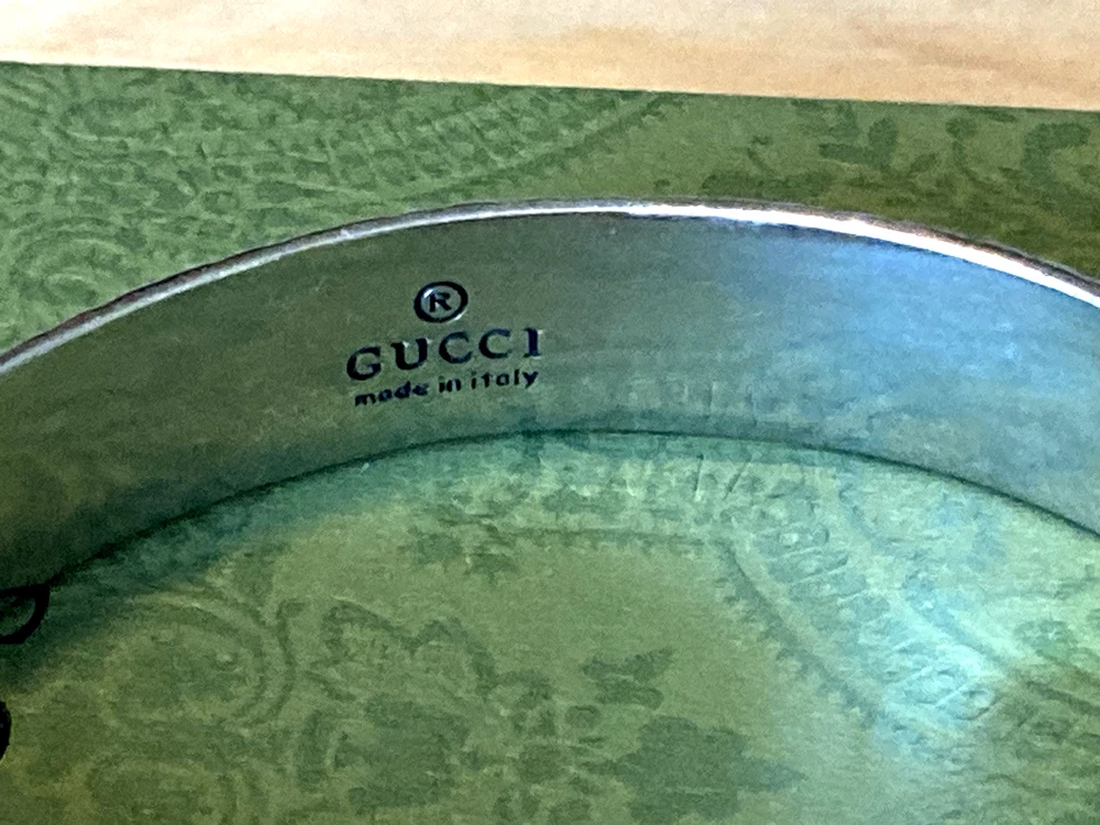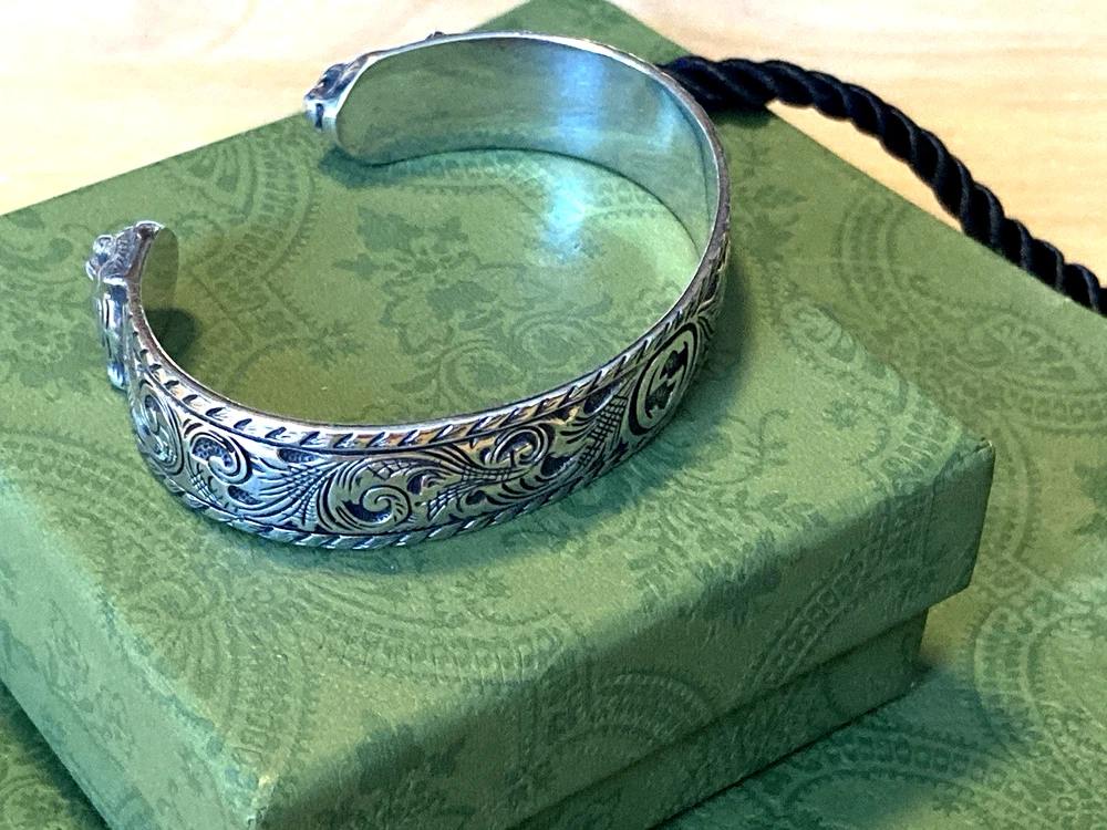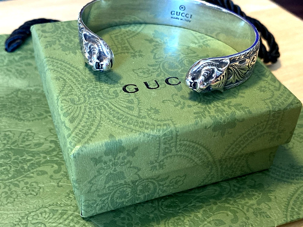 Here is an authentic Gucci Sterling Silver Feline Head Open Bangle Bracelet. Includes original box, pouch, ribbon & booklet. My mom purchased it years ago, and I don't think she ever wore it much (very good condition). Marked size 17 (cm). Weighs 41.1 grams. About 1/2" width. From Gucci, this Cat Head open bangle bracelet speaks to the animal theme that is now synonymous with the House. Crafted in aged 925 sterling silver, this open bangle bracelet features two facing cat heads and is embellished with scrollwork. I do offer a combined shipping discount (message me for details). I only offer shipping within the United States- no international bidders please.