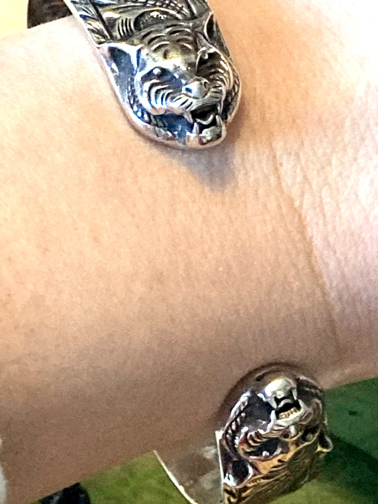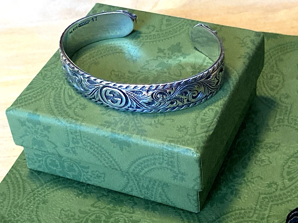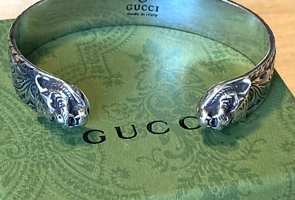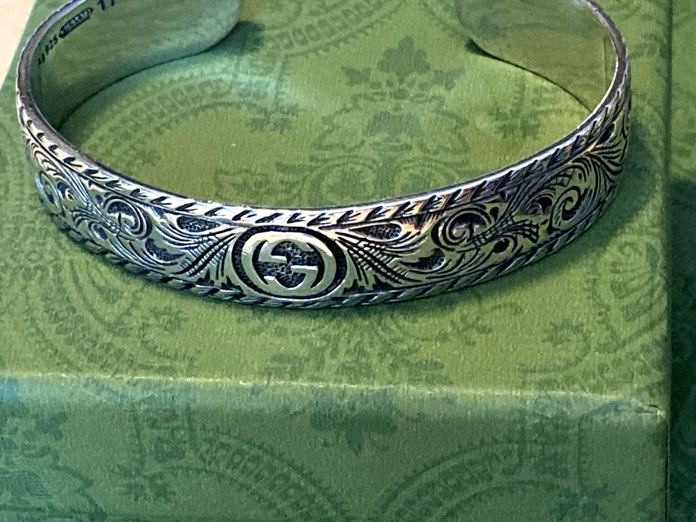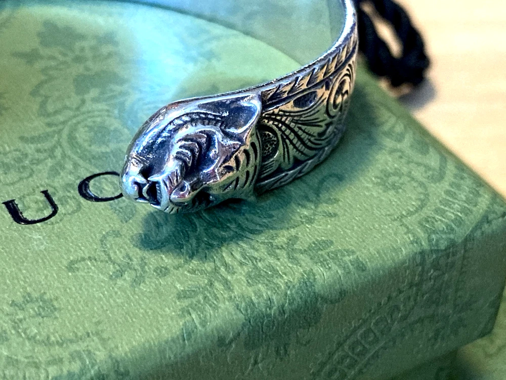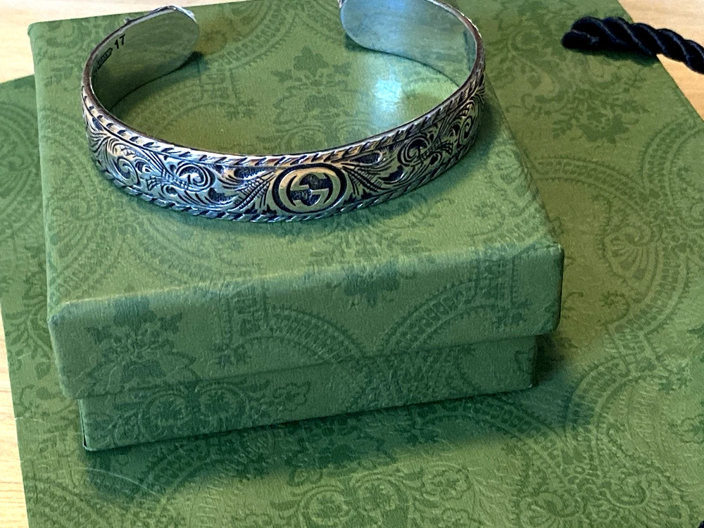 Here is an authentic Gucci Sterling Silver Feline Head Open Bangle Bracelet. Includes original box, pouch, ribbon & booklet. My mom purchased it years ago, and I don't think she ever wore it much (very good condition). Marked size 17 (cm). Weighs 41.1 grams. About 1/2" width. From Gucci, this Cat Head open bangle bracelet speaks to the animal theme that is now synonymous with the House. Crafted in aged 925 sterling silver, this open bangle bracelet features two facing cat heads and is embellished with scrollwork. I do offer a combined shipping discount (message me for details). I only offer shipping within the United States- no international bidders please.