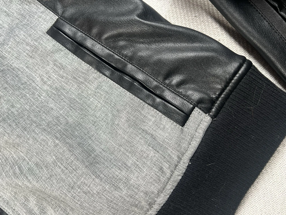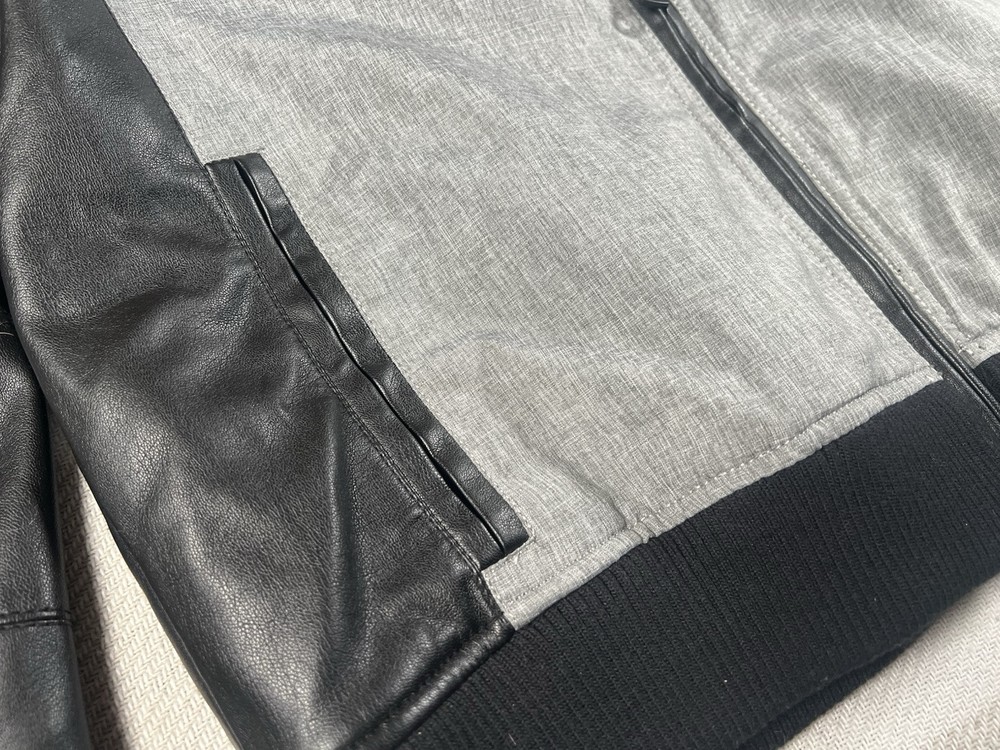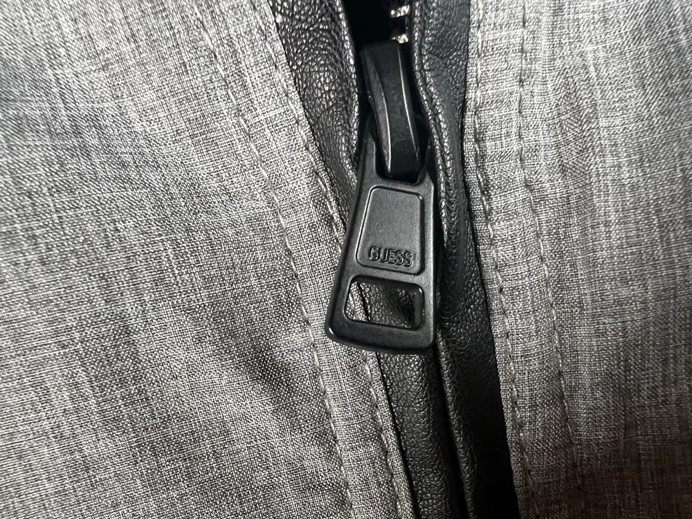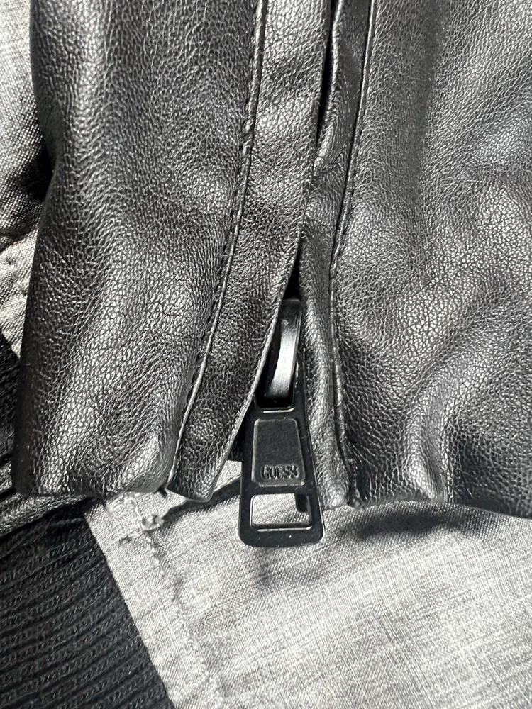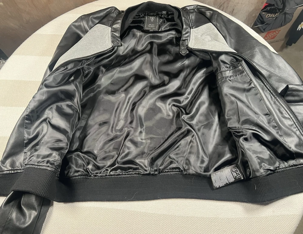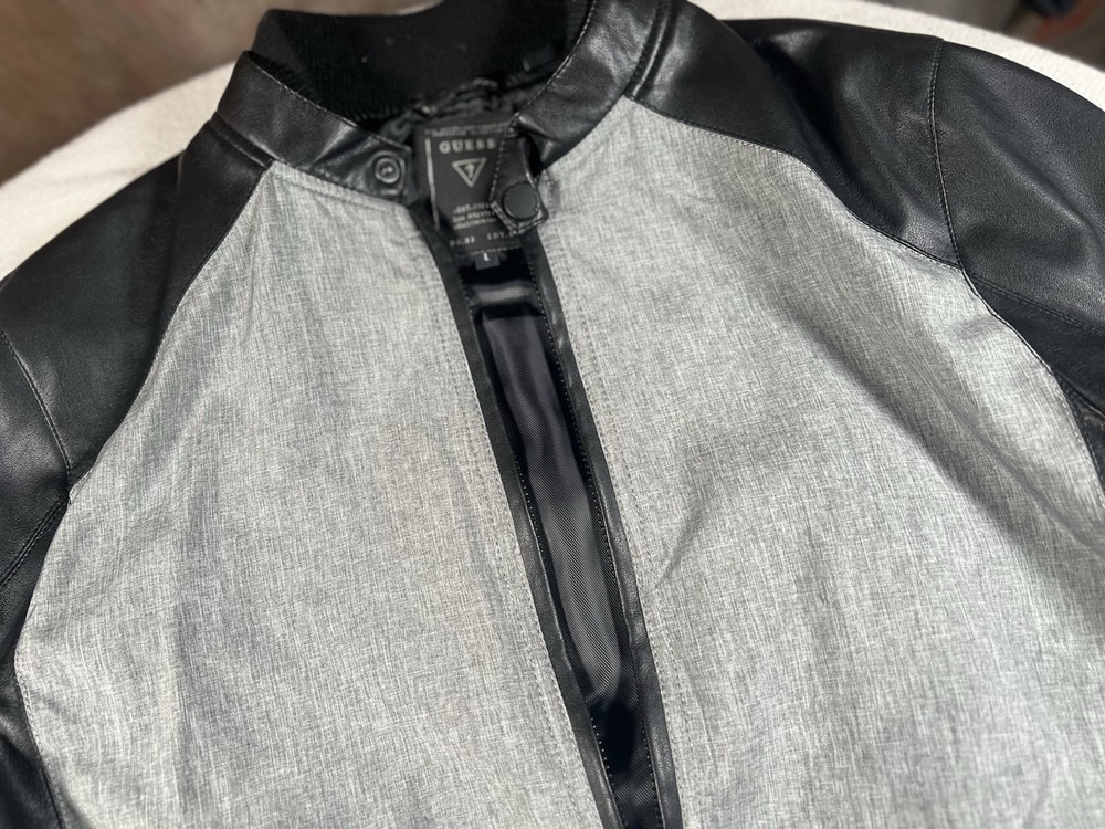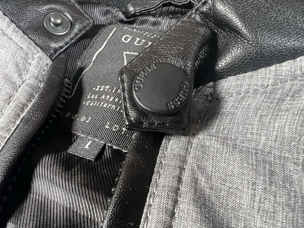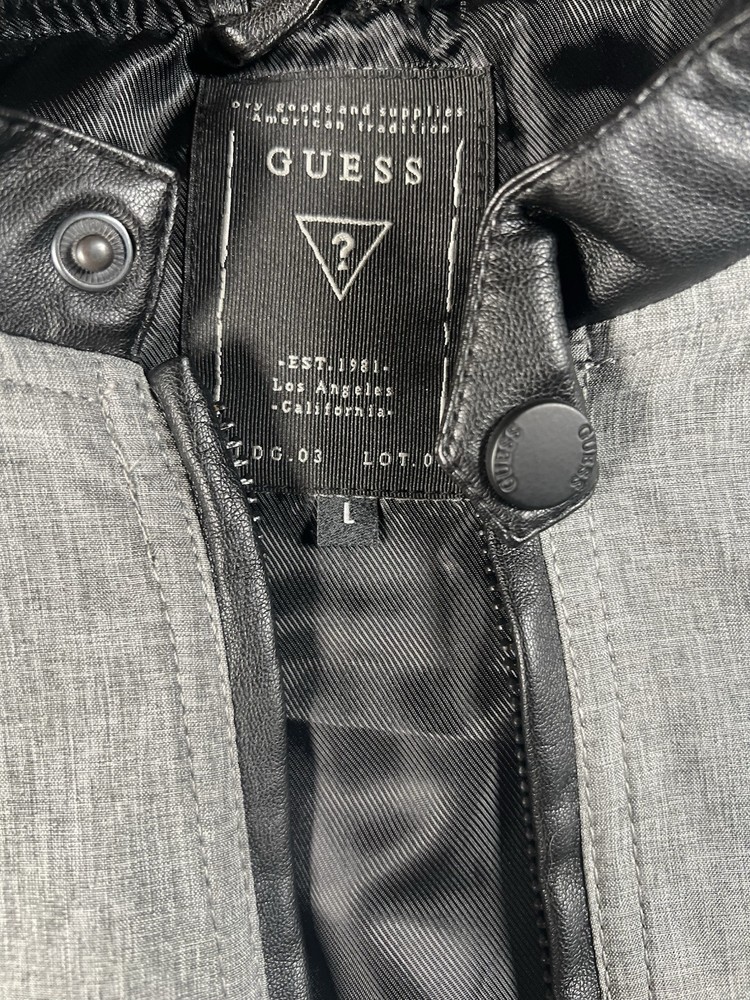This Guess Los Angeles men's jacket is a size large with a bomber style, featuring a nylon arms/back and cotton blend body in a black/gray color. The jacket has a solid pattern, zip closure, and retro theme, making it suitable for various occasions like travel, parties, or casual wear. It has a regular fit, full zip, and pockets, ideal for both winter and transitional seasons. The machine-washable jacket is not vintage and bears the Guess brand logo, making it a stylish and versatile addition to any wardrobe.