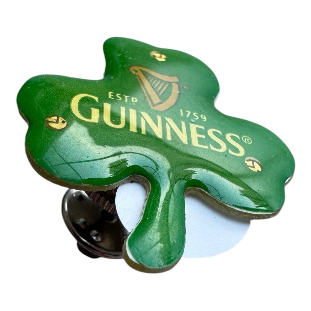 Celebrate your Irish pride or love for Guinness with this vintage Guinness shamrock pin! This green enamel lapel pin features the classic Guinness harp logo and “ESTD 1759” across a vibrant shamrock shape. A fun collector’s item for fans of the iconic Irish beer or St. Patrick’s Day memorabilia. Details: • Size: Approximately 1 inch • Design: Shamrock with Guinness harp logo and branding • Color: Green with gold and cream accents • Backing: Butterfly clutch • Condition: Pre-owned with noticeable surface wear/scratches (see photos)