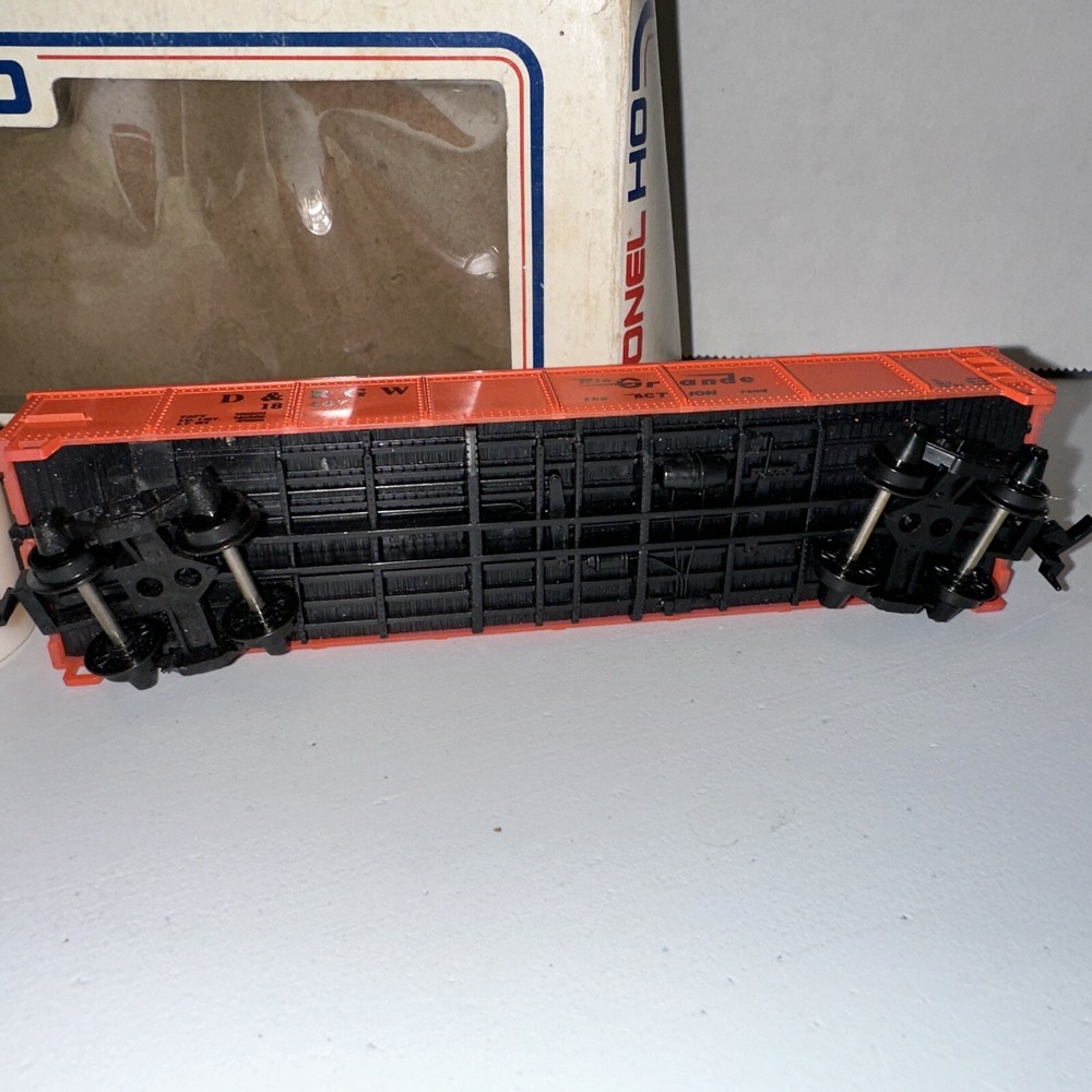 This is a vintage HO scale Lionel open gondola model train car featuring the corporate roadname "Rio Grande" and a steel construction. It includes a load and is designed in a multicolor scheme. The control system is analog, and it is part of the Rio Grande franchise. This HO scale model is a two-rail system with a plastic material construction, suitable for collectors aged 17 years and up.