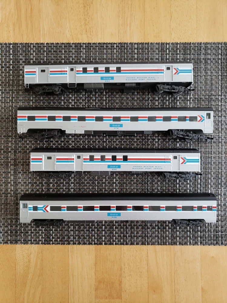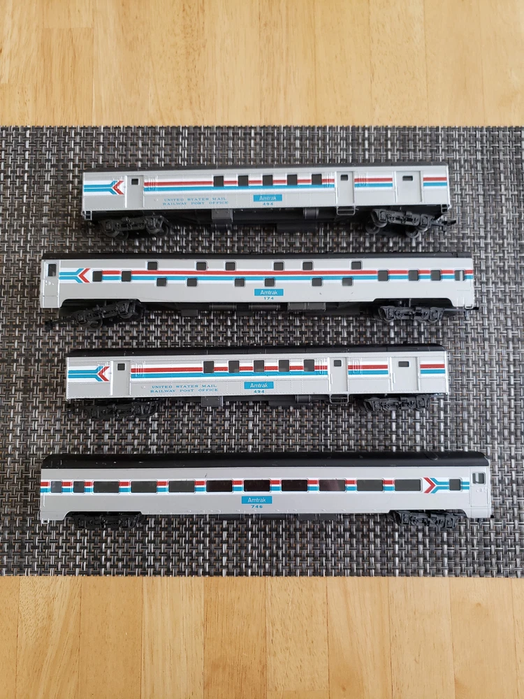 Here i have a set of 4 Amtrak passenger coaches for you made by Rivarossi. These are doubles of a set i already have. There in good condition with only a few scratches and scuffs from handling. One of the passenger coaches has a broken coupler. Overall its a nice little set. NO lighted interior sadly. This is a AS-IS sale, No returns. i do not offer any guarantees or warranties beyond eBay policy. I will always use combined shipping discount on multiple items. Please ask questions and inquire further photos, if necessary, before you place a bid on my items thank you.