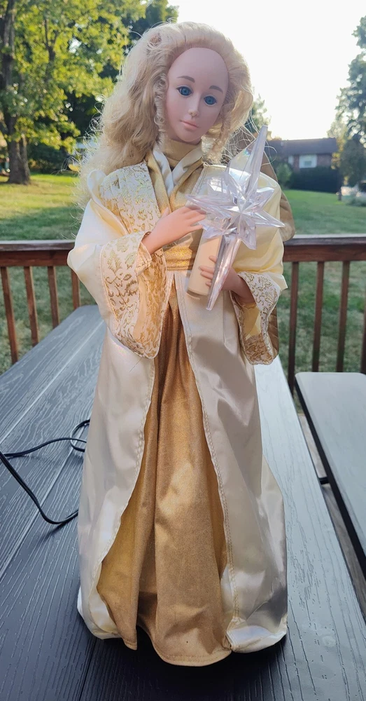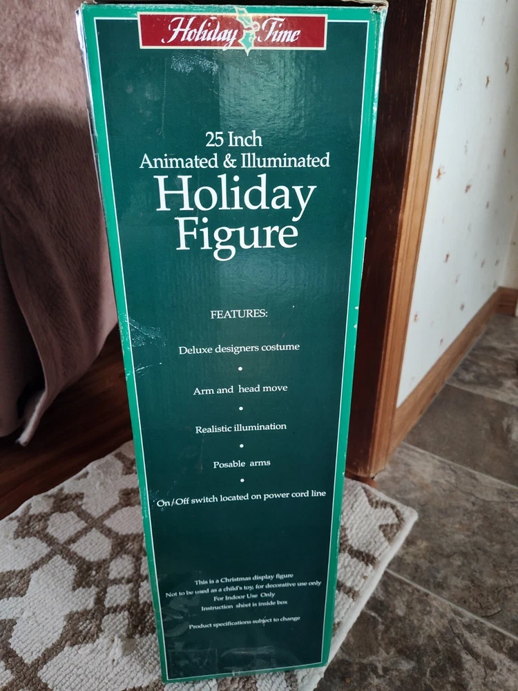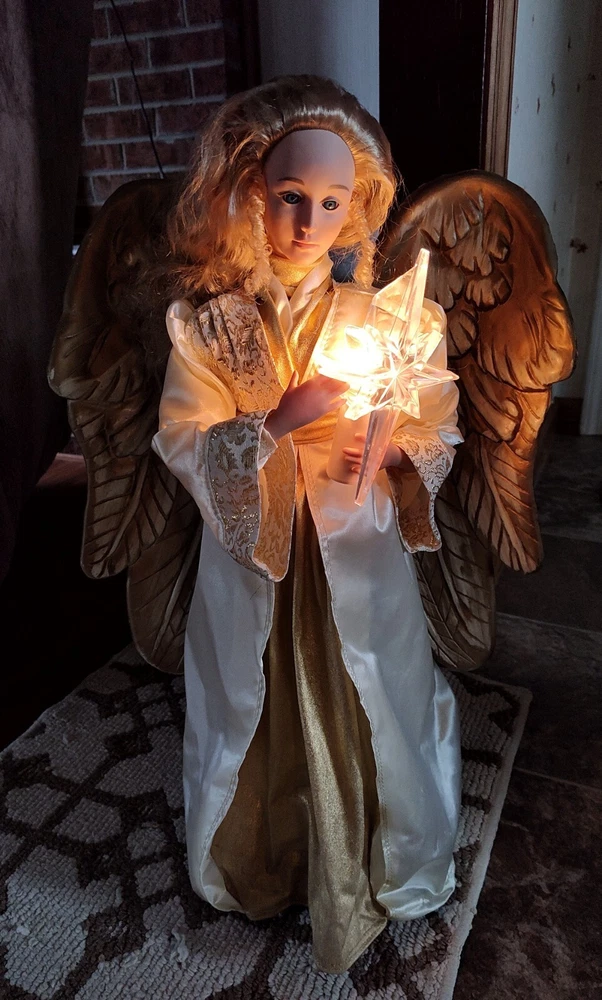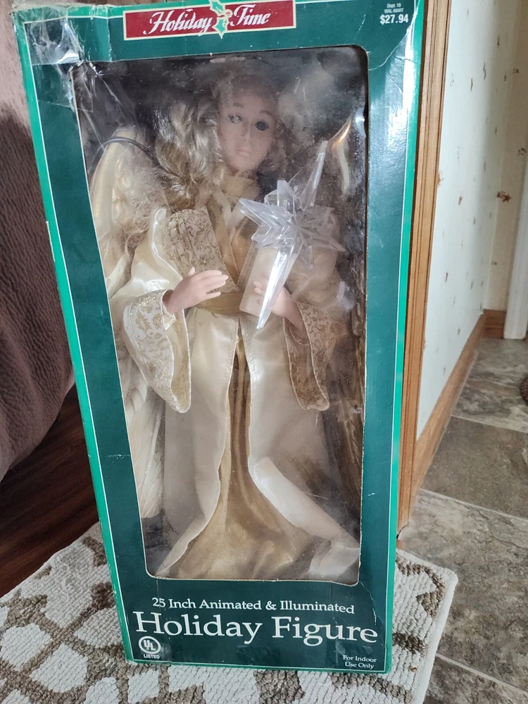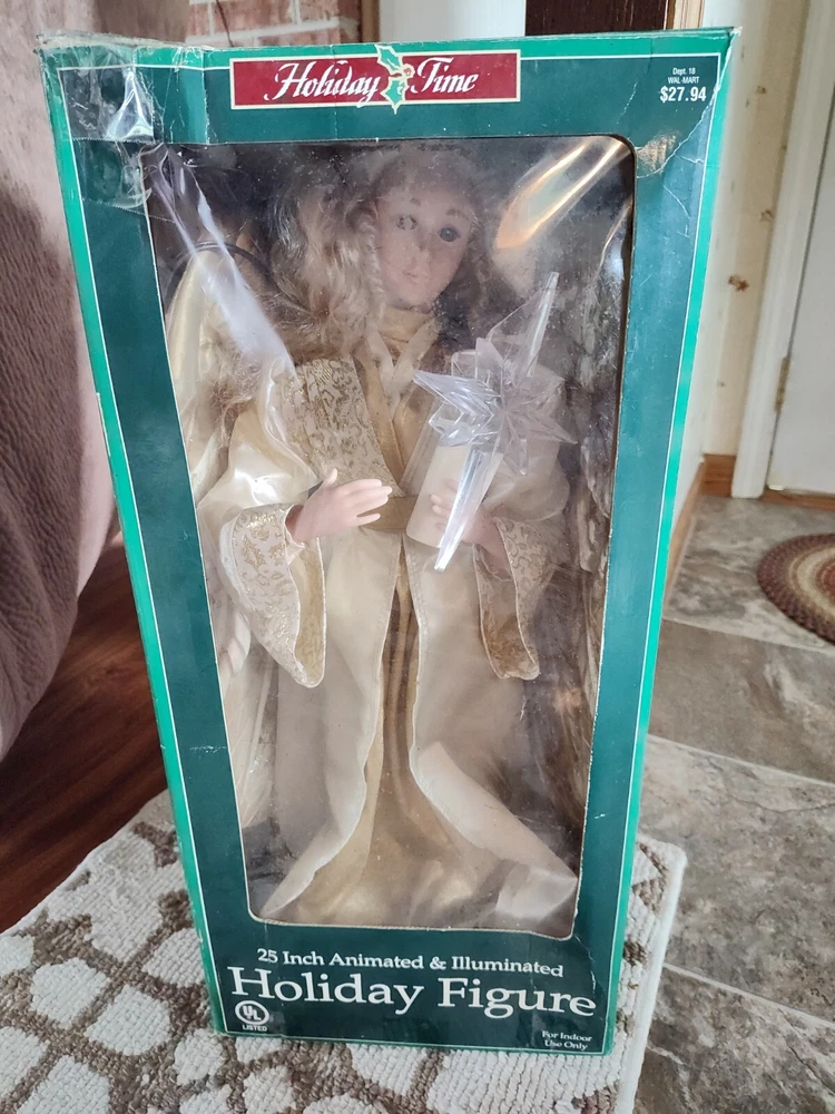 Celebrate the holiday season with this beautiful vintage HOLIDAY TIME Angel Figure. Measuring 25 inches tall and weighing 4 lbs, this corded motionette is perfect for indoor use only. The multicolor angel is designed with intricate details and features animated posable arms and illumination for a stunning visual effect. The angel is part of the Holiday Creations collection and is a great addition to any Christmas decor. The item is a single pack and comes with care instructions. The piece is perfect for collectors who are looking for unique and animated holiday decorations. Add a touch of Christmas animation to your home with this beautiful angel figure. Comes in the Original Box but, Box is Damaged. Indoor Use Only. Smoke Free Home. On/Off Switch is on the power cord.