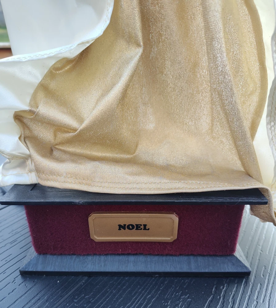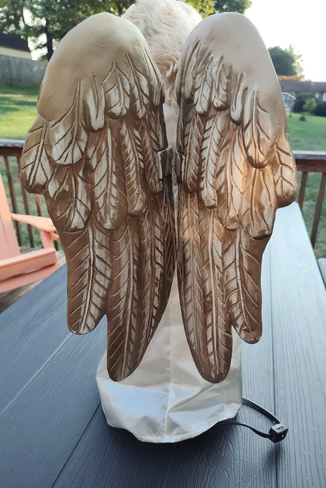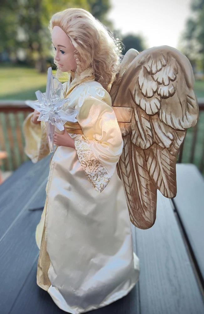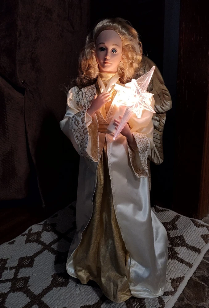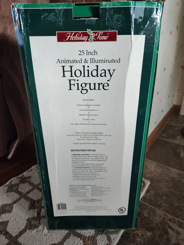 Celebrate the holiday season with this beautiful vintage HOLIDAY TIME Angel Figure. Measuring 25 inches tall and weighing 4 lbs, this corded motionette is perfect for indoor use only. The multicolor angel is designed with intricate details and features animated posable arms and illumination for a stunning visual effect. The angel is part of the Holiday Creations collection and is a great addition to any Christmas decor. The item is a single pack and comes with care instructions. The piece is perfect for collectors who are looking for unique and animated holiday decorations. Add a touch of Christmas animation to your home with this beautiful angel figure. Comes in the Original Box but, Box is Damaged. Indoor Use Only. Smoke Free Home. On/Off Switch is on the power cord.